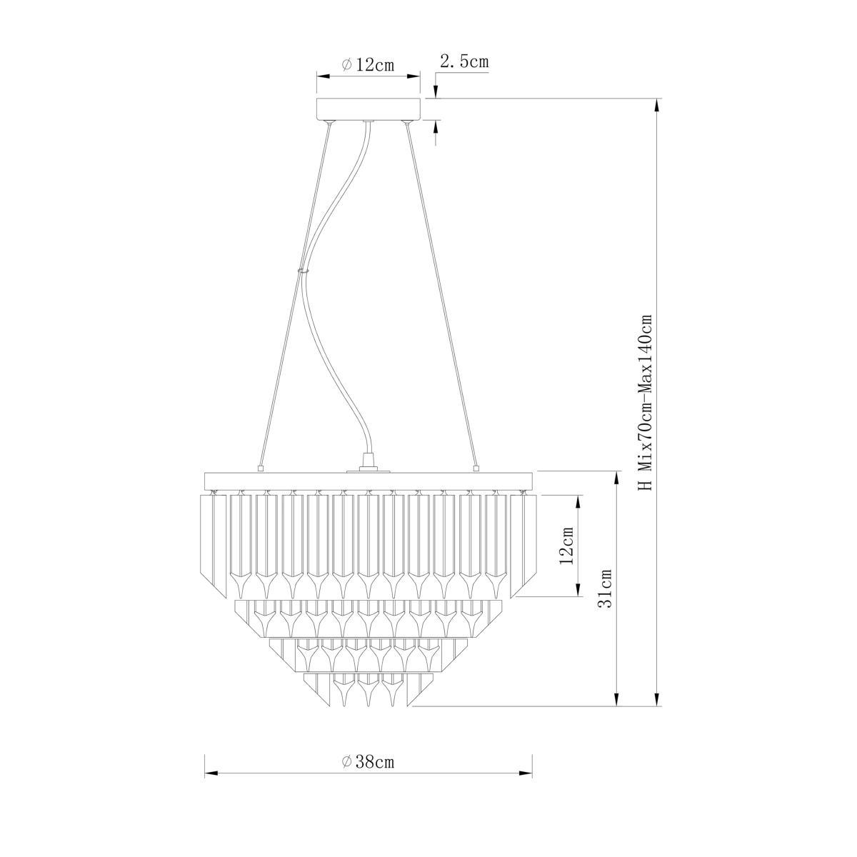 We've designed this modern chandelier with faceted glass droplets suspended from a satin chrome ring. Its classic, tiered formation enhances a warm glow of light and the chain is height adjustable for easy installation in your space.