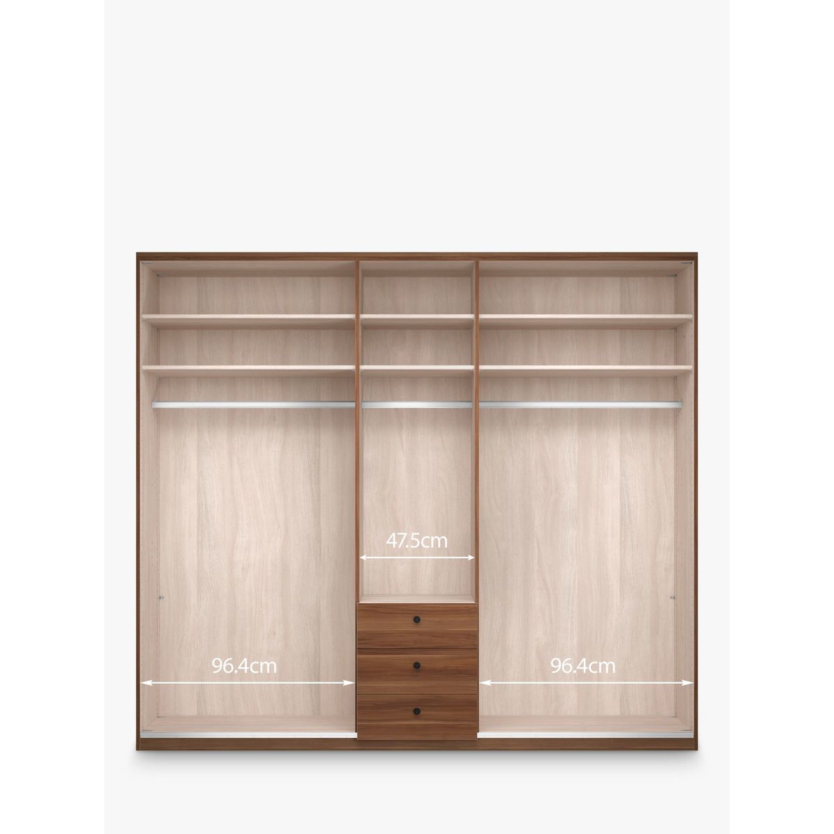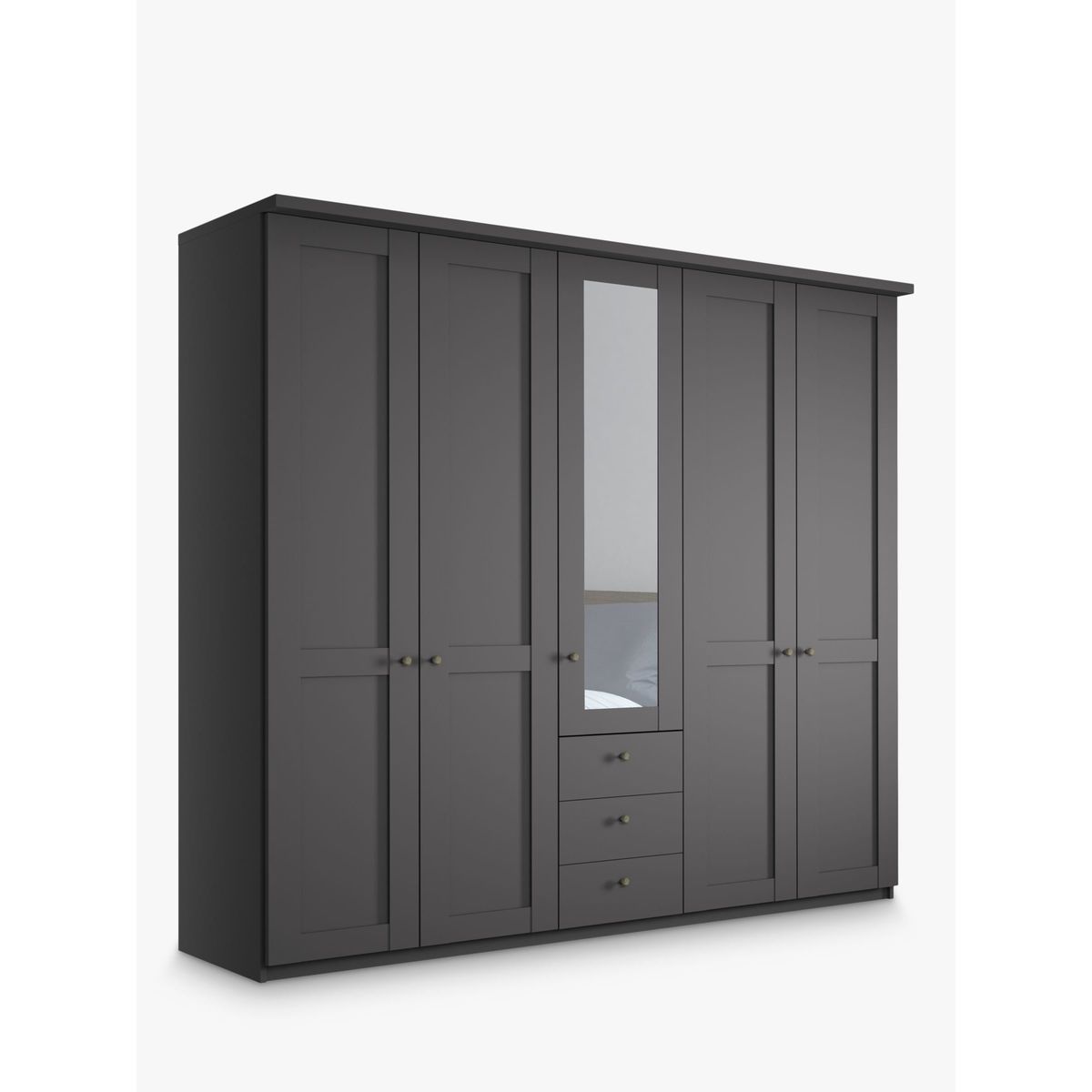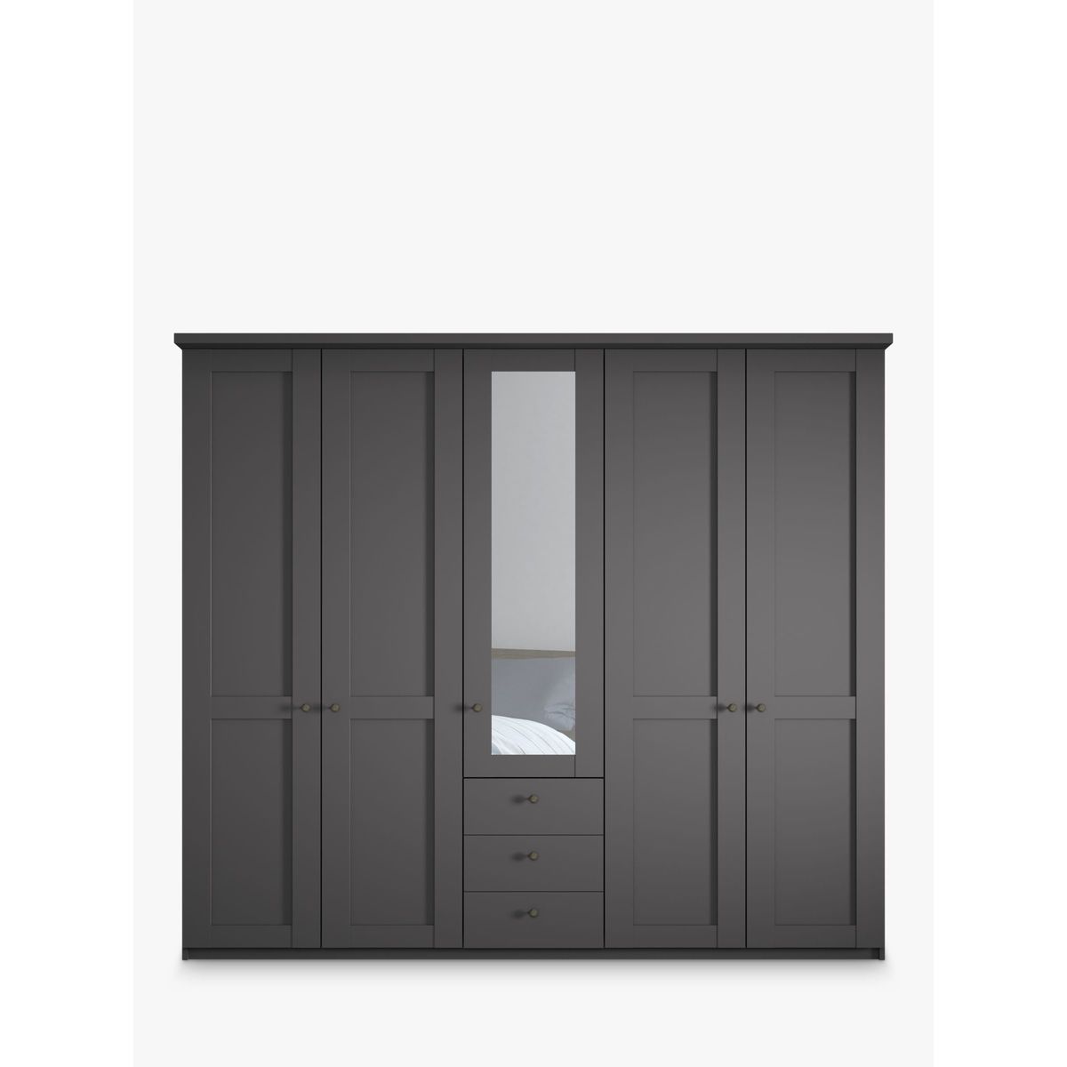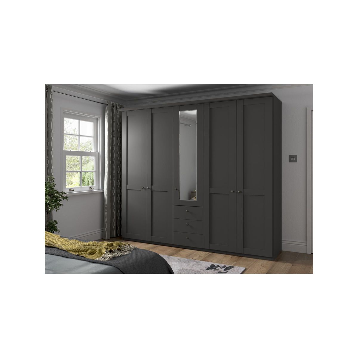 The elegant and classic look of our Marlow range suits most decor. Versatile and practical as a bedroom storage solution, the range is available in a choice of matt finishes: White, Pebble Grey and Graphite, and either with or without mirrors. The exterior is complemented with an attractive cornice detail at the top and hinged doors with handles in a pewter finish. This five-door wardrobe has three drawers below the mirrored middle door. The interior has two double compartments either side of a single compartment. Each compartment is completed with two shelves and a hanging rail, all of which are fully adjustable to suit your requirements. This product is delivered and assembled by the supplier for your convenience. Compatible extra internal and external accessories available to purchase separately: Additional shelves - widths 47.5cm and 96.4cm Hanging rails - widths 47.5cm and 96.4cm Internal drawer units - widths 47.5cm and 96.4cm Internal LED lights External LED linear lights Want to see it first? You may want to see and get a feel for the furniture in one of our shops before ordering. We'll be able to tell you where the range you'd like to view is on display.
