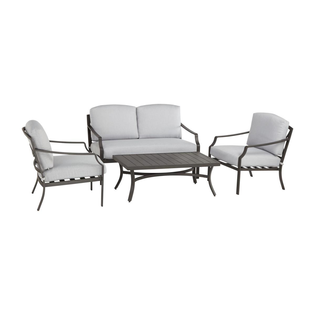 Complete lounging set Seats up to 4 Comes with seat & back cushions Seat height: 30.7cm Create the perfect lounging space in the garden with our Marlow furniture set. Comprising two armchairs, a 2 seater sofa and low slatted coffee table, it can be enjoyed from dawn through to dusk. A metal dining and lounging range, Marlow tables, chairs and sofas make a comfortable space in the garden or conservatory for entertaining. Taking us to a relaxed and cosy country farmhouse, Relaxed Country is a very inviting environment with easy to live with distressed finishes and textiles. Its patterns are heavily influenced from nature; florals are soft and fluid. Colours are fresh and neutral. Please note: Not all of our ranges are on display in our furniture departments. Please call to check before you visit. Interest Free Credit: If you buy this product in our shops, it's eligible for Interest Free Credit, which is available when you spend £1000 or more on selected home products. Terms and conditions apply