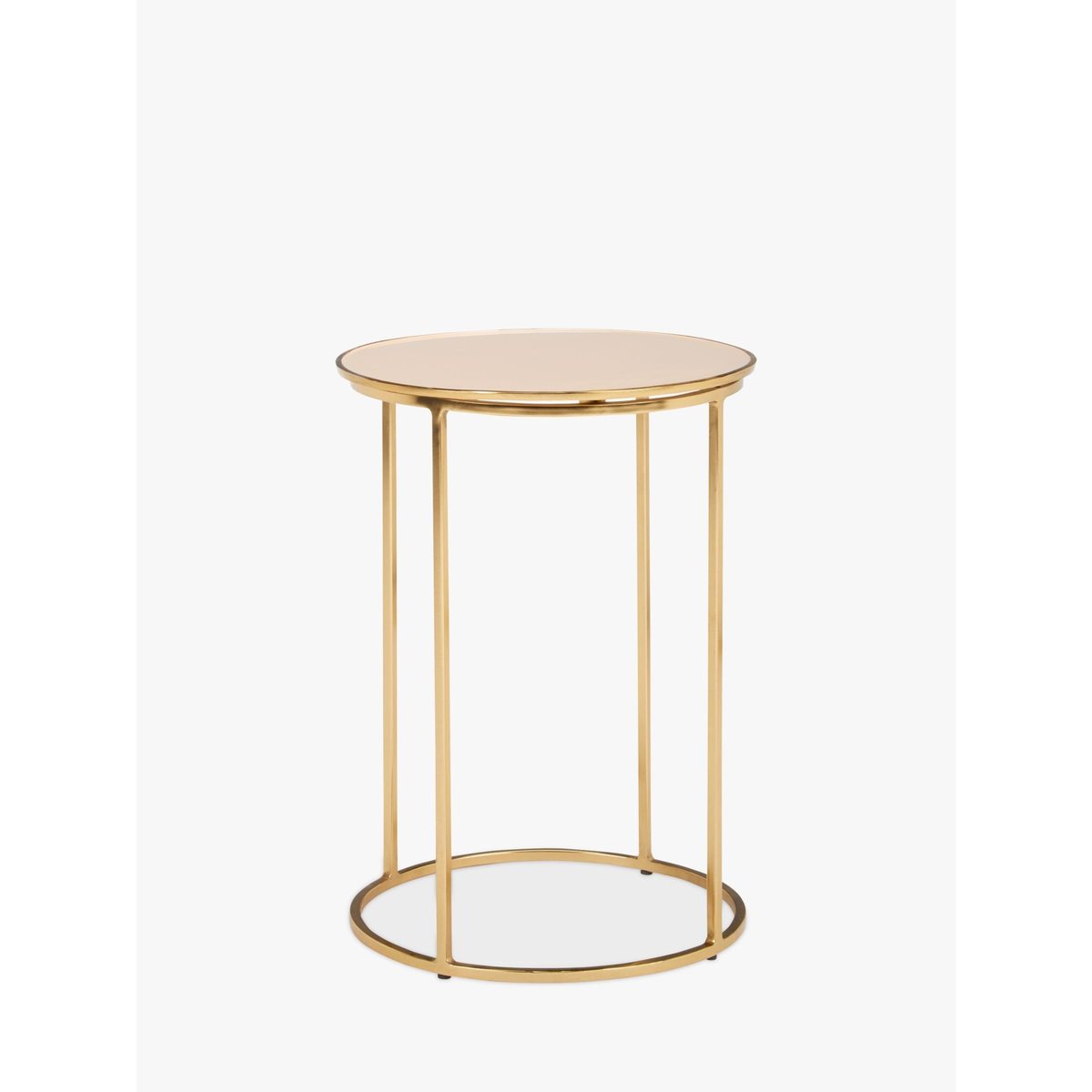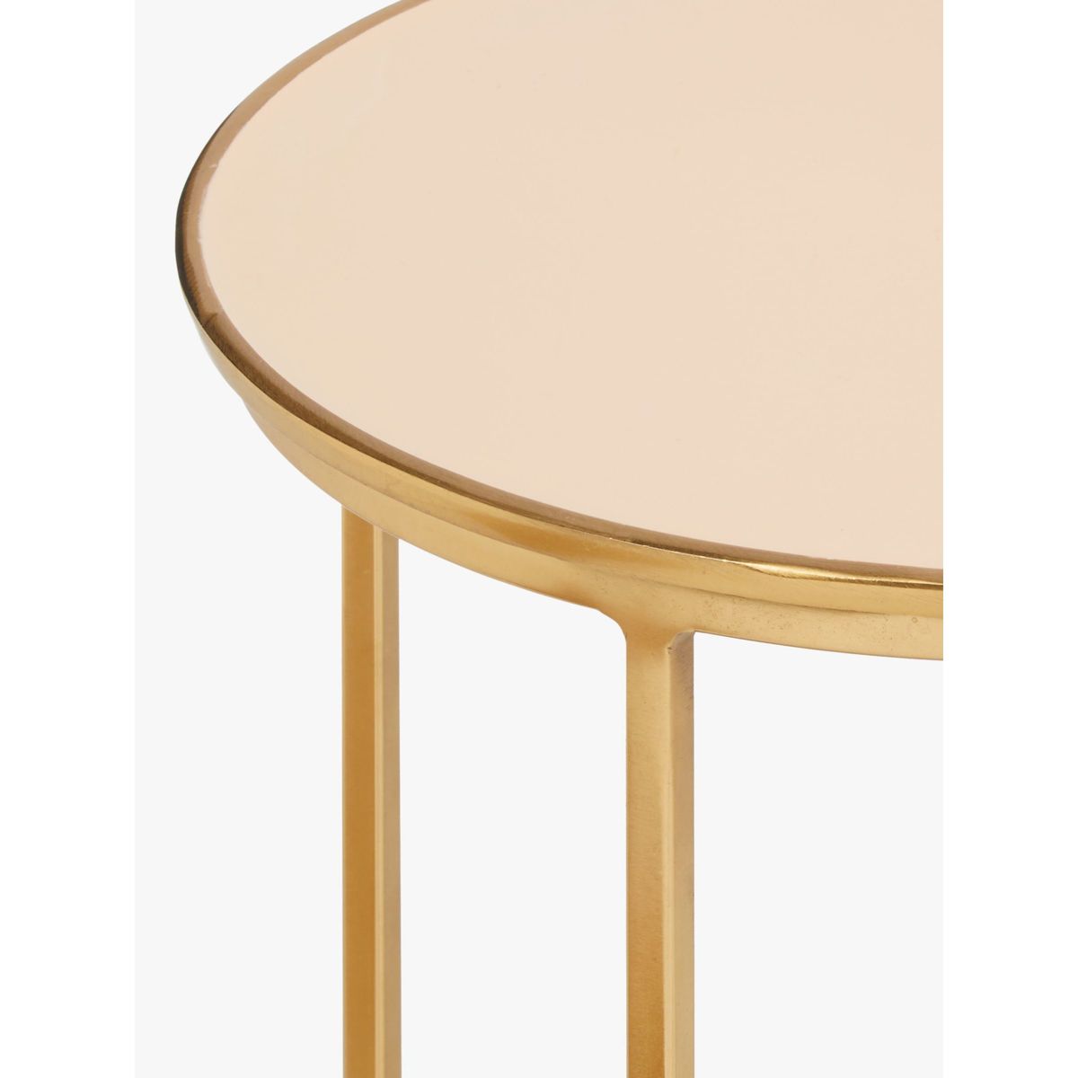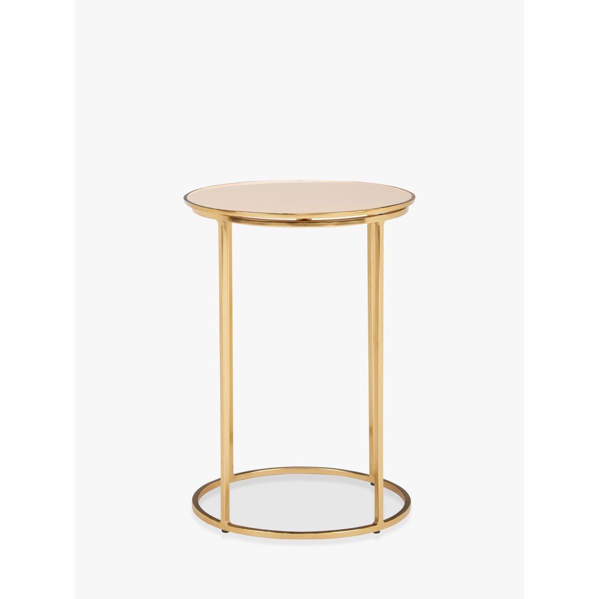 Our Melena small side table offers a smart surface top for your best home accessories. Its art-deco inspired, rounded silhouette features a smooth enamel top and is supported by a sturdy metal frame in a brushed brass finish. Offering an impressive styling accent, decorate your space with a table lamp or succulent. Maximum load: 15kg. Please note: not all our ranges are on display in our shops. For more information, please speak to a furniture Partner in store, or call 03452 661805 and we can tell you where the range you'd like to view is on display.