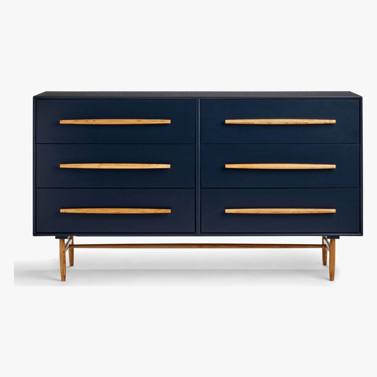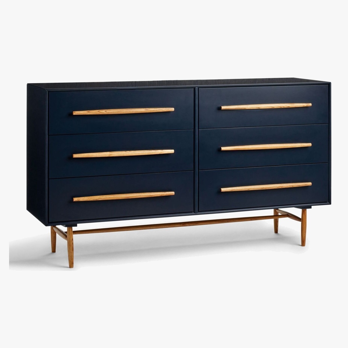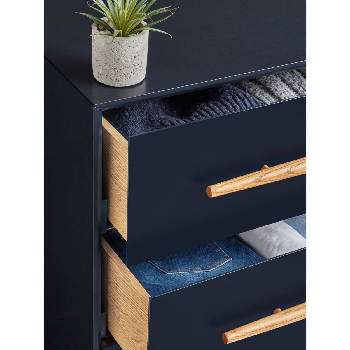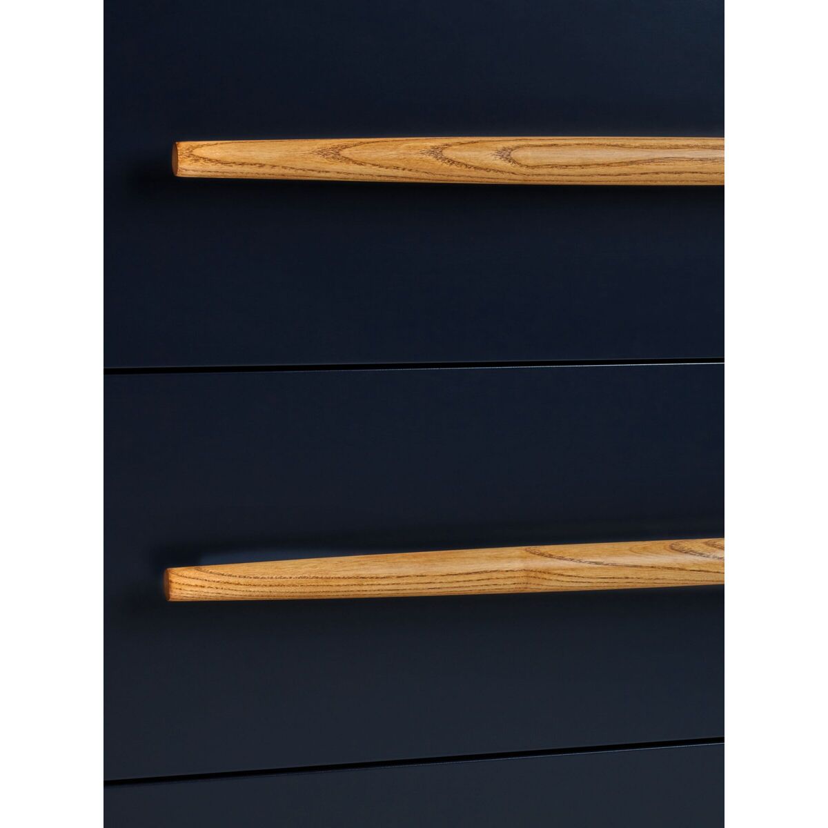 Reinvent your home interiors with our Mid-Century Sweep range of bedroom furniture. Durable, high-quality materials showcase retro facades and eye-catching designs, that provide both a stylish and functional addition to your space. With a striking nod to Mid-Century inspired design, thanks to its solid frame and softer, spindle-style legs, this chest of drawers provides ample storage space. Made from a combination of solid ash, veneers and particle board, the Acorn option highlights its natural, real-wood grain, while the Blue option is painted to give your bedroom a statement styling accent. Each of the six soft-close drawers feature natural ash wood handles in the same spindle design for a sleek and coordinated look.
