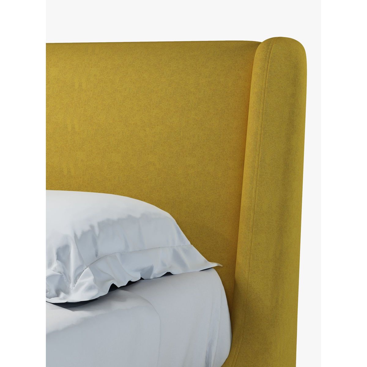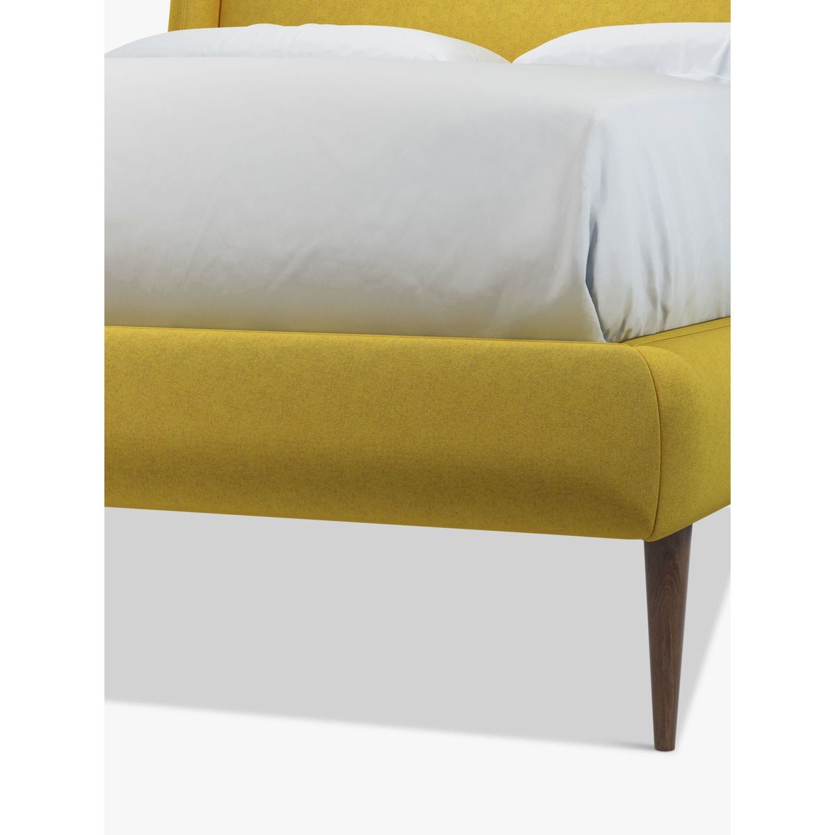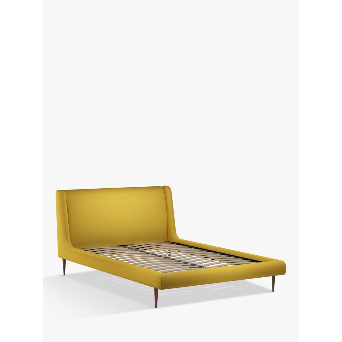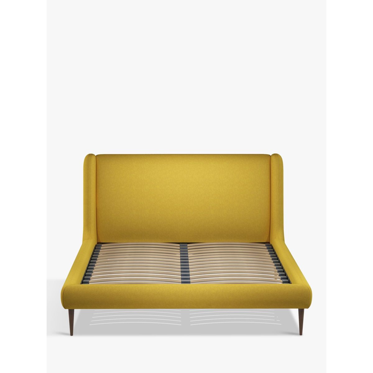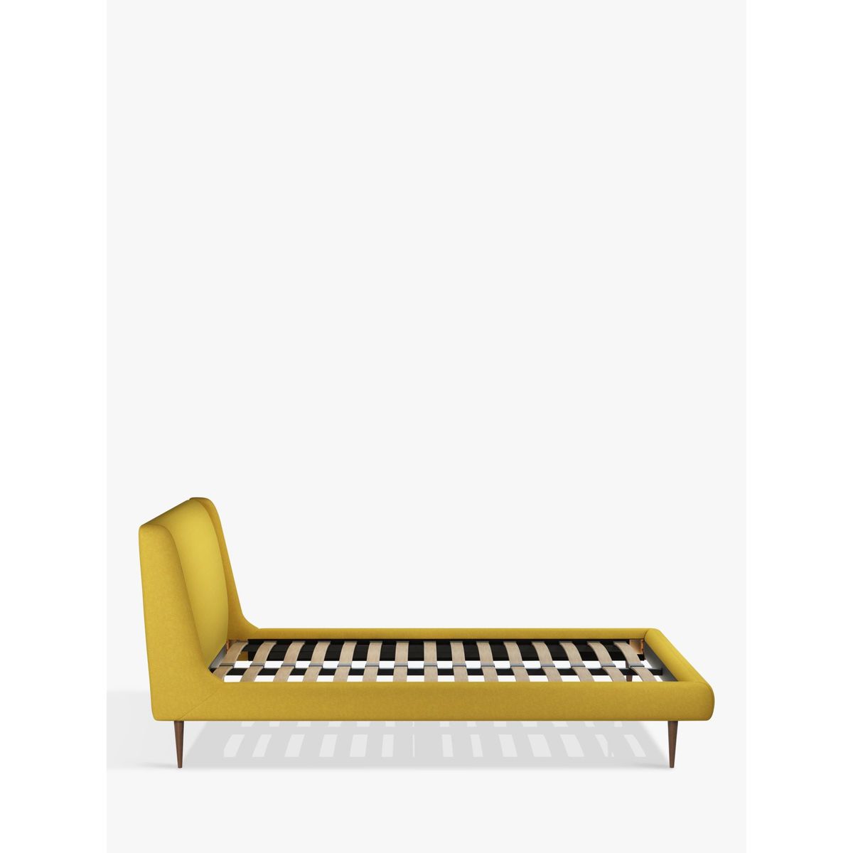 Our Mid-Century Sweep bed frame has a sleek, retro-inspired shape. Its streamlined profile marries soft curves and sharp lines, resting on tapered wooden legs. Sprung slats in the base provide additional support for you and your mattress. Built with Smart Slats This bed frame is designed with wider slats at the shoulders, lumbar and feet. They provide maximum support for you and your mattress so that you experience perfect spinal alignment while you sleep. The standard slat caps are black so we have added grey slat caps to ensure that you know where to place the wider slats. Our Band A fabric, Saga is woven with man-made fibres, making it exceptionally durable and versatile. Our Band A fabric, Topaz is woven to offer a linen-effect feel, and available in a versatile palette. Our Band B fabric, Erin is woven with man-made fibres to create a beautifully soft yarn. This tactile, velvet-style chenille fabric exhibits a two-tone look in different lights. Our Band B fabric, Opulence offers a luxurious, soft-touch. This velvet-feel fabric is available in a rich colour palette. Our Band B fabric, Mole is a woven wool-blend that's soft and cosy. Pilling and bobbling may occur naturally over time. Our Band B fabric, Relaxed Linen is durable, resilient and versatile, woven from man-made and natural fibres Want to see it first? You may want to see and get a feel for the furniture in one of our shops before ordering. We'll be able to tell you where the range you'd like to view is on display.