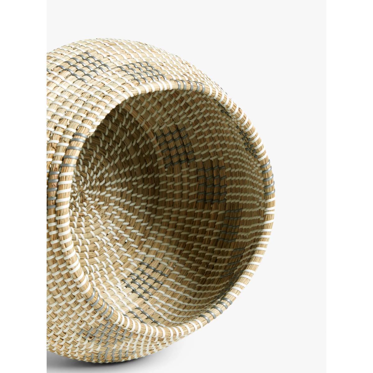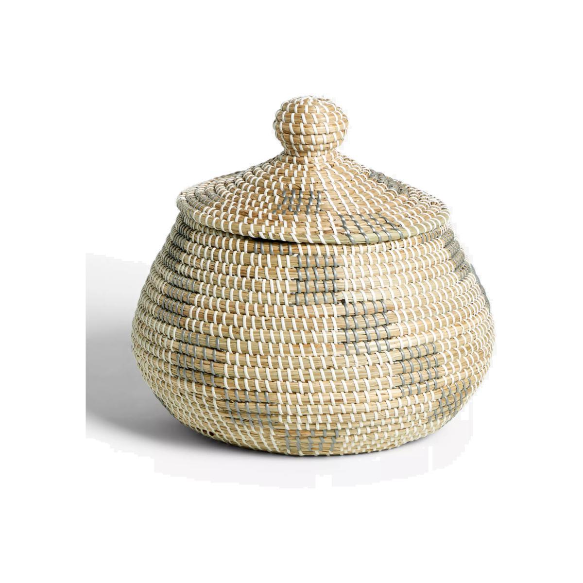 This lidded basket is perfect for hiding away bits and pieces at home. The shape is reminiscent of North African or Middle Eastern baskets and the threaded grey and white plastic work to keep the seagrass in place. Fast growing seagrass is hand-woven by highly skilled artisans. Its durability and strength make it ideal for basket-weaving.