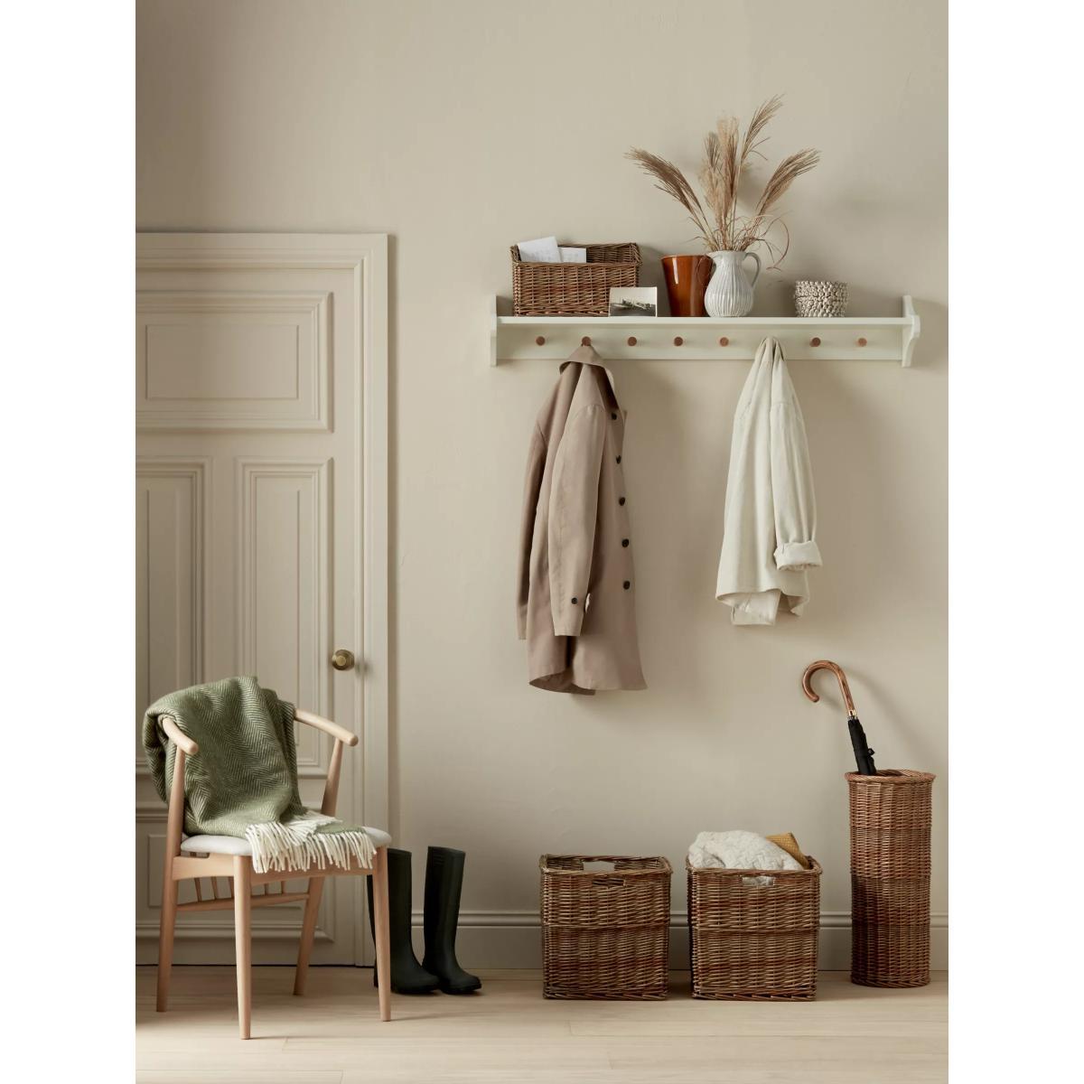 I love this square wicker basket for its versatile, clean-lined design that works well in both modern and country interiors. Its neutral tones and open weave make it perfect for storing throws, magazines, or pantry essentials, adding warmth and texture without cluttering your space. It’s practical as a storage solution in living rooms, bedrooms, or even bathrooms, and looks particularly stylish when paired with other natural materials like linen or wood. For a polished look, consider using it as a statement piece on open shelving or as a standalone decorative item filled with seasonal greenery or cosy blankets. Its classic shape and timeless appeal make it a smart choice for both functional and aesthetic purposes.