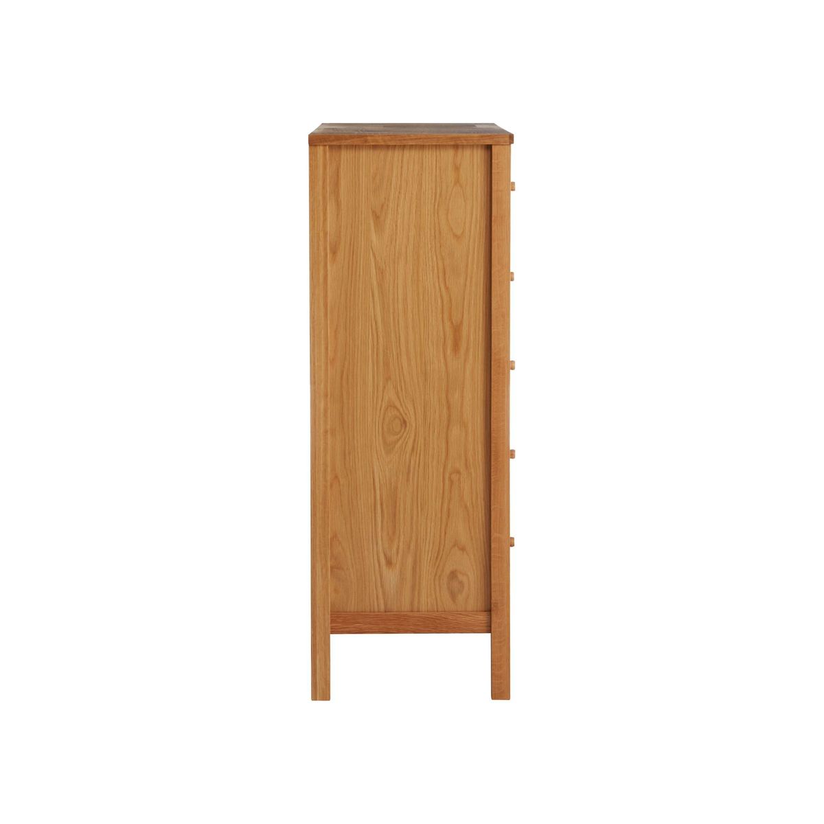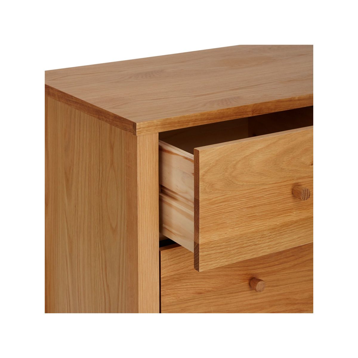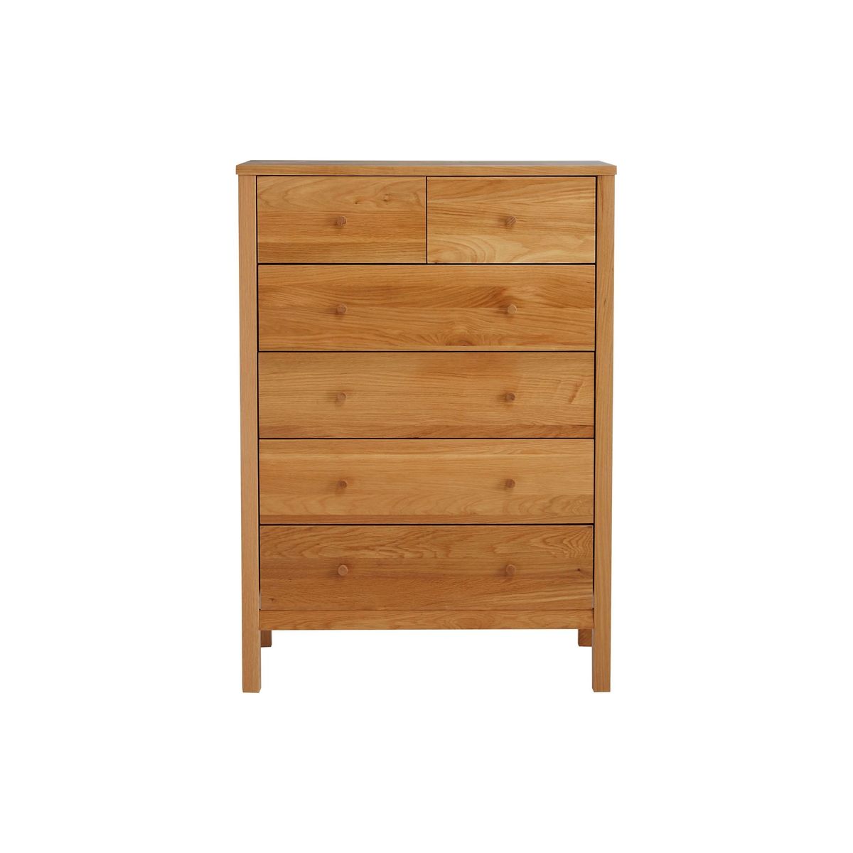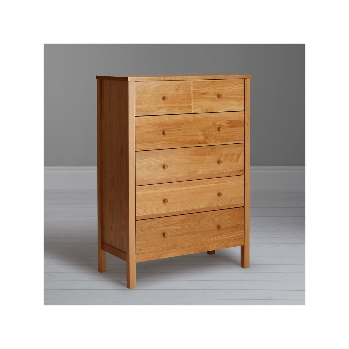 We've kept the finish on this chest of drawers natural and visually light to highlight the texture and authentic pattern of the oak grain. It's made from a combination of solid oak and high-quality pine woods and MDF and we've coated it in a veneer for durability. The coordinating round handles on each of the six drawers looks sleek and subtle and camouflage into the frame. Clean-lined and timeless, it's supplied fully assembled so you can add it straight into your bedroom set up.