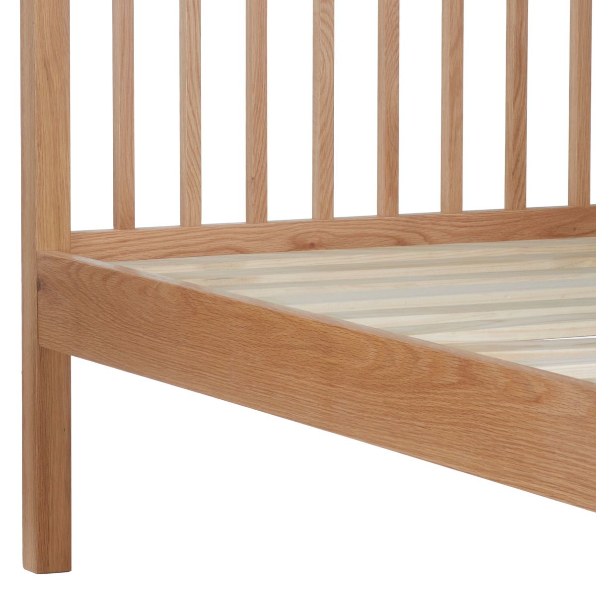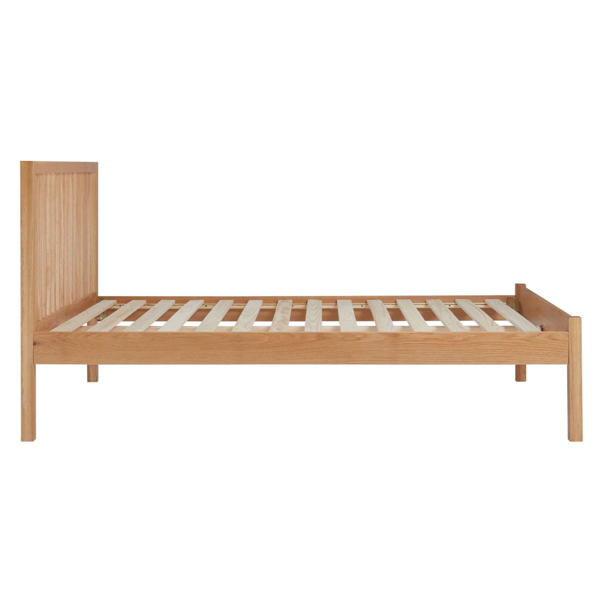 The Morgan bedstead is made from solid oak, which offers both its durability and beautiful grain to create a visually impressive finish. Its clean lines and modern look are complemented by a square slatted headboard, which helps to make a statement in any bedroom. The static pine slat system provides support for your mattress, helping you work towards a comfortable night's sleep. The mattress pictured is not included with this bed.