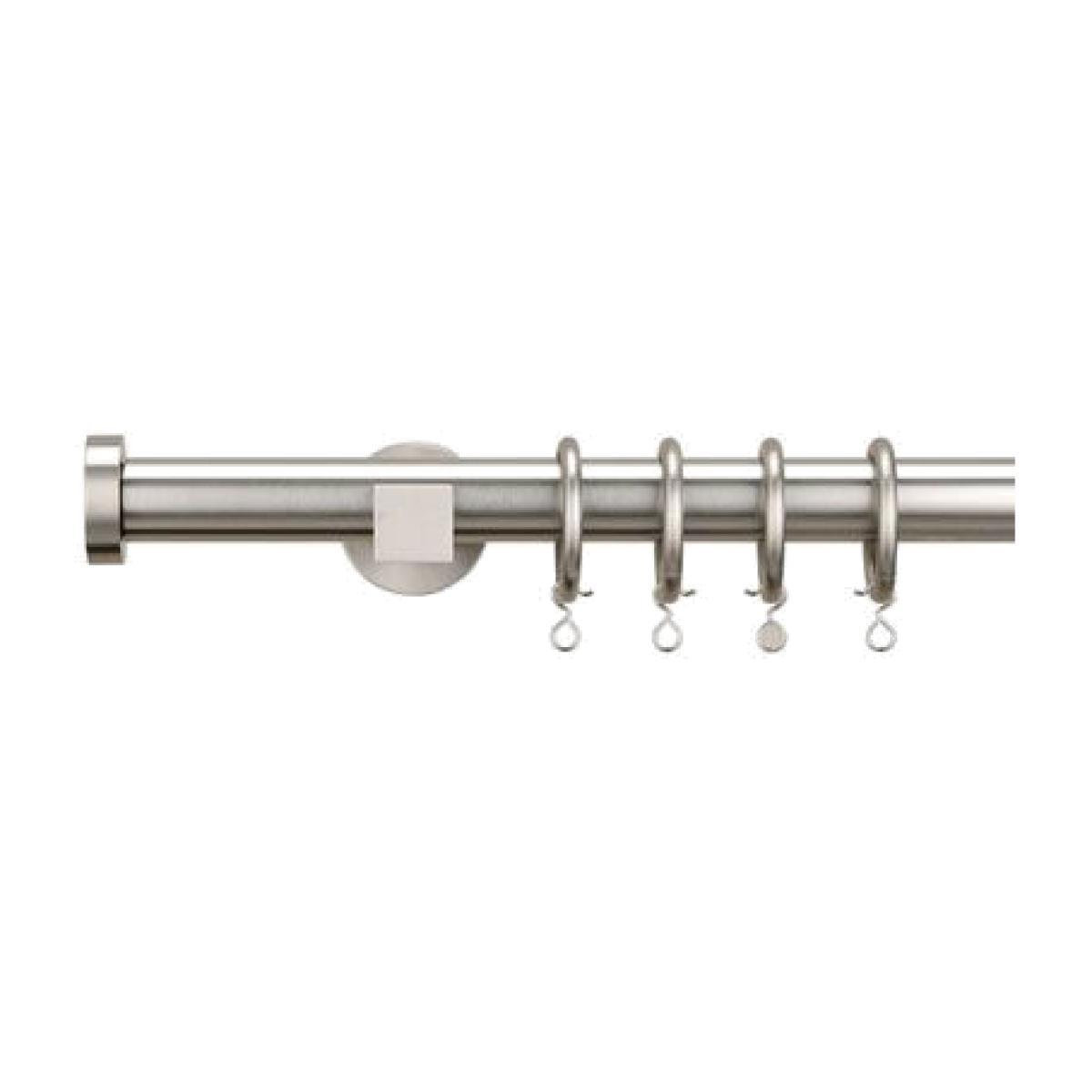 A steel pole kit with a nickel-plated finish and disc finials. This kit contains all the accessories and fittings you'll need to fit your pole, so all that's left is to choose your curtains. Comprehensive instructions offer a step-by-step guide, whether you're using the pole as it comes or cutting it to size. Kit includes: L150cm L300cm Curtain pole 1 2 plus a connector Brackets 2 3 Cover plates 2 3 Finials 2 2 Rings 16 30 Other Screws and wall plugs Screws, wall plugs and a double-ended joining screw Additional rings are available separately. Shop them here