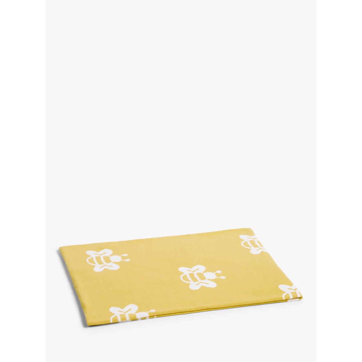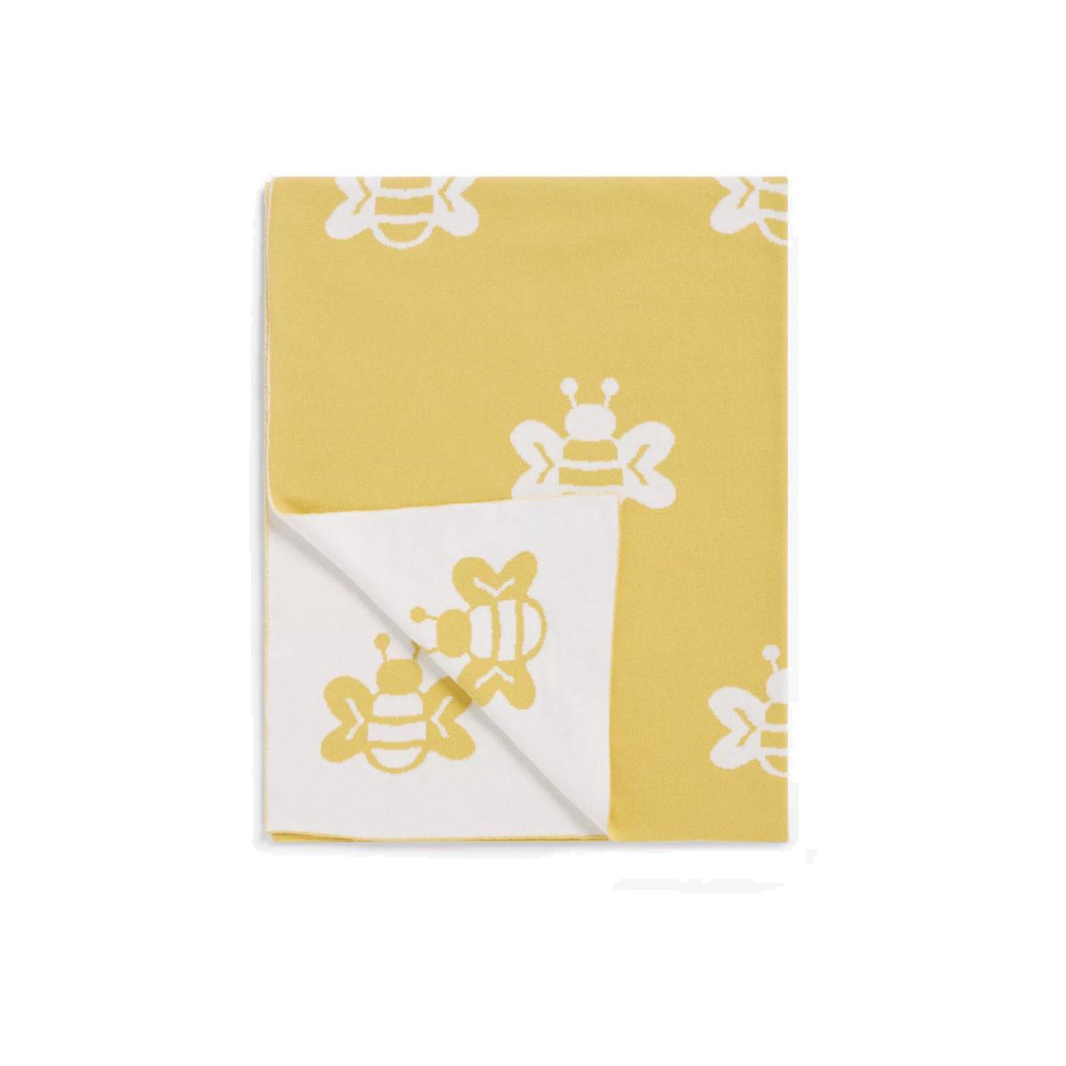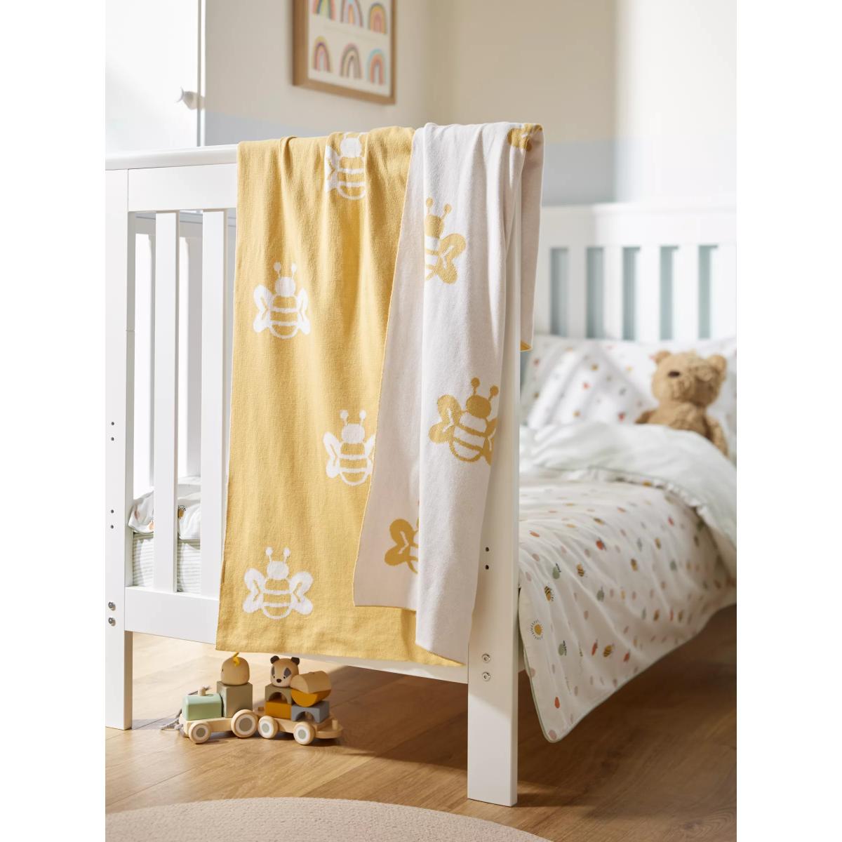 With a cute design made for modern life, this cotton knitted blanket gives your baby a soft, comfortable, and cosy feeling so they can drift easily off to sleep. Part of our Oh My Darling range, this blanket features an allover bee print on both the front and the back making the style reversible. Pair with other items in the range for a complete look. Better Cotton By choosing our cotton products, you’re supporting our investment in Better Cotton’s mission to help cotton communities survive and thrive while protecting and restoring the environment. Better Cotton Farmers are farmers who care for the environment and respect workers’ rights and wellbeing. This product is sourced via a system of mass balance and therefore may not contain Better Cotton. bettercotton.org/massbalance