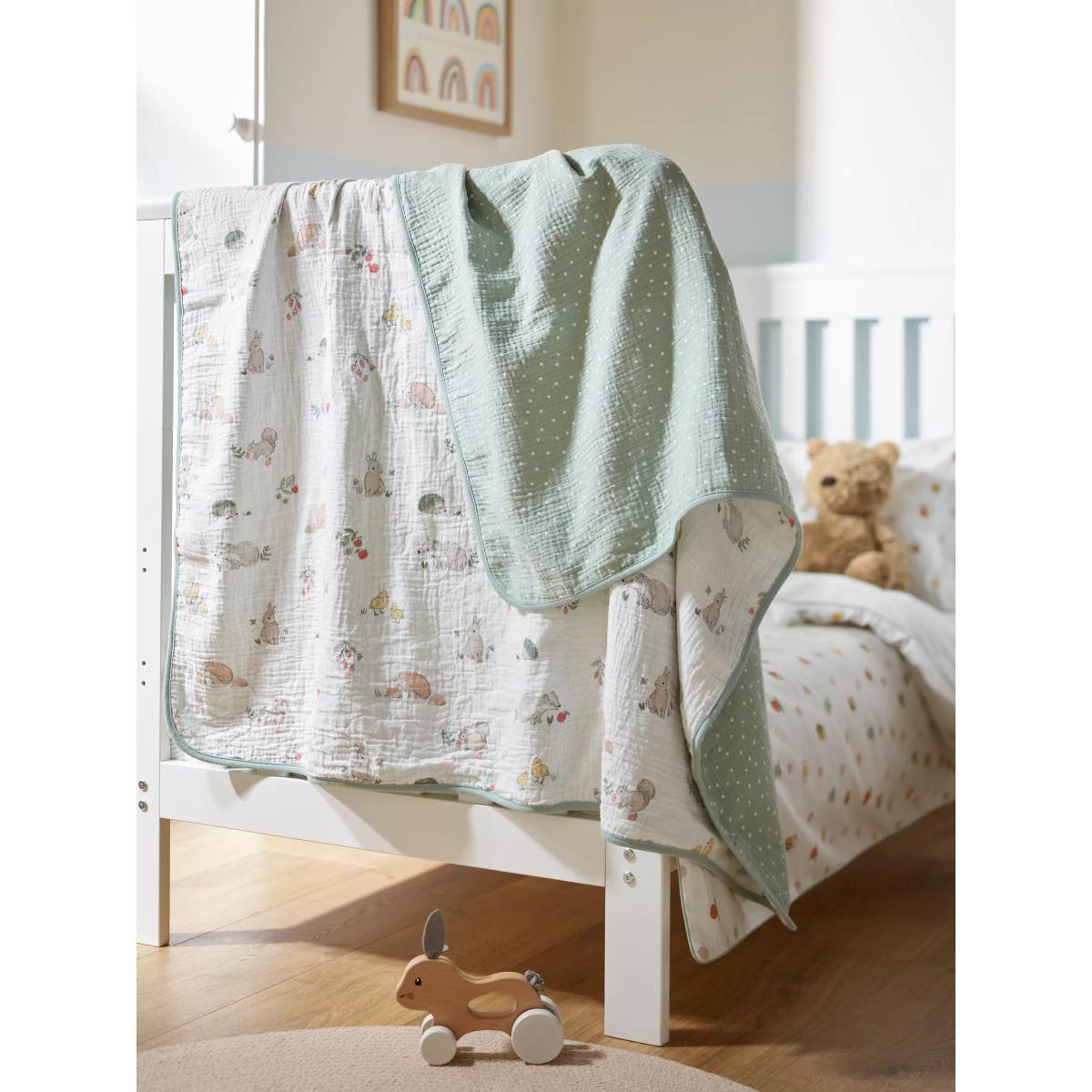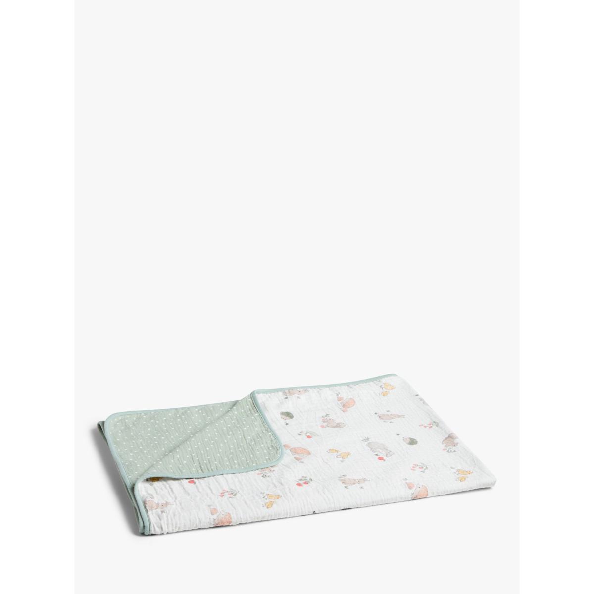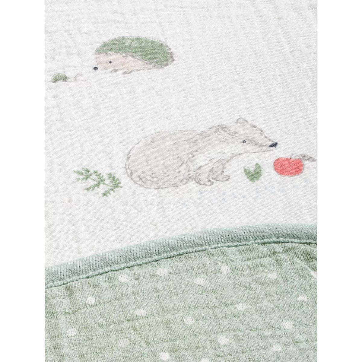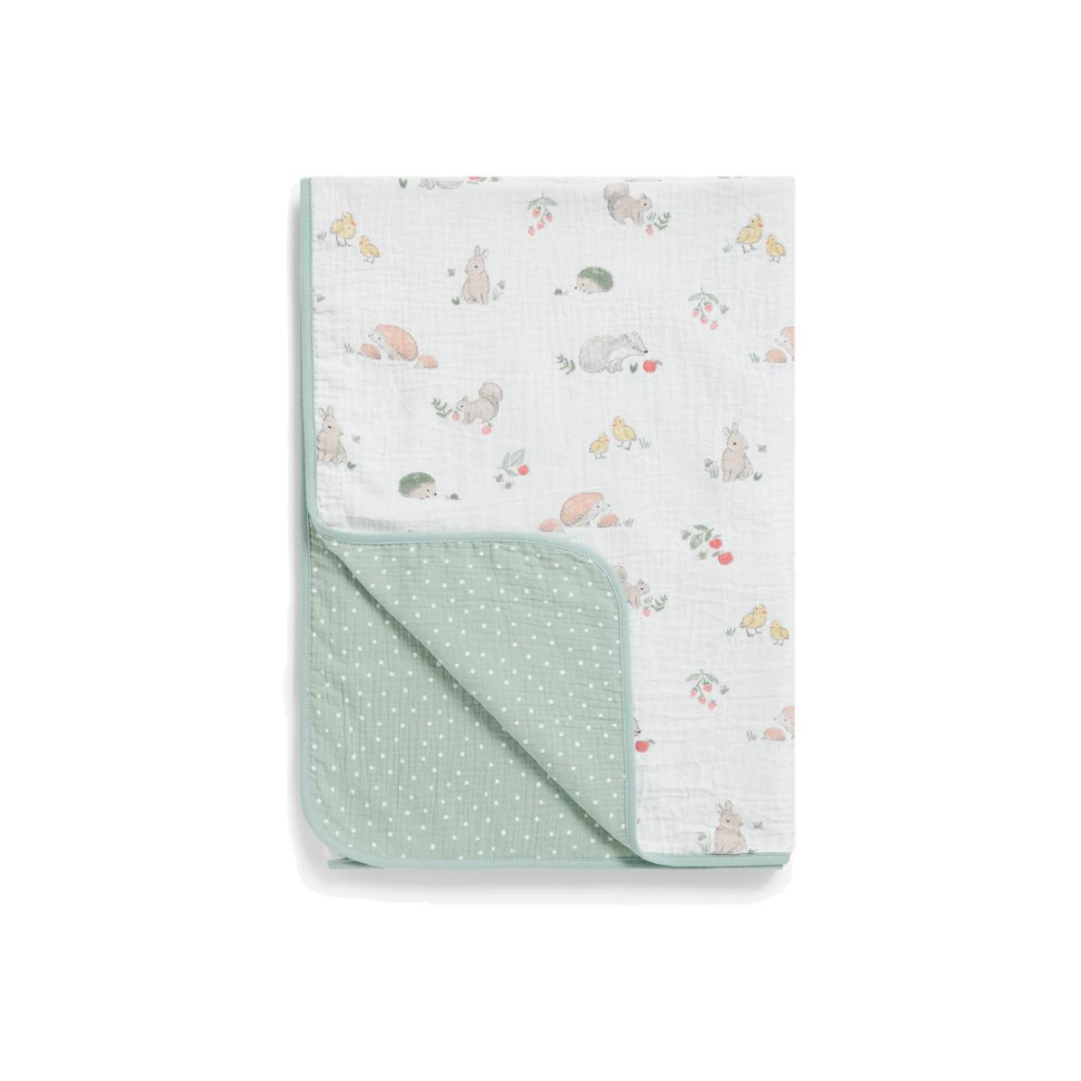 With 2 layers of 100% cotton made in a breathable crinkle muslin, this blanket is soft and gentle against delicate skin making it perfect for newborns. The snuggly style will ensure your little one is kept comfy and warm so they can easily drift off to sleep. Printed with a sweet woodland animal print on one side and a spotted design on the reverse, it is an attractive style to complete your nursery. Better Cotton By choosing our cotton products, you’re supporting our investment in Better Cotton’s mission to help cotton communities survive and thrive while protecting and restoring the environment. Better Cotton Farmers are farmers who care for the environment and respect workers’ rights and wellbeing. This product is sourced via a system of mass balance and therefore may not contain Better Cotton. bettercotton.org/massbalance