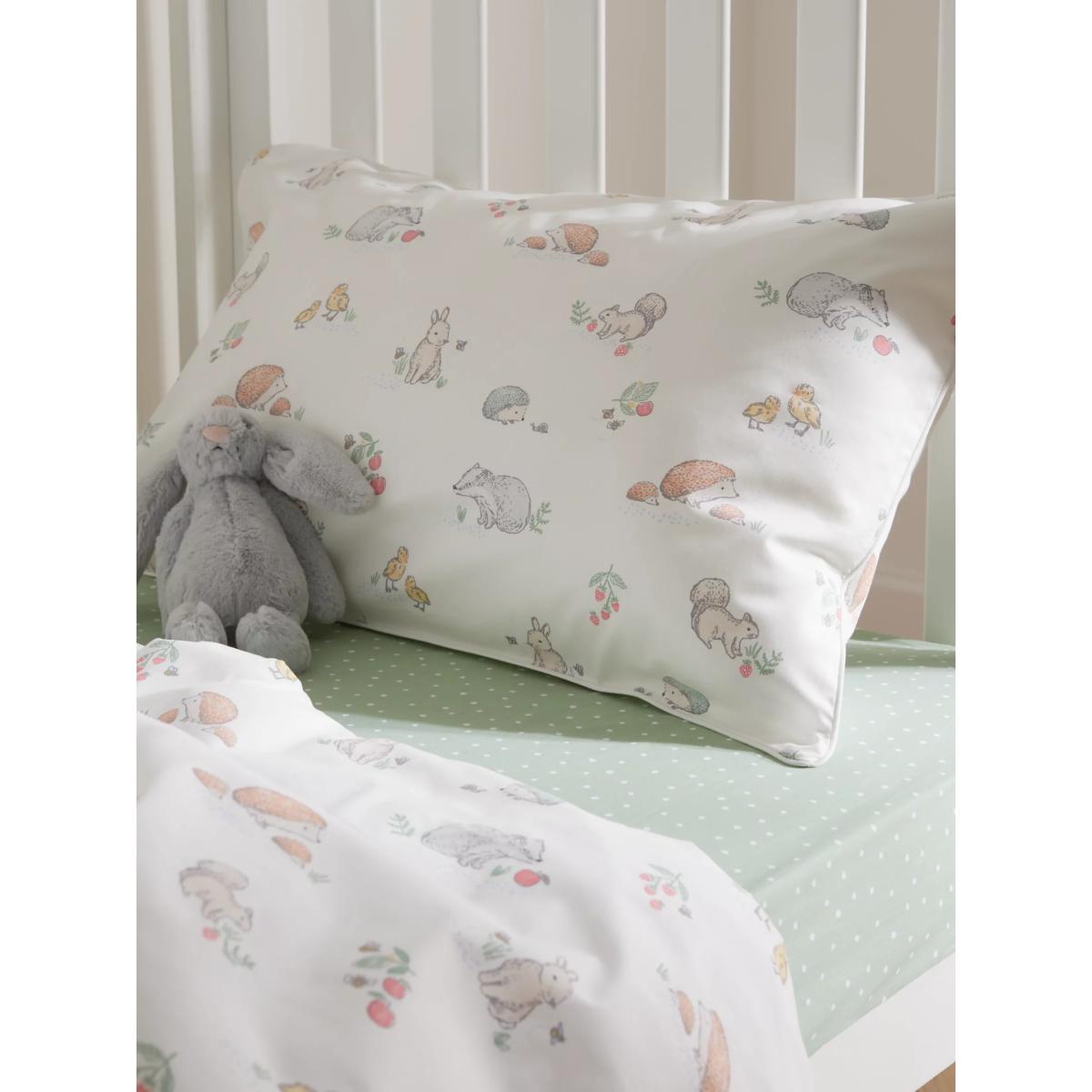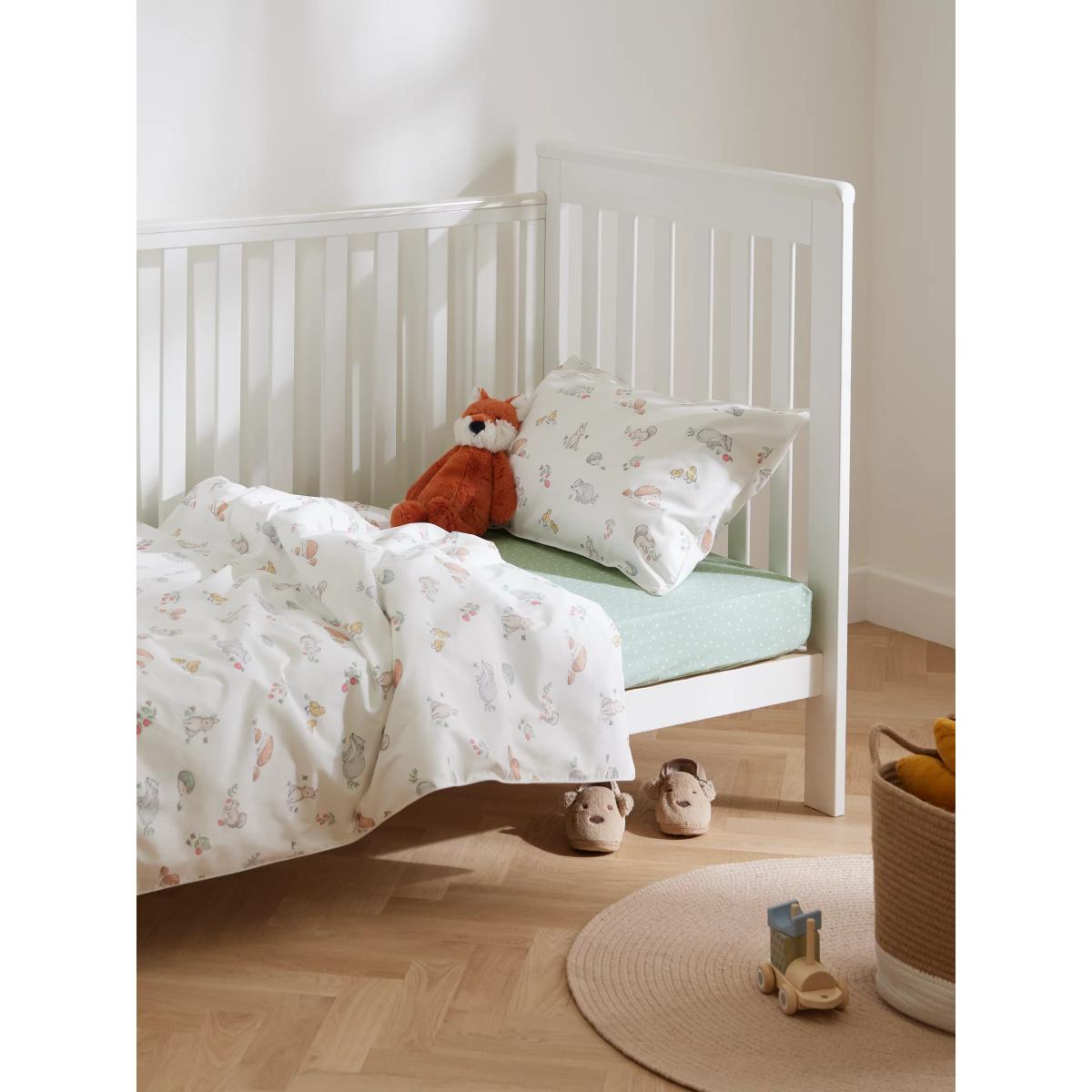 Decorated with the sweetest woodland animals to inspire their dreams, this attractive duvet cover and pillowcase set makes a great addition to any nursery. Crafted from pure cotton for a breathable feel that won't irritate their skin, it has a 200 thread count to ensure the little one stays comfortable at all times. Pair with other matching items from our Oh My Darling nursery range. Please remember: Quilts, duvets and pillows are not suitable for children under 12 months due to the risk of overheating. Better Cotton By choosing our cotton products, you’re supporting our investment in Better Cotton’s mission to help cotton communities survive and thrive while protecting and restoring the environment. Better Cotton Farmers are farmers who care for the environment and respect workers’ rights and wellbeing. This product is sourced via a system of mass balance and therefore may not contain Better Cotton.