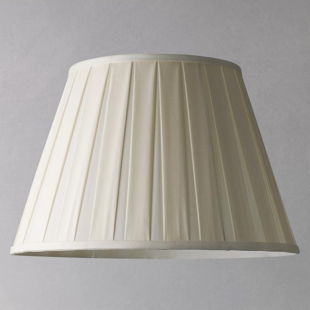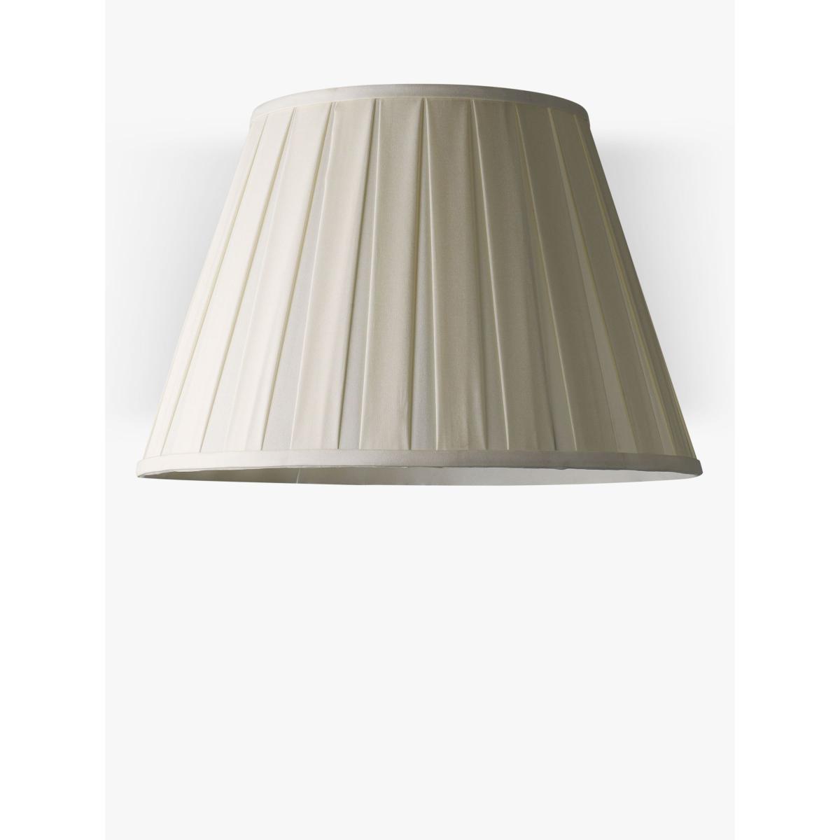 Made from a high-quality, medium-weight Dupiono silk, our Oratorio lampshade is suitable for both ceiling lights and lamp bases. Its tapered shape features wide pleat detailing with a crepe trim at the top and bottom, and it's lined in the same colour to enhance a warm and concentrated glow of light. The silk has been formed from a plain weave, where two cocoons naturally adjoined. Thanks to this natural design, any textural irregularities are characteristic of its closely weaved construction. Dimension breakdown: Dia.20cm = H13 x bottom dia.20 x top dia.12cm Dia.25cm = H18 x bottom dia.25 x top dia.16cm Dia.30cm = H20 x bottom dia.30 x top dia.18cm Dia.35cm = H23.5 x bottom dia.35 x top dia.21cm Dia.41cm = H27 x bottom dia.41 x top dia.25cm Dia.45cm = H30 x bottom dia.45 x top dia.27cm Dia.50cm = H33 x bottom dia.50 x top dia.27cm Worth knowing Small lampshade sizes are made with a reversible gimble. The Dia.45cm and Dia.50cm lampshades have fixed arms and require a lampshade spider or carrier ring to ensure a stable fit. Both are available to purchase separately, explore our options. Good to know Our straight-sided, or drum lampshades are well-paired with modern lamp bases, while tapered lampshades work well with classic style bases. You can shop our range of lamp bases here