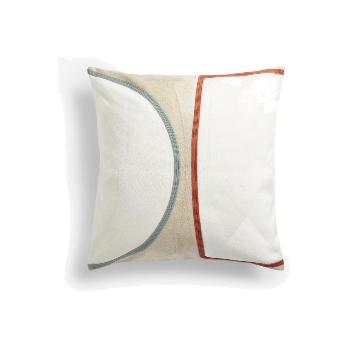 An contemporary cushion design with coloured geometric outlines and densely-stitched embroidery.