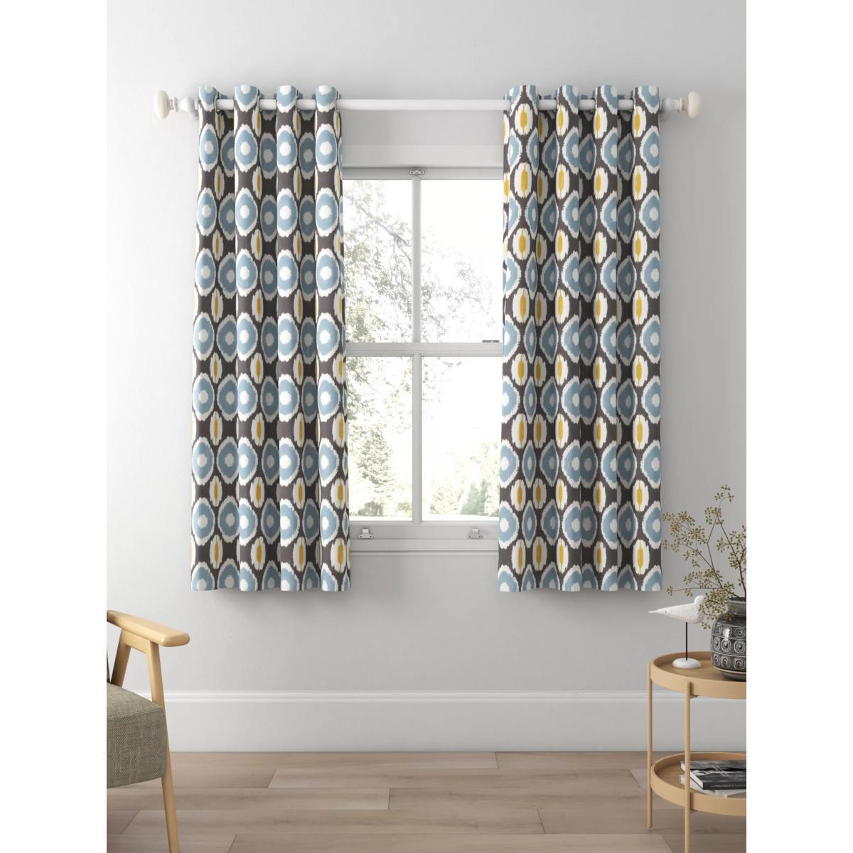 Our Oval Ikat curtains will bring a fresh and vibrant accent to your room. As they have a bold pattern they work well in rooms where you have other accessories in block colours along the same colour spectrums. The eyelet heading gives them a contemporary look with large, even folds and the lining adds the perfect finish, improving the drape and enhancing the vibrancy of the pattern. The width stated indicates the size of one curtain panel when laid completely flat. This pack contains two panels and the track/pole length we've recommended allows for the two panels to be gathered when the curtains are drawn. For a fuller look, increase the curtain width. One pair of 117cm width curtains will fit a curtain track/pole size 117-167cm One pair of 167cm width curtains will fit a curtain track/pole size 133-167cm One pair of 228cm width curtains will fit a curtain track/pole size 182-228cm Worth knowing... We package our curtains in recycled materials to keep them protected whilst they make their way to you. This means that when they arrive there could be some creases in them. We recommend you hang them for a few days to allow them to flatten and for the creases to fall out. If after this period your curtains still show signs of being folded then follow the ironing instructions on the back of the packaging. Be aware that each style of curtain has different ironing instructions, including heat limitations according to the fabric, so do make sure you follow the guidance provided to get the best results. Do you need a curtain pole and accessories?
