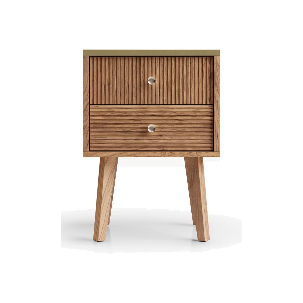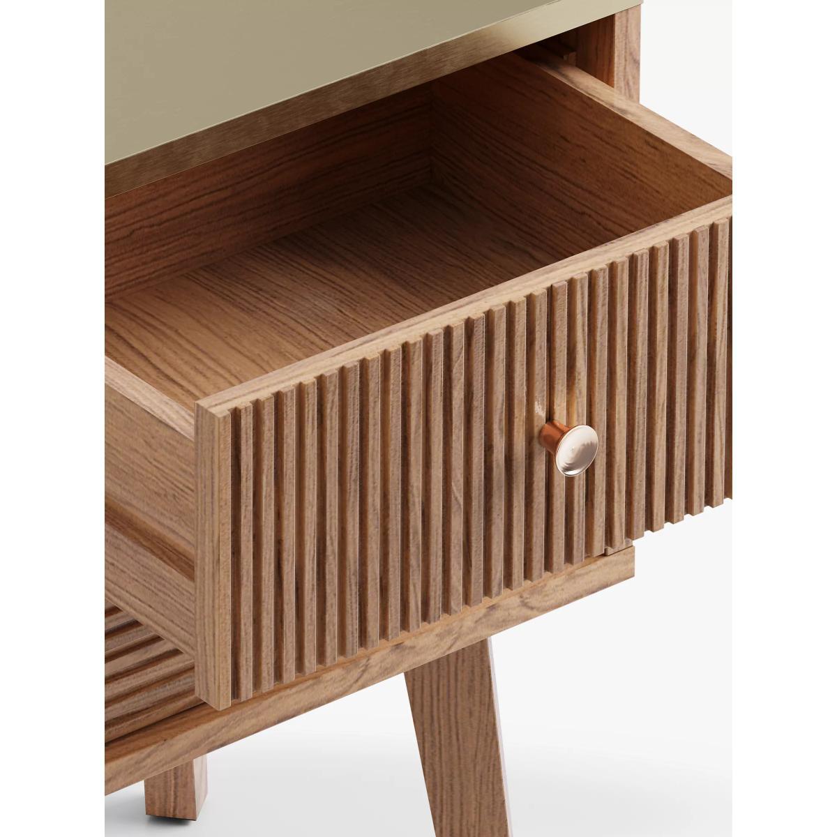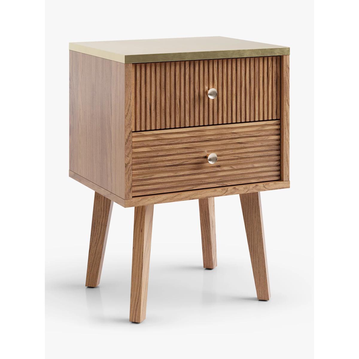 Our in-house designers created this Padma beside table from a combination of solid oak and high-quality veneers. Carved legs, a natural finish and ridged drawer fronts give the design a Mid-Century-inspired look, but the metallic brass surface top lends a luxe contrast and Deco-inspired edge. Birch wood and MDF in the frame ensure a robust finish and the two drawers are spacious enough for your bedside essentials. Want to see it first? You may want to see and get a feel for the furniture in one of our shops before ordering. We'll be able to tell you where the range you'd like to view is on display.