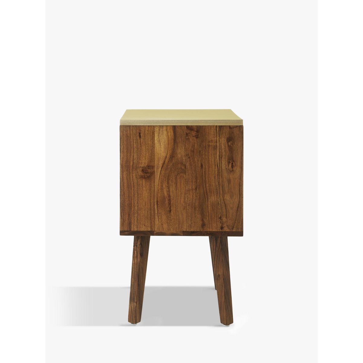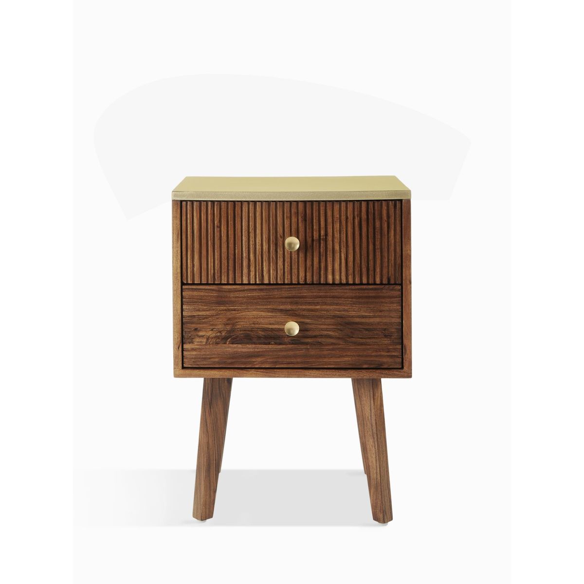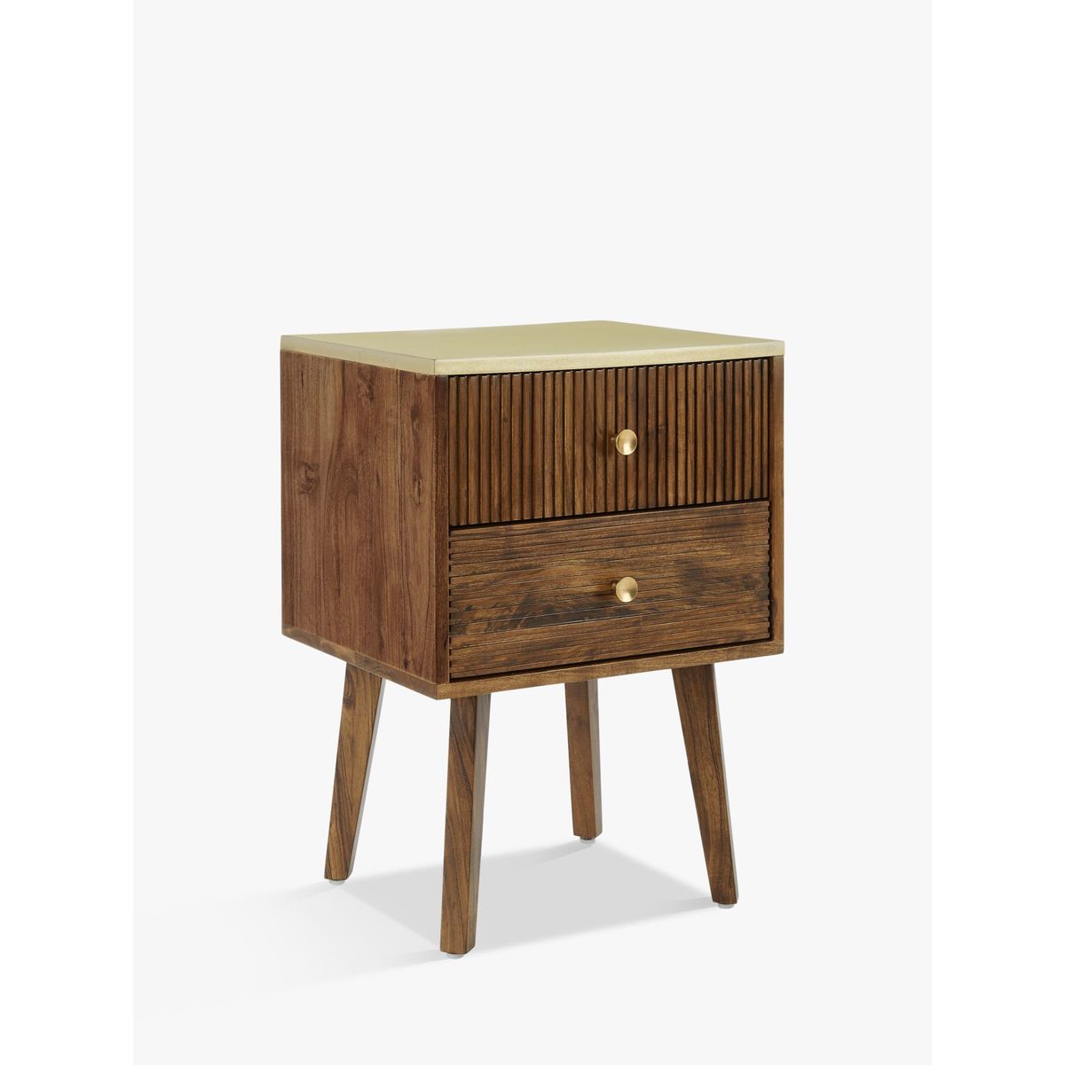 Emphasising the natural beauty of acacia wood, our Padma range of bedroom furniture combines robust design with superior quality. Carefully designed in our in-house Design Studio, each piece highlights the rich and earthy tones of its wood construction, while delicate carving and metallic detailing evokes an industrial, yet sophisticated styling accent. Resting on subtly moulded, splayed solid legs, this two drawer bedside table is designed with a contrasting groove-effect on each drawer and it's finished with a smooth, metallic finished surface top and handle. The Grey/Nickel version is painted with a white-wash finish. Its poised profile will introduce a restorative, though timeless style to your bedroom. Want to see it first? You may want to see and get a feel for the furniture in one of our shops before ordering. We'll be able to tell you where the range you'd like to view is on display.