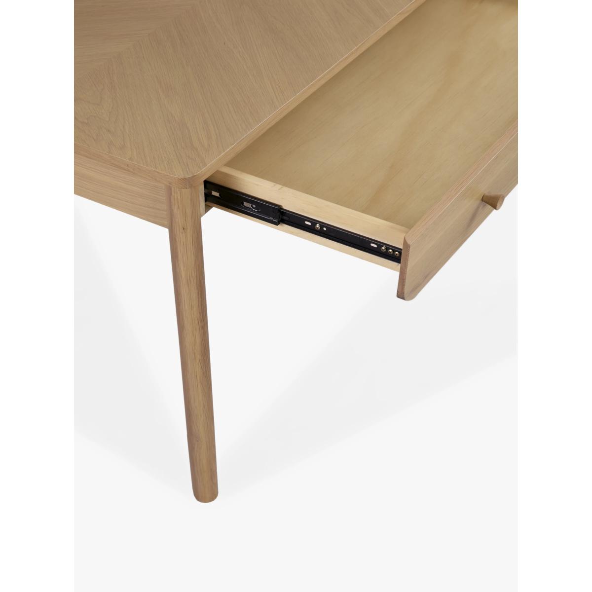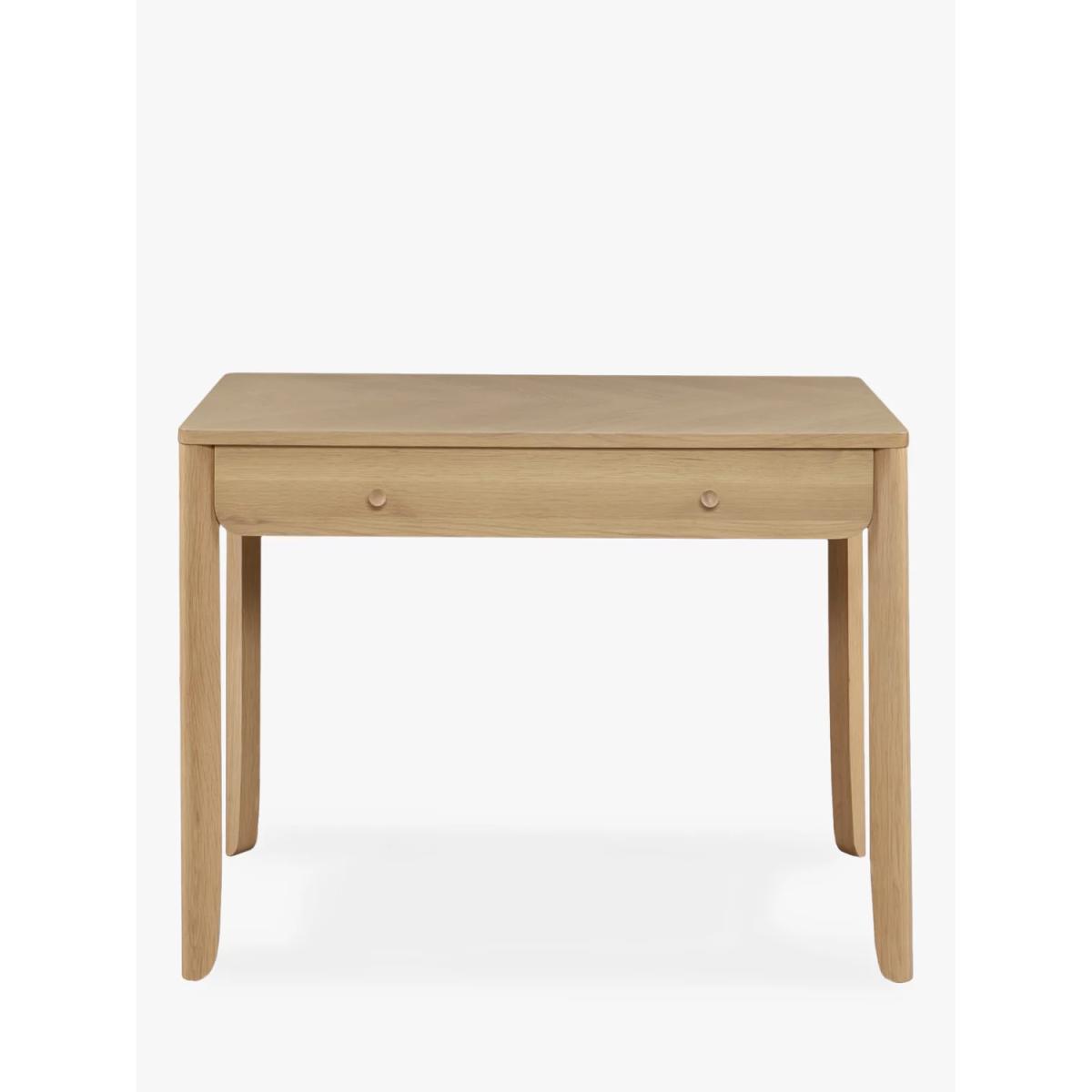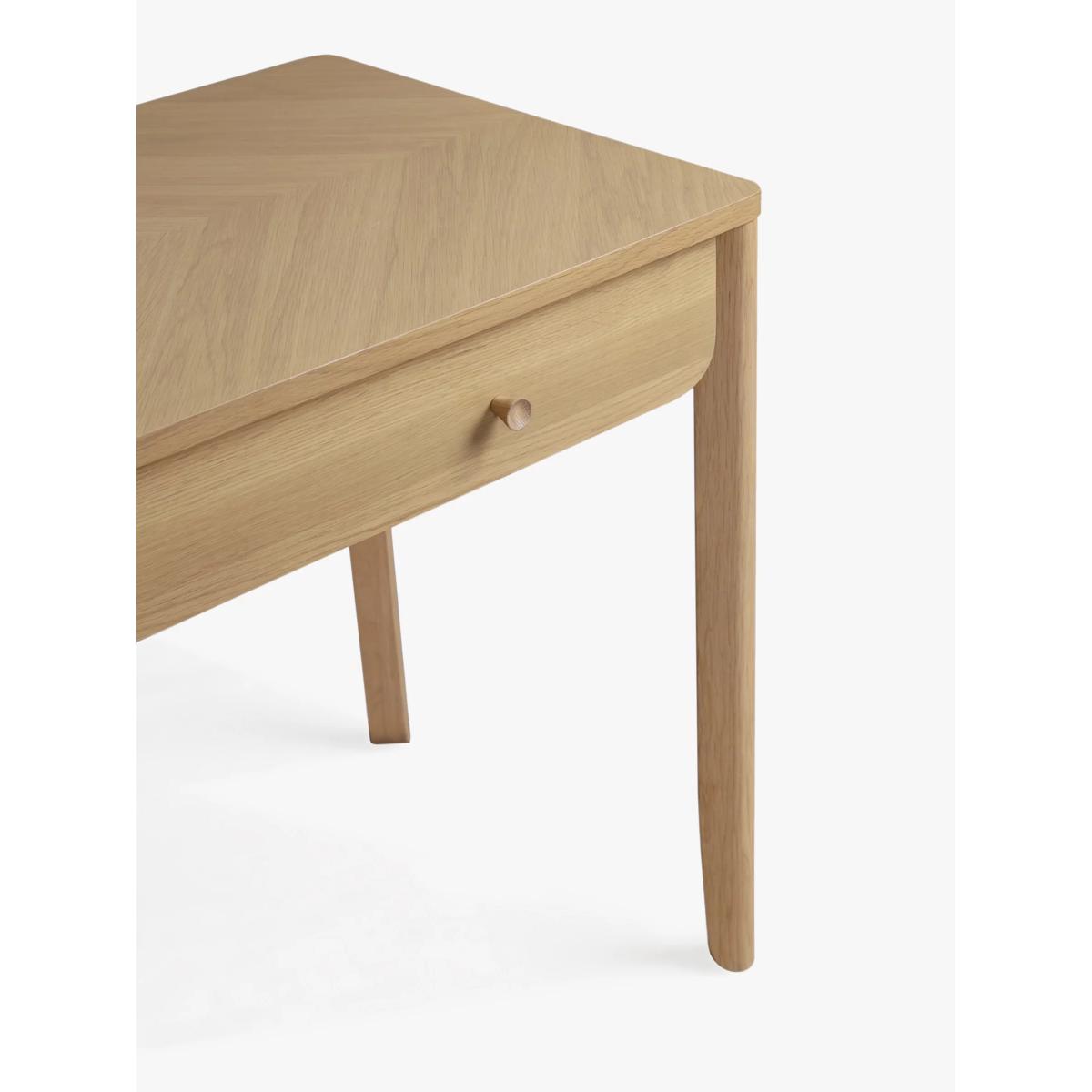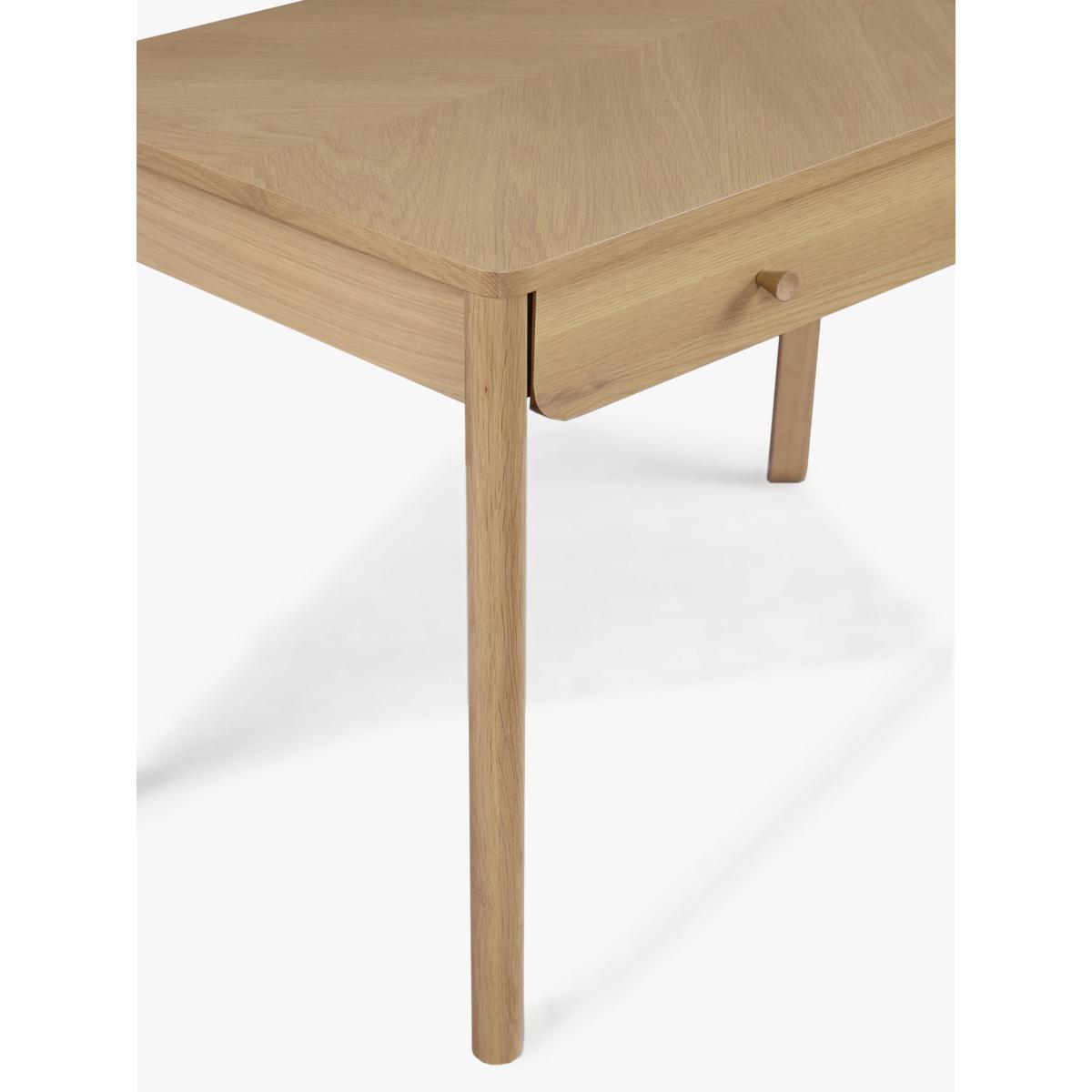 Sleek, simple and impressively sturdy, we've made this desk from high-quality timbers, including solid oak and pine wood. It's coated in a lacquer for extra durability and we like how the authentic parquet pattern in the wood is visible on the surface top. There's a handy drawer for storage and its rounded edges and natural finish give it a softer style. Perfect for creating a refined look in your home office. Want to see it first? You may want to see and get a feel for the furniture in one of our shops before ordering. We'll be able to tell you where the range you'd like to view is on display.