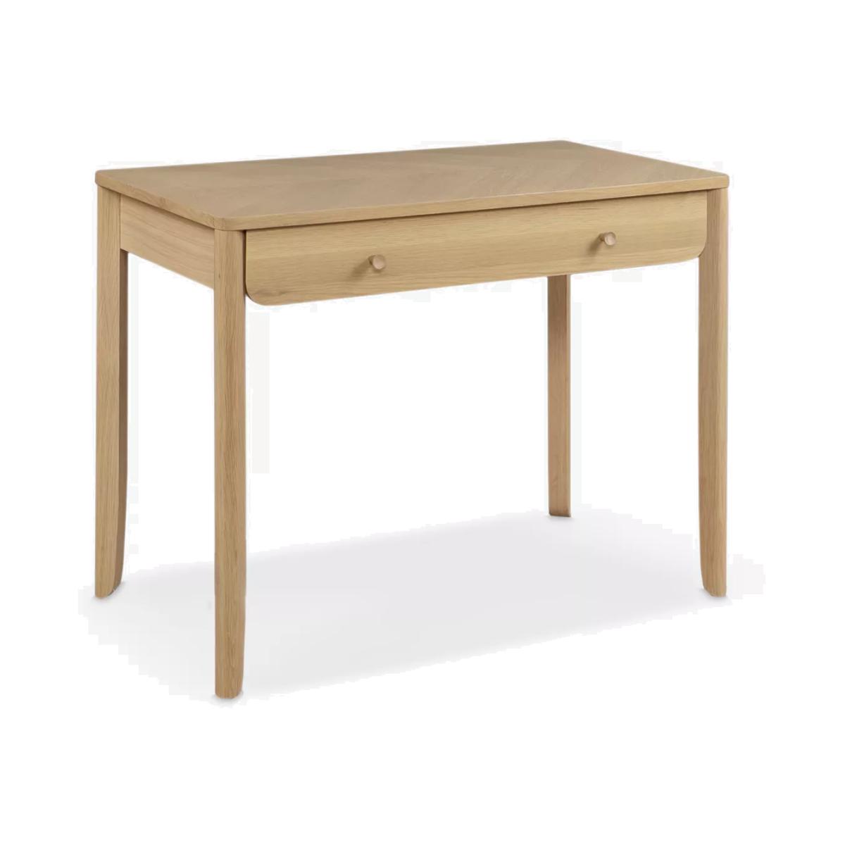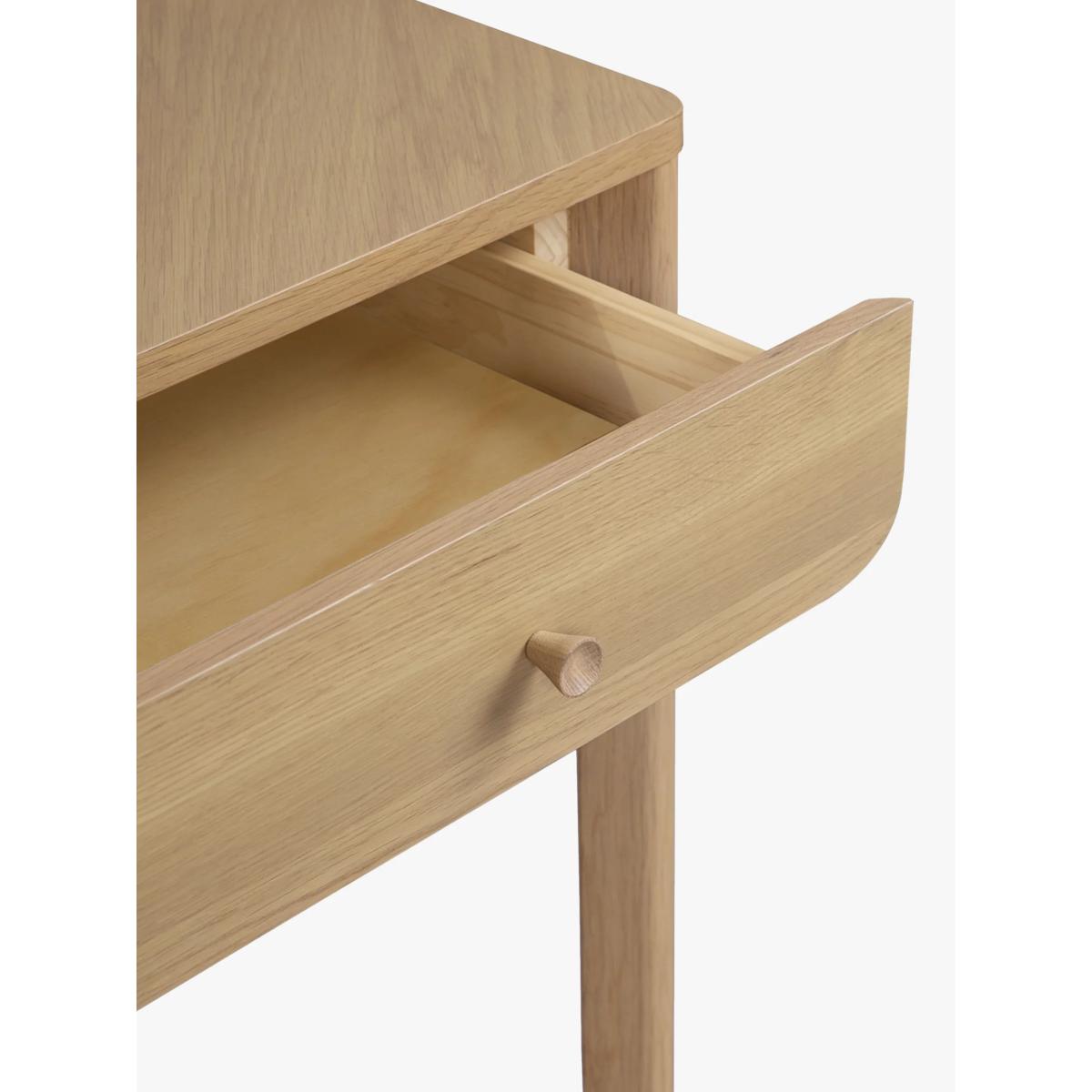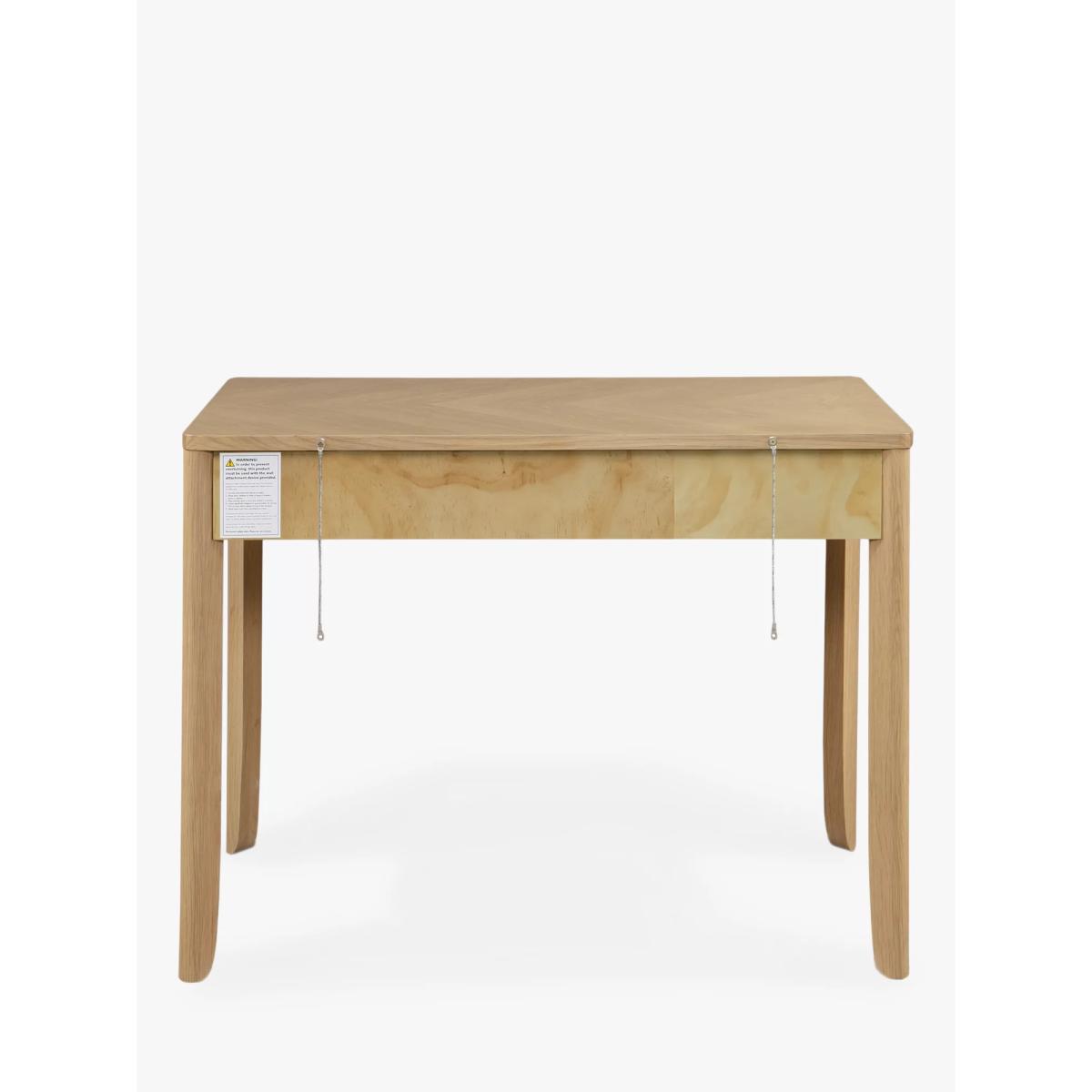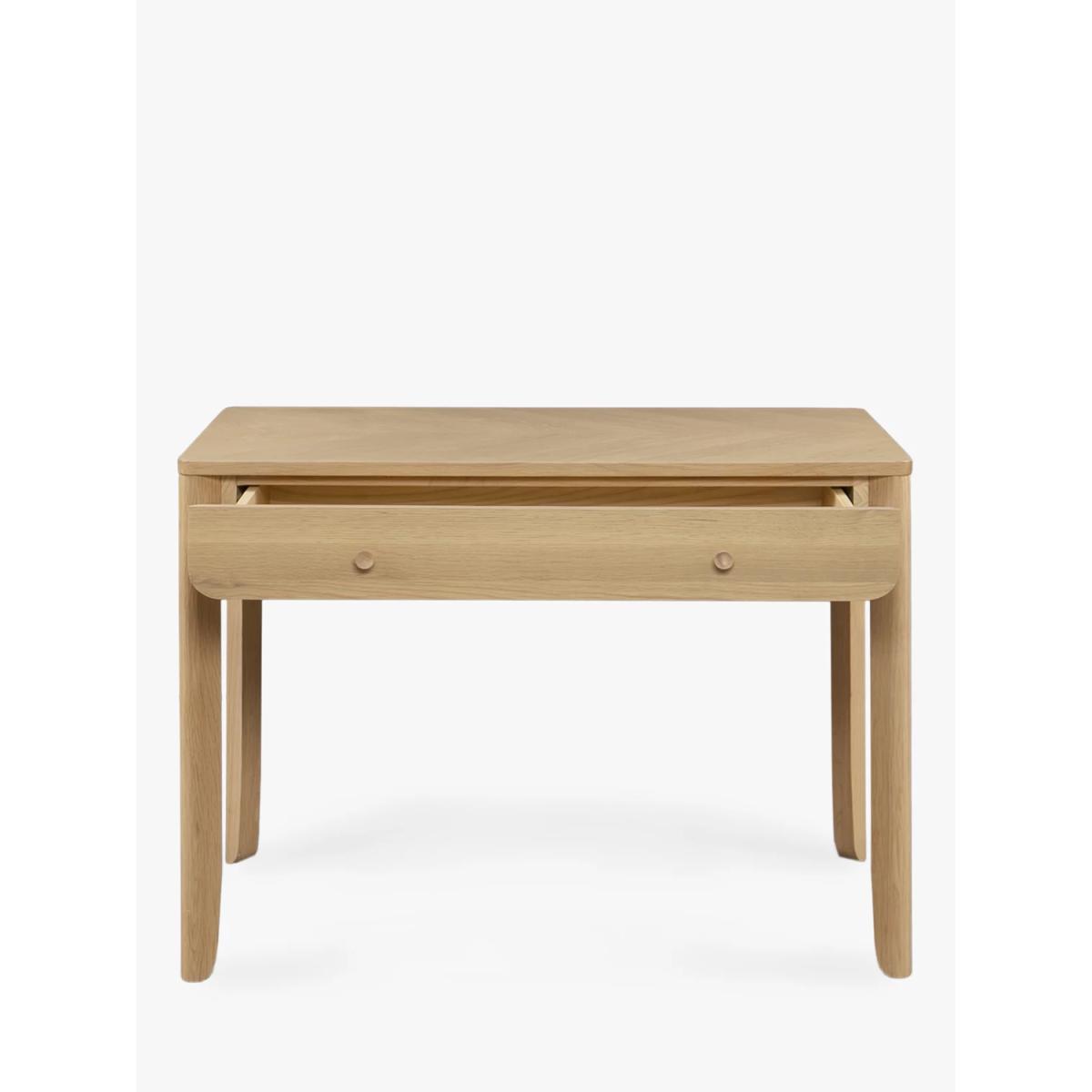 Sleek, simple and impressively sturdy, we've made this desk from high-quality timbers, including solid oak and pine wood. It's coated in a lacquer for extra durability and we like how the authentic parquet pattern in the wood is visible on the surface top. There's a handy drawer for storage and its rounded edges and natural finish give it a softer style. Perfect for creating a refined look in your home office. Want to see it first? You may want to see and get a feel for the furniture in one of our shops before ordering. We'll be able to tell you where the range you'd like to view is on display.