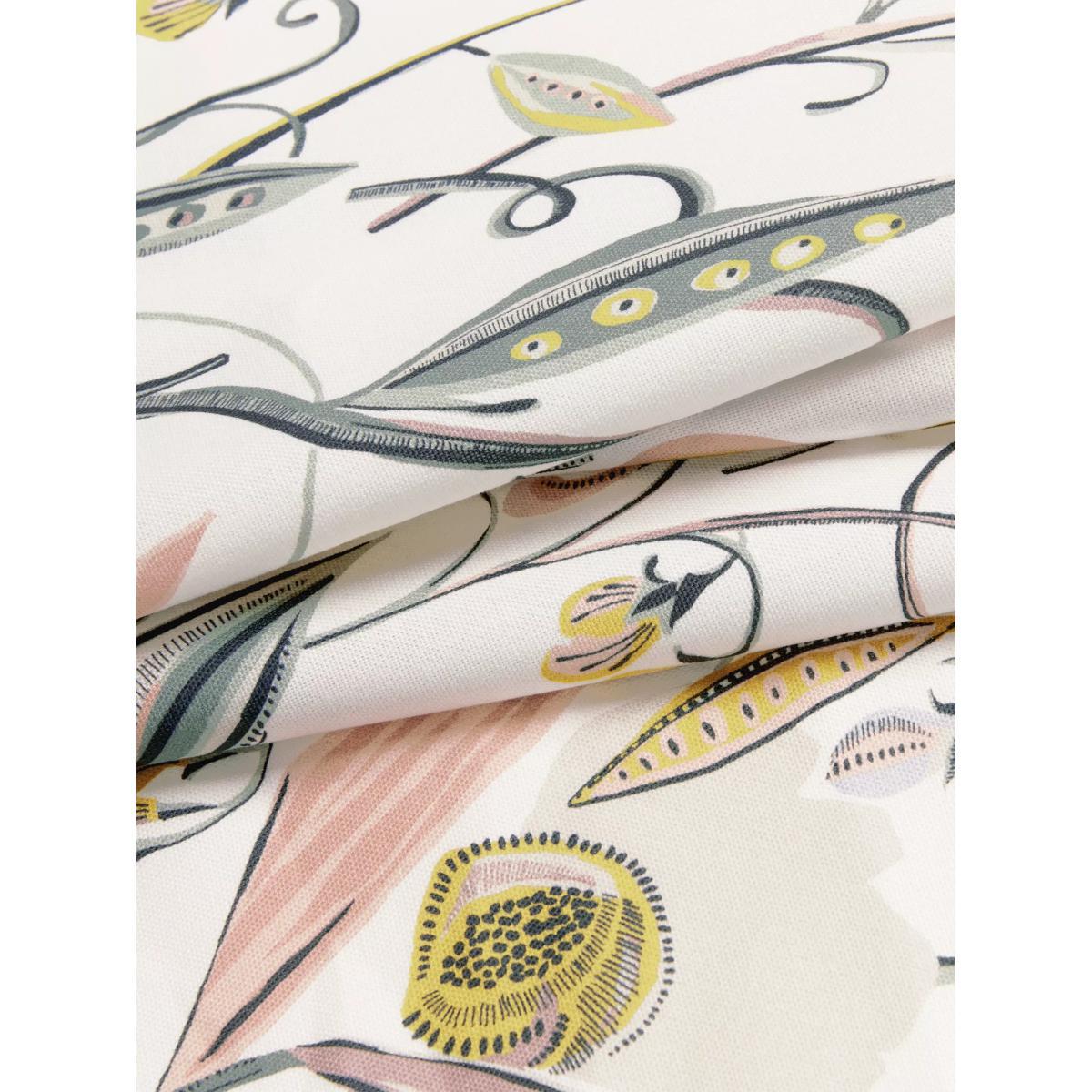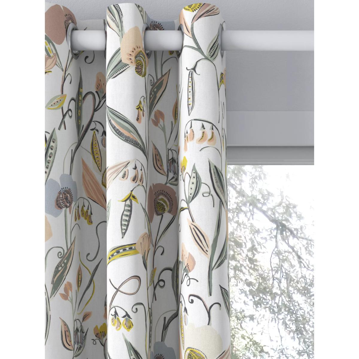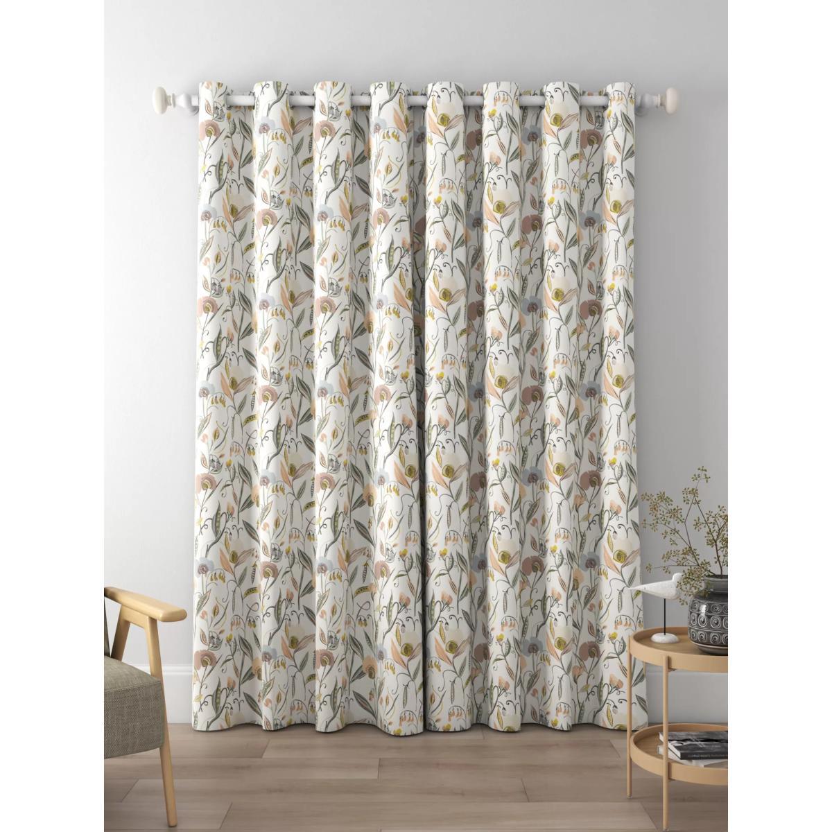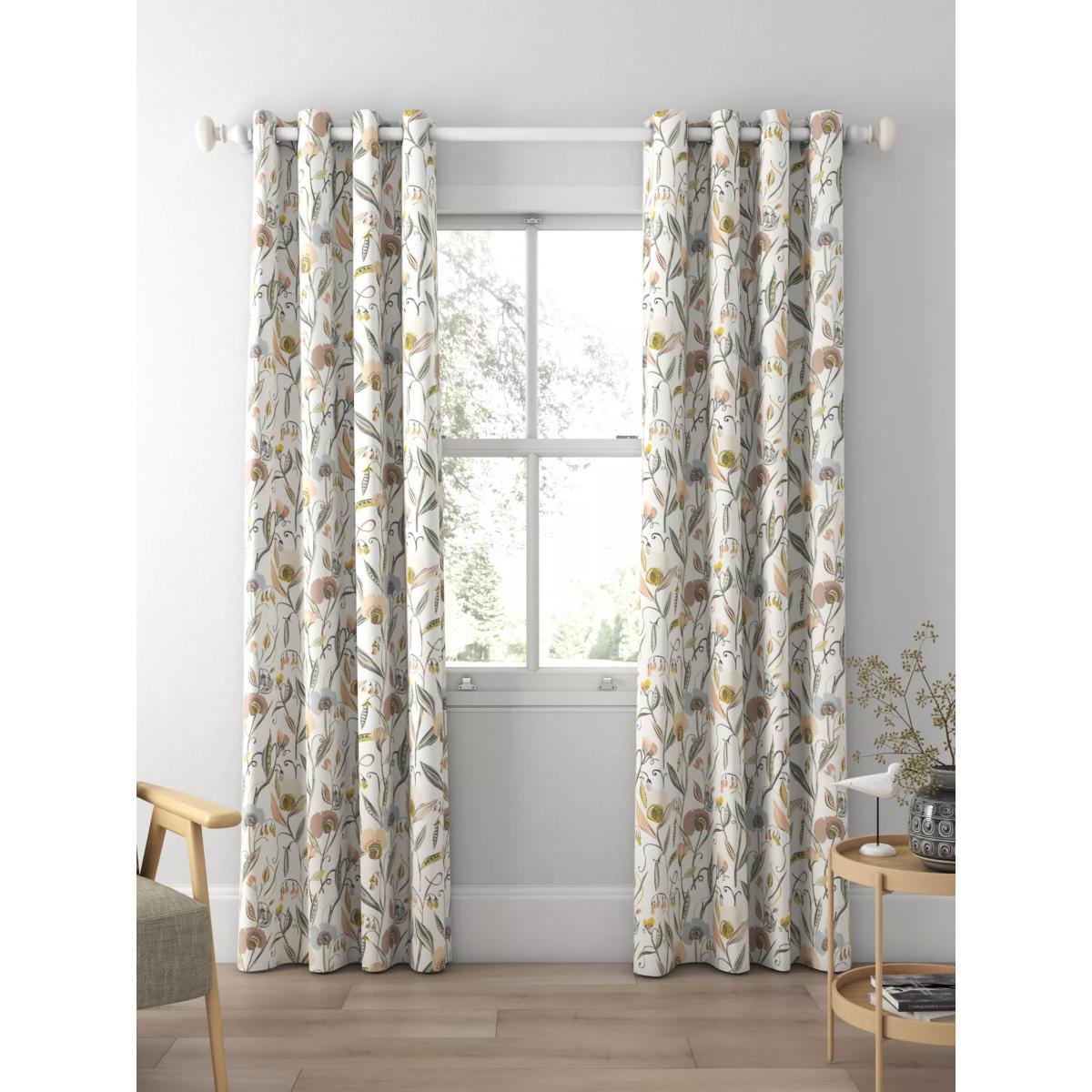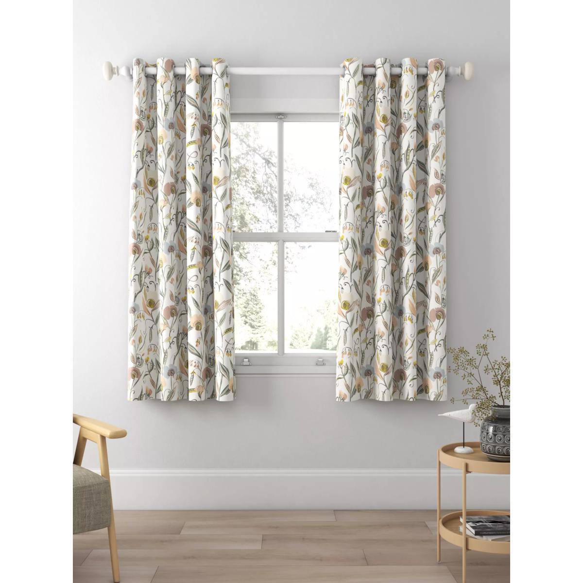 The stylised floral design on these curtains was inspired by the Hans Christian Andersen story "The Pea Blossom", and shows pretty pea flowers and leaves twisting around one another. The eyelet heading creates large folds and the blackout lining helps improve their drape as well as completely blocking out light. Warm in winter, cool in summer As the blackout lining on these curtains blocks out sunlight they help keep your room cool as well as dark. This lining also adds an extra layer of insulation to the curtains, giving them the added benefit of being thermal. They protect against both heat loss and heat gain, regulating the temperature of your room so you're kept warm in winter and cool in summer. Choosing the right size These curtains can be hung with a pole or track using curtain hooks (not included). There are three hook positions on the heading, allowing you to choose how your curtains sit against the track or pole. For example, if you're using a track you may want to use the middle or lower row of hooks to cover the track, whereas if you're using a pole you may want to use the top row of hooks so the curtains hang below the rings. The specified drop is taken from the top row of hook pockets to the bottom edge of the curtain. The width stated indicates the size of one curtain panel when laid completely flat. This pack contains two panels, and the track/pole length we've recommended allows for the two panels to be gathered when the curtains are drawn. For a fuller look, increase the curtain width. One pair of 167cm width curtains will fit a curtain track/pole size of 133-167cm One pair of 228cm width curtains will fit a curtain track/pole size of 182-228cm Worth knowing... We package our curtains in recycled materials to keep them protected whilst they make their way to you. This means that when they arrive there could be some creases in them. We recommend you hang them for a few days to allow them to flatten and for the creases to fall out. If after this period your curtains still show signs of being folded then follow the ironing instructions on the back of the packaging. Be aware that each style of curtain has different ironing instructions, including heat limitations according to the fabric, so do make sure you follow the guidance provided to get the best results. Do you need a curtain pole and accessories? With great prices and great design, our new brand offers style and quality for modern living today. Whatever you need, there's joy to be found in.