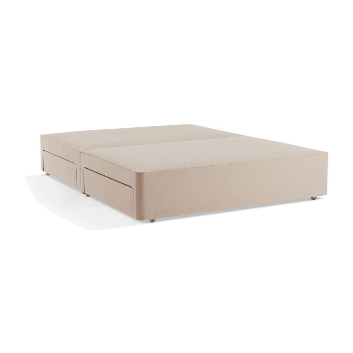 This upholstered divan base is made from sturdy and responsibly-sourced pine wood and features layers of HD pocket springs that provide a responsive foundation for your mattress. Working especially well with a pocket spring mattress, the springs in the base pivot in response to your movements and map to the exact shape of your body, so you feel supported while you sleep and wake feeling refreshed. Two spacious soft-close drawers on either side of the frame are great for extra storage, especially if space is limited in your bedroom. We've upholstered this divan base in our Topaz fabric which is woven to create a linen-style effect. Want to see it first? You may want to see and get a feel for the furniture in one of our shops before ordering. We'll be able to tell you where the range you'd like to view is on display.