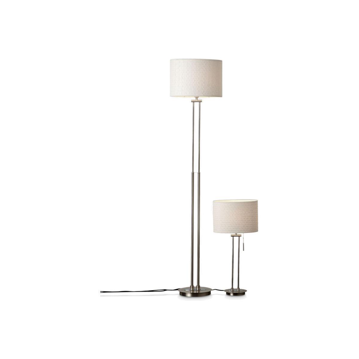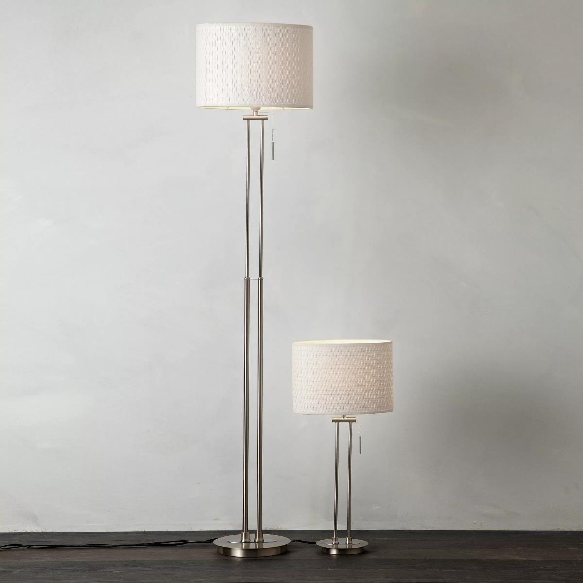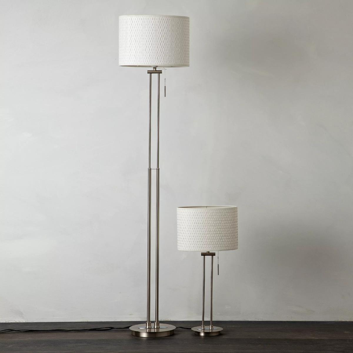 Cord-operated table and floor lamp duo. Each has a twin stem stainless steel base and white textured cylinder shade.