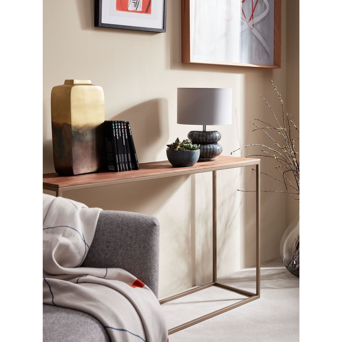 With a focus on minimalist design and natural materials, our Raise range marries tactile walnut wood with sleek, metal frames. Each piece of furniture has a clean-lined, functional design that highlights the individual pattern of warm wood grains. Ideal for hallways or smaller spaces, this console table is provides a spacious surface top. The painted metal frame complements the natural tone of the walnut wood and it's easy to place in both traditional and more modern interior settings. Care for your console table To preserve the wood and keep your table looking its best, we recommend treating it with oil before use and whenever necessary. It should ideally be treated every three months. Want to see it first? You may want to see and get a feel for the furniture in one of our shops before ordering. We'll be able to tell you where the range you'd like to view is on display.