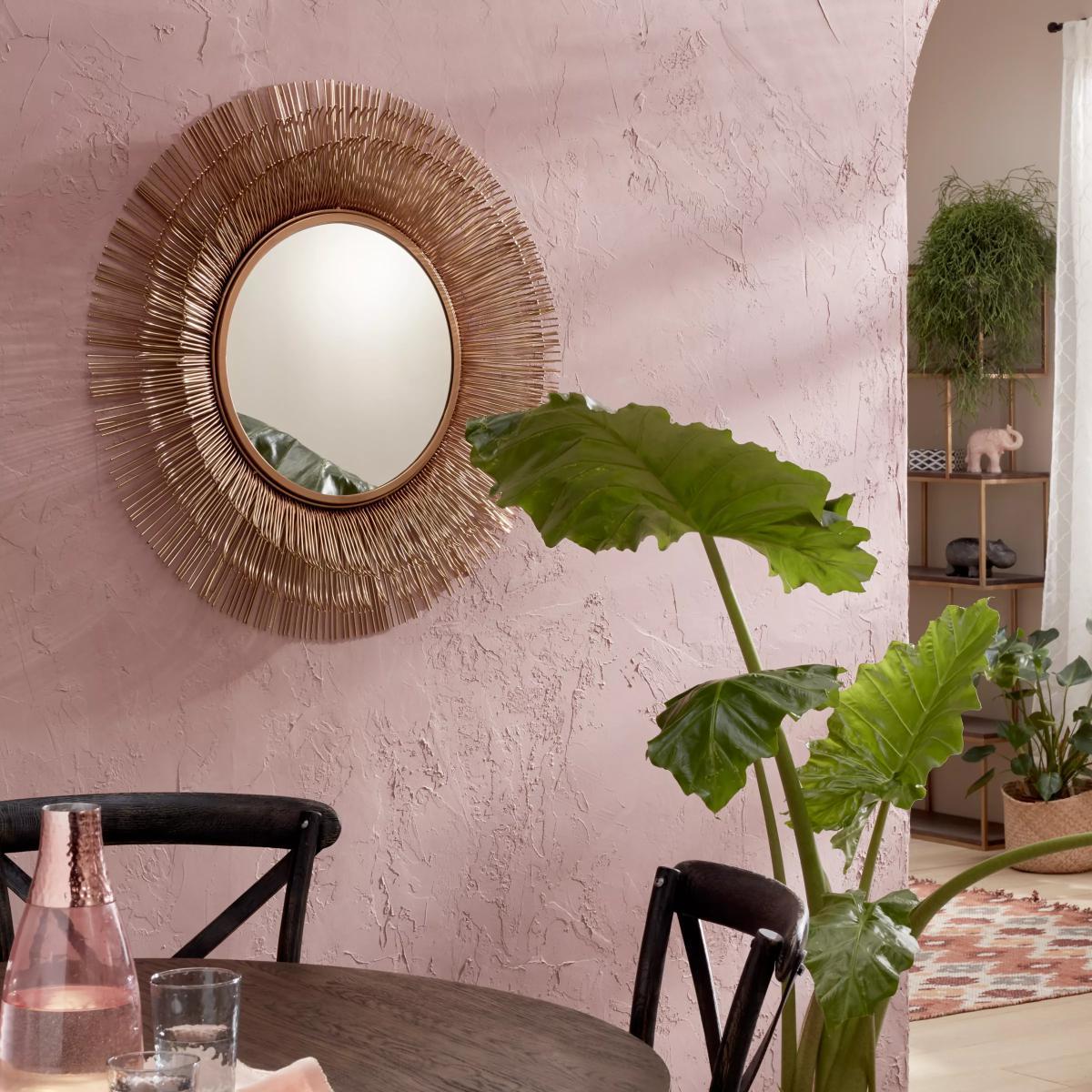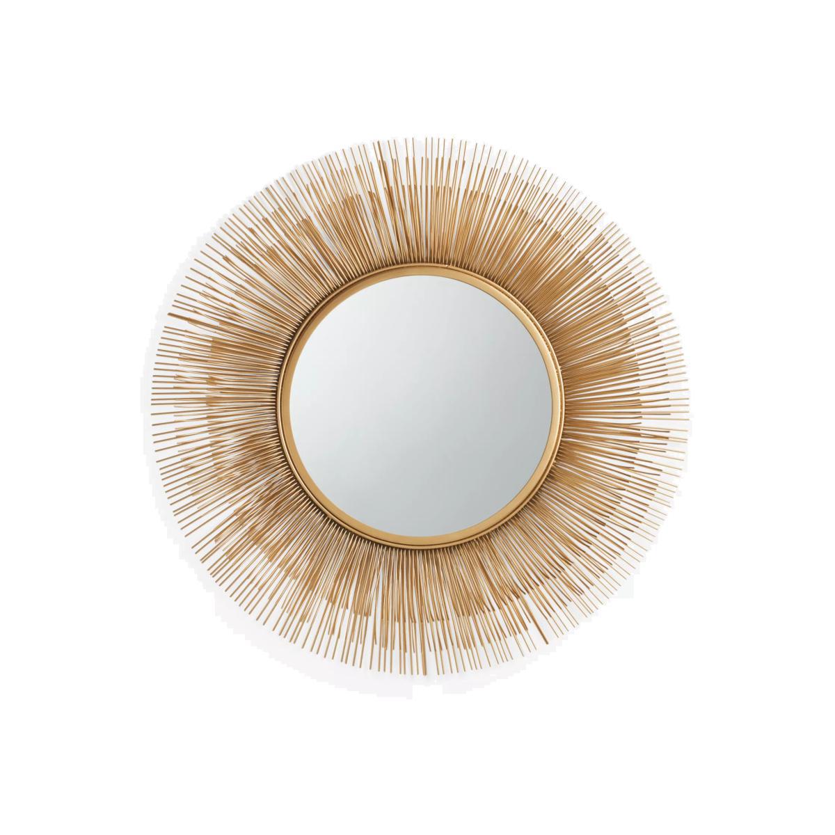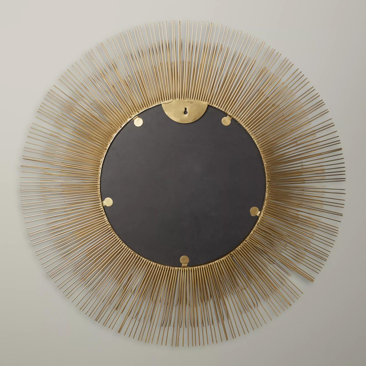 I love this round mirror because it combines practicality with a striking design. The gold finish adds a touch of warmth and luxury, making it a versatile piece that can elevate both contemporary and eclectic interiors. It works particularly well in living rooms, hallways, or bedrooms where you want a statement piece that also provides functional reflection. For styling tips, consider pairing it with natural textures or layered with other metallic accents to create visual interest. Its sizeable diameter makes it ideal for making smaller spaces feel larger and brighter. Keep the surrounding decor simple to let the intricate rays really stand out or use it as a focal point with curated decorative items around it.