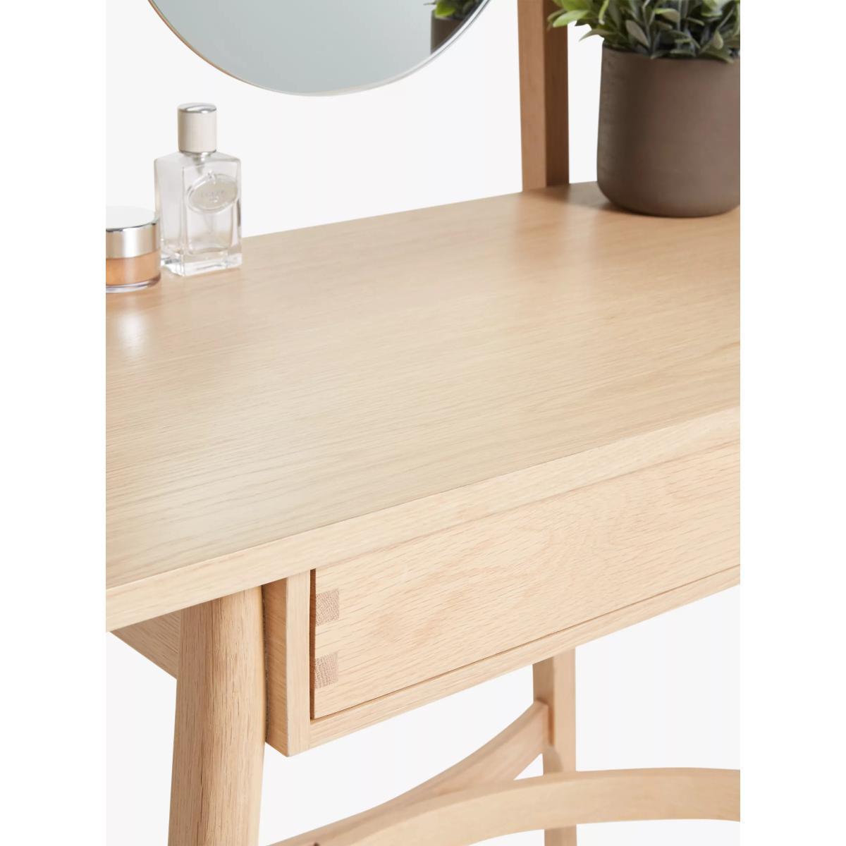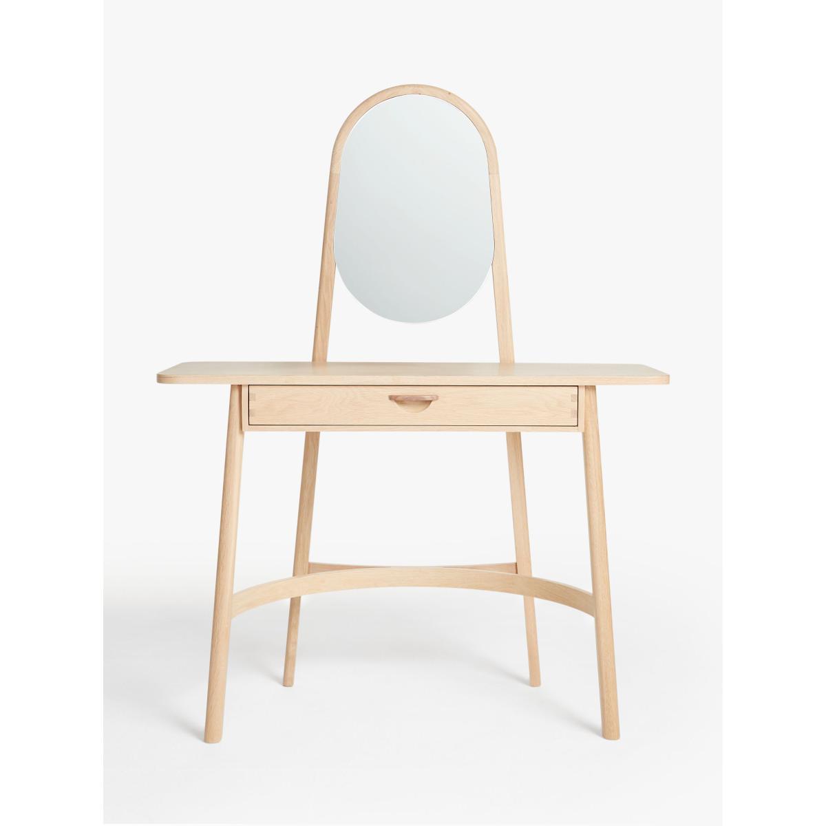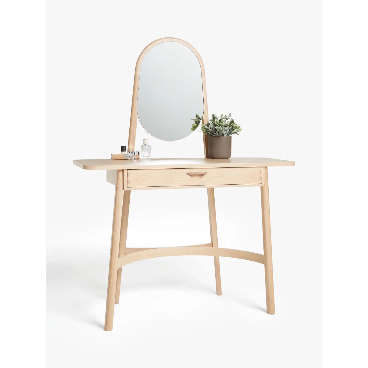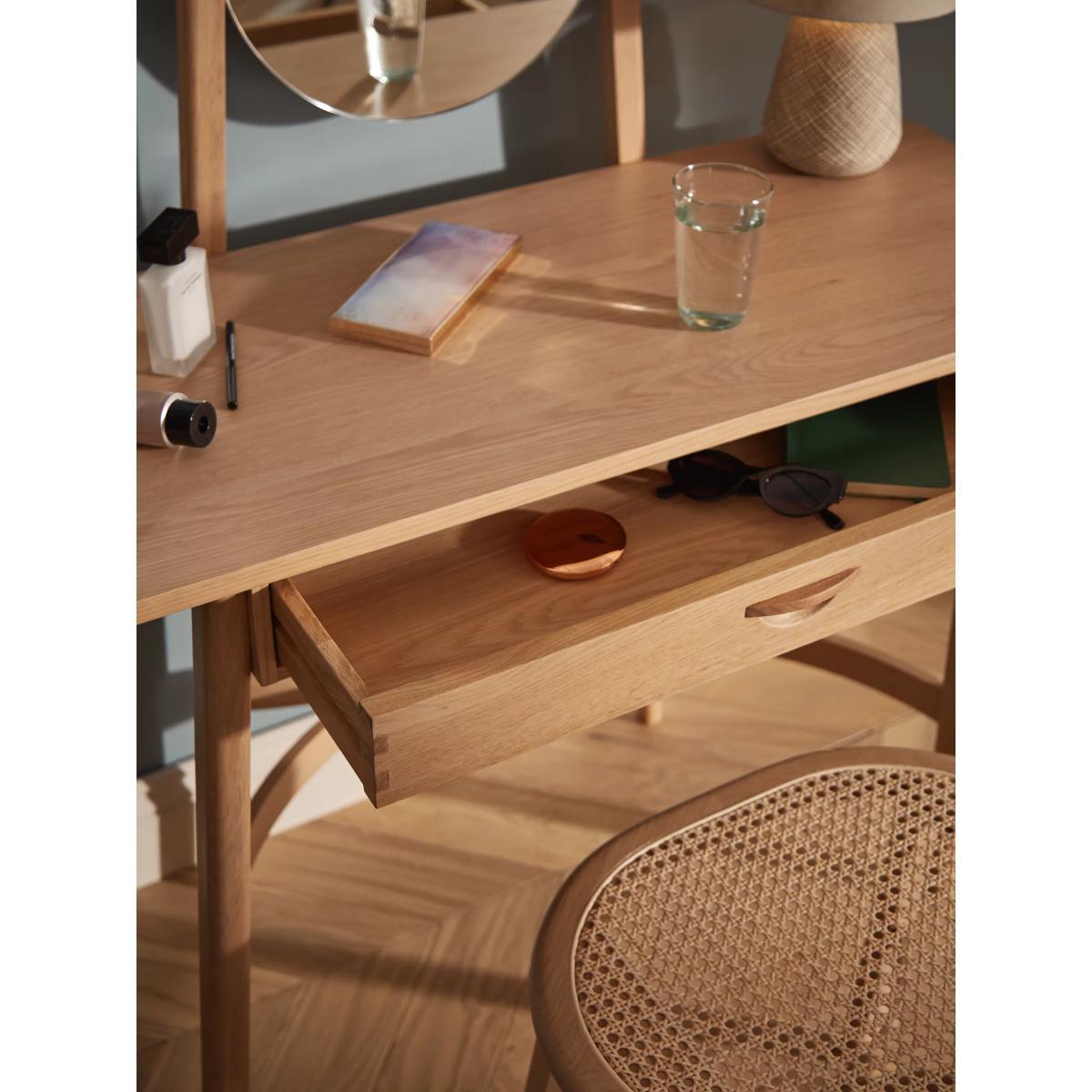 Our Rattan range of bedroom furniture is ideal for farmhouse-inspired interiors, thanks to a solid oak and veneer construction that showcases steam-bent wood and dovetail joint details. This practical dressing table and mirror features one storage drawer and and has a natural or painted finish that highlights the real wood grain. With curved edges and rounded legs that lend a softer design focus, it's a timeless and space-saving option for your bedroom. Want to see it first? You may want to see and get a feel for the furniture in one of our shops before ordering. We'll be able to tell you where the range you'd like to view is on display.