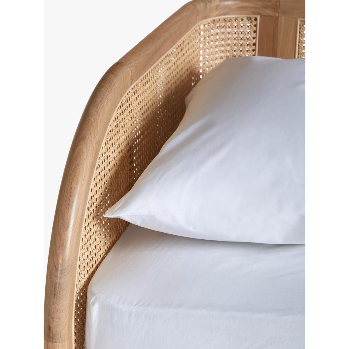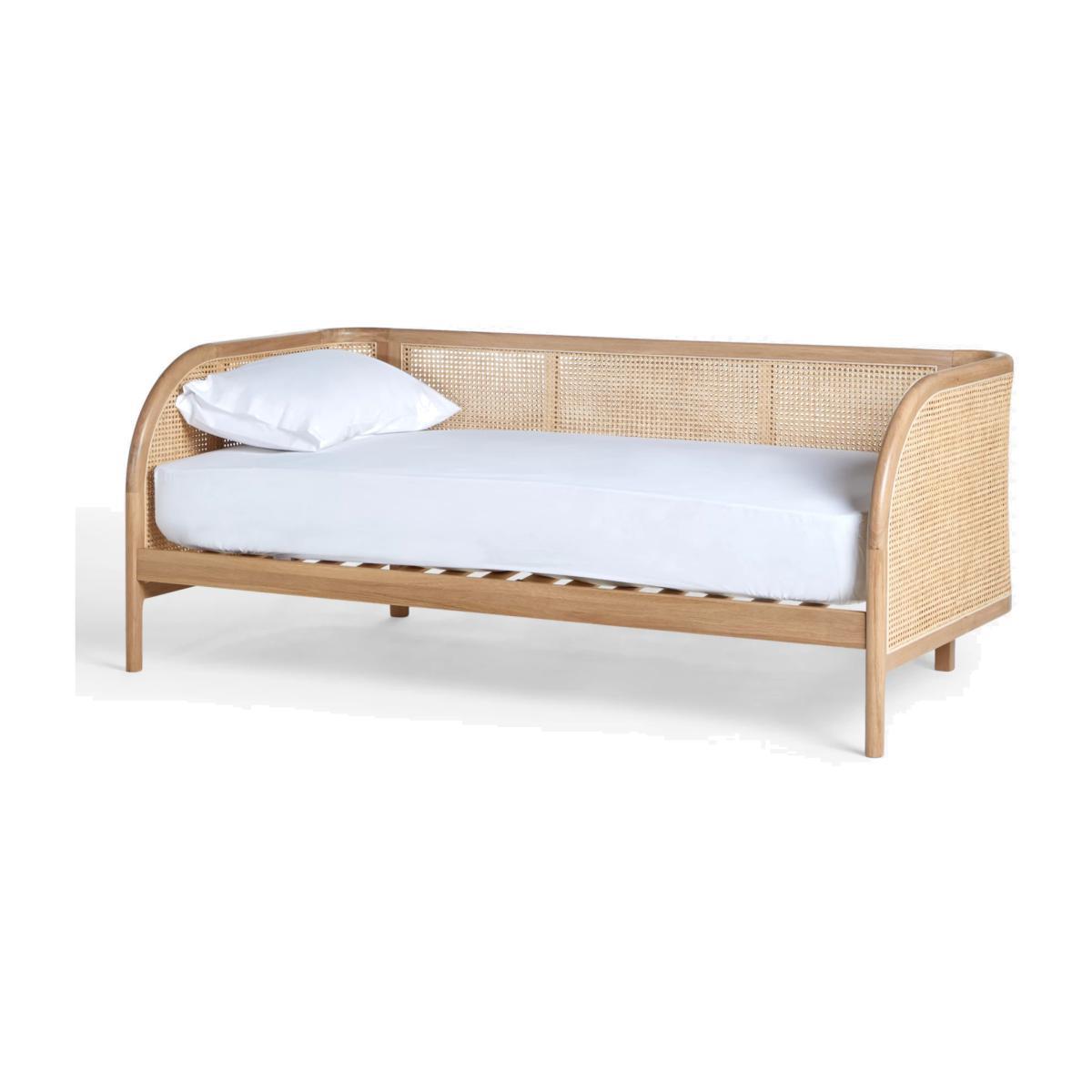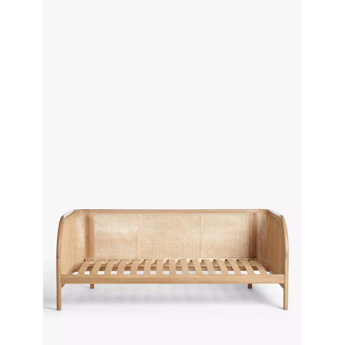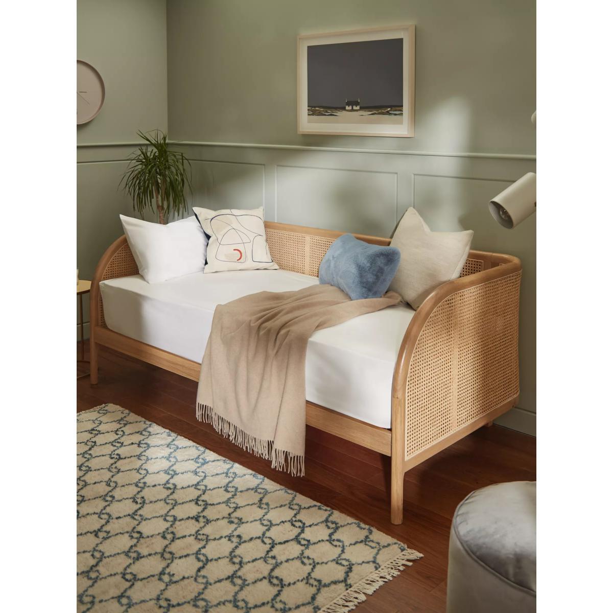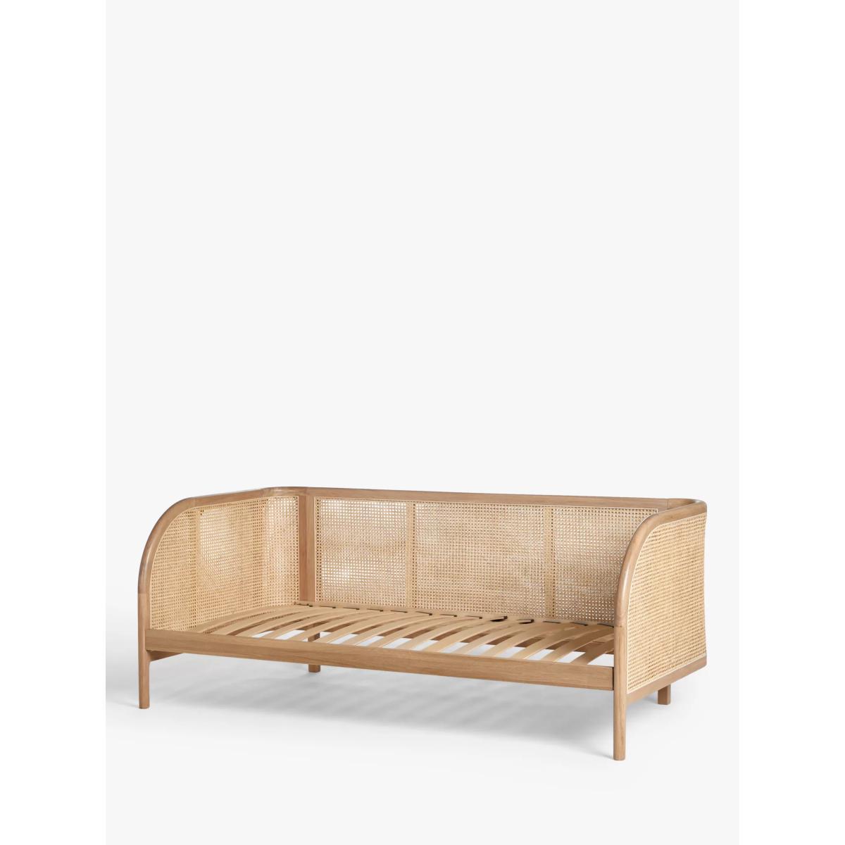 Curate a calming, serene environment in your bedroom with furniture made from authentic, natural materials in a neutral colour palette. This guest bed is made from solid oak with a touch of robust MDF and its curved frame is made from airy rattan. With its sleek finish, rounded edges and combination of textures, it's just the right style for a considered and simple, yet inviting sleep space. Sprung slats provide a responsive base for your mattress. Want to see it first? You may want to see and get a feel for the furniture in one of our shops before ordering. We'll be able to tell you where the range you'd like to view is on display.