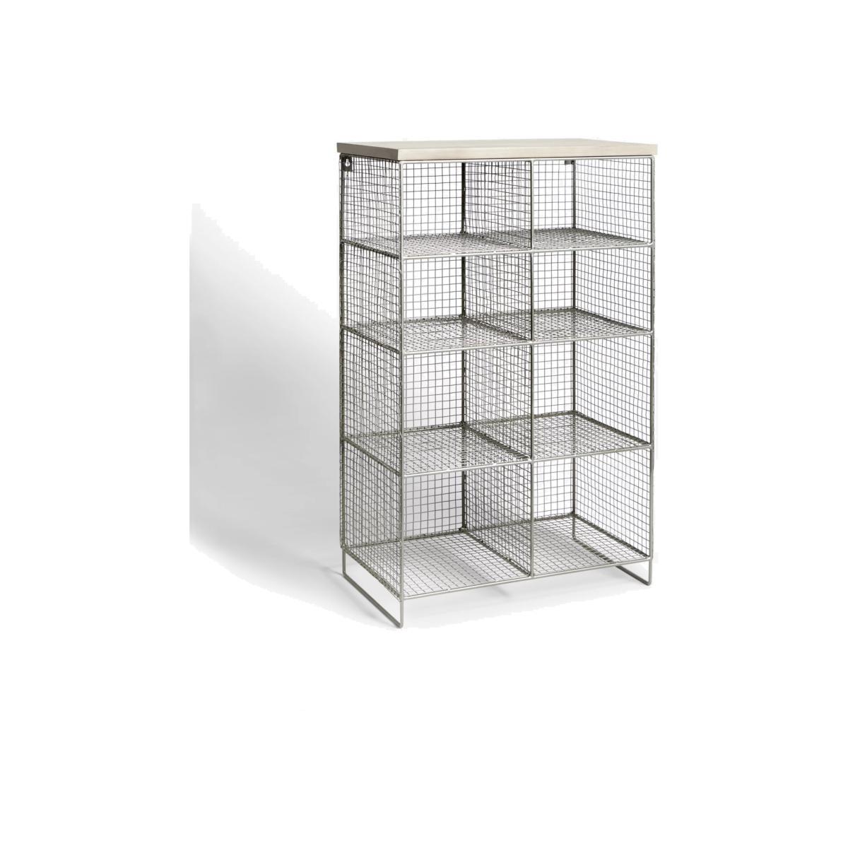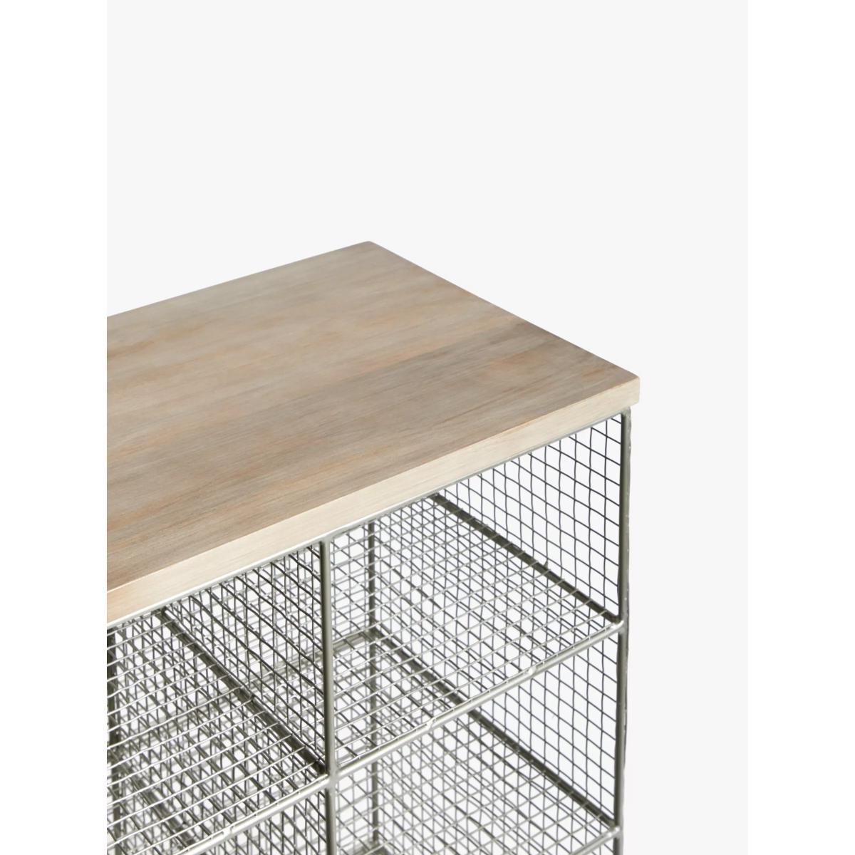 A handmade shoe rack combining metal and wood materials. Ideal for organising hall space or cupboards the 8 cubby holes are well-sized for storing boots and shoes with a shelf on top for bags and other items. Top 4 cubby holes: H17 x W26 x D33cm Bottom 4 cubby holes: H22 x W26 x D33cm