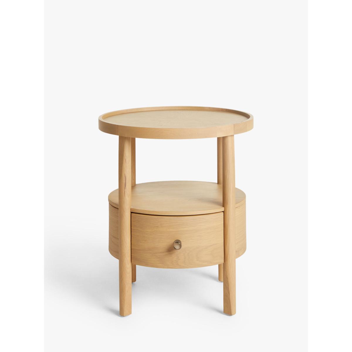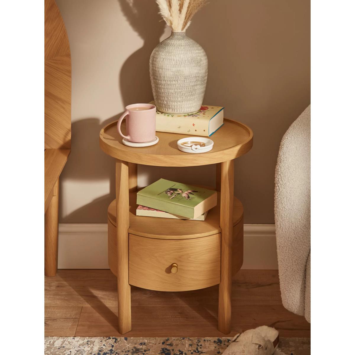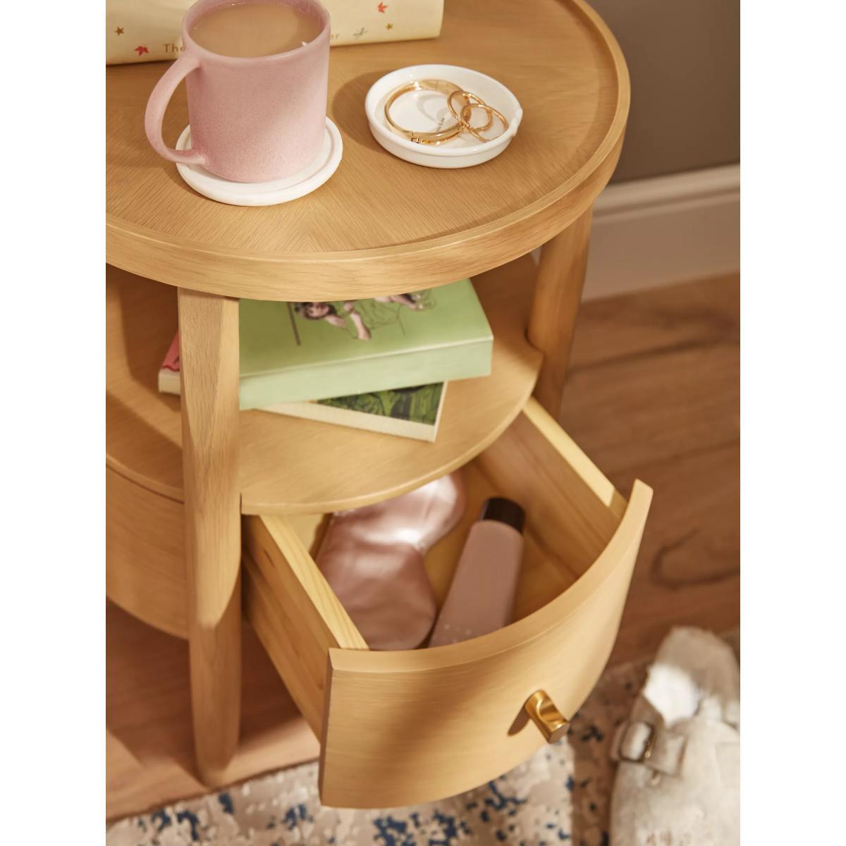 At the heart of the Nordic-inspired furniture trend is natural materials and carefully considered shapes. This bedside table honours those design principles thanks to its round profile, smooth, spindle-shaped legs and warm, natural finish. It's made from a combination of high-quality timbers including solid oak, pine wood and MDF and the shelves and drawer provide just the right amount of space for your bedside essentials. We also like the tray-edge finish of the top shelf which will help to keep your items secure. Want to see it first? You may want to see and get a feel for the furniture in one of our shops before ordering. We'll be able to tell you where the range you'd like to view is on display.