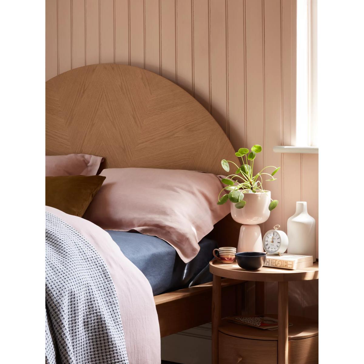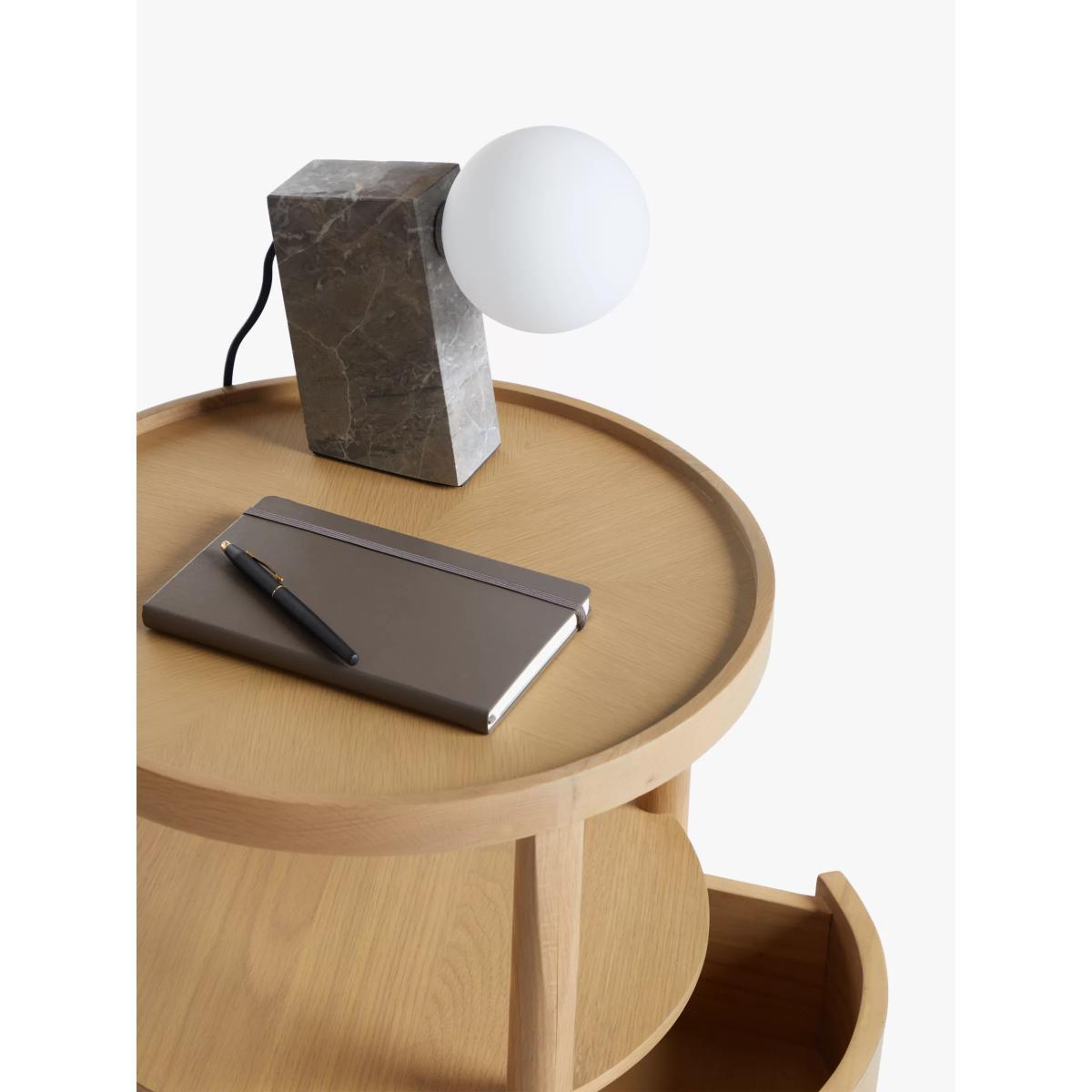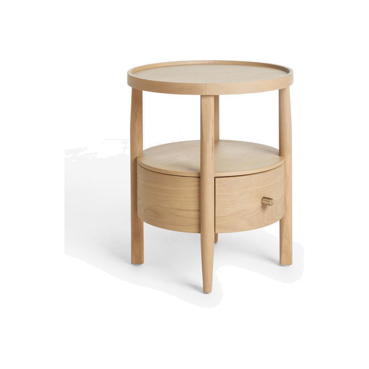 At the heart of the Nordic-inspired furniture trend is natural materials and carefully considered shapes. This bedside table honours those design principles thanks to its round profile, smooth, spindle-shaped legs and warm, natural finish. It's made from a combination of high-quality timbers including solid oak, pine wood and MDF and the shelves and drawer provide just the right amount of space for your bedside essentials. We also like the tray-edge finish of the top shelf which will help to keep your items secure. Want to see it first? You may want to see and get a feel for the furniture in one of our shops before ordering. We'll be able to tell you where the range you'd like to view is on display.