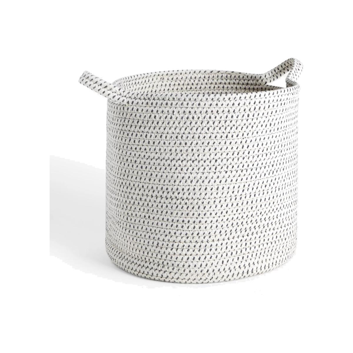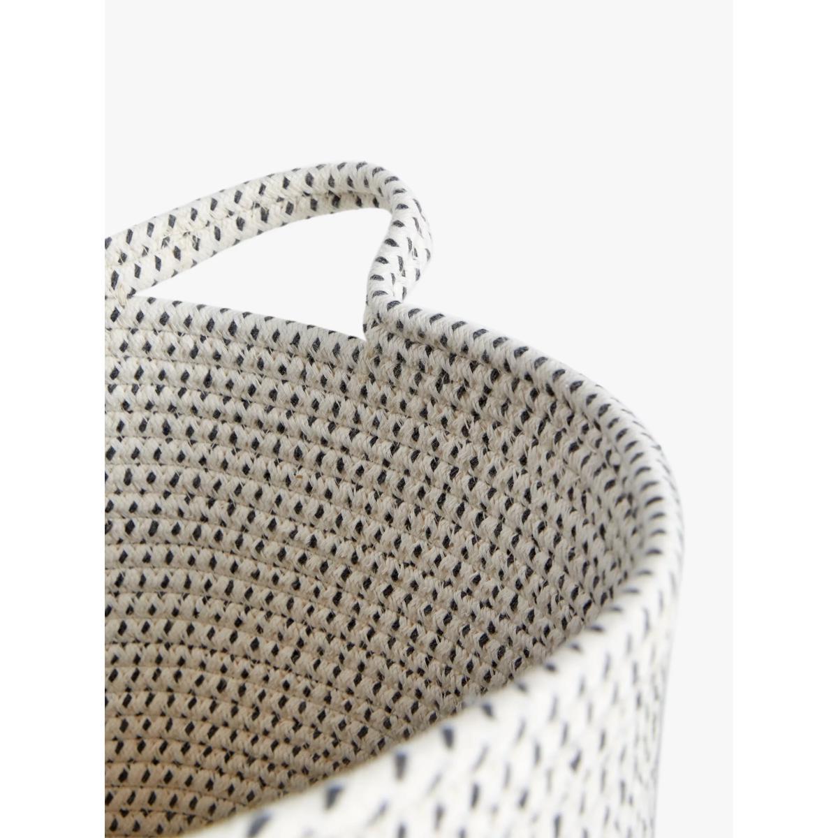 This practical basket is made from from a thick synthetic and cotton rope, it's sturdy and easy to transport and can be tucked into shelves or cube units when you want to pack it away.