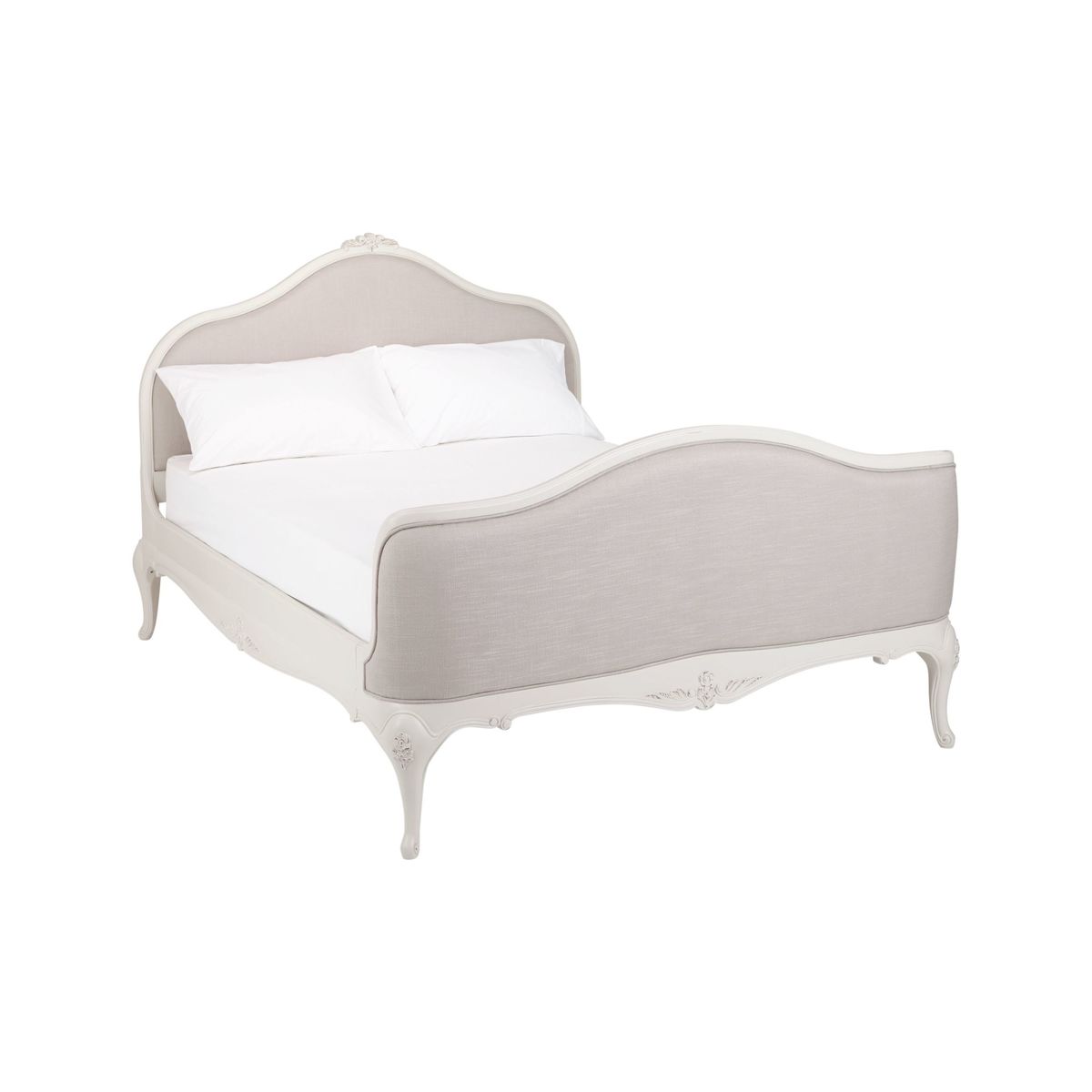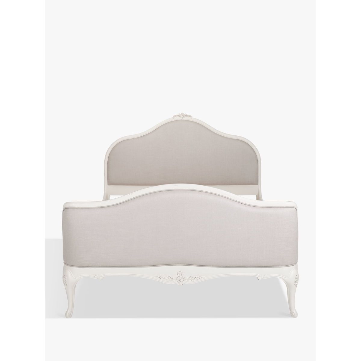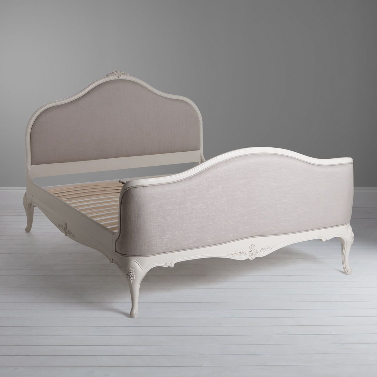 Lend bedroom interiors a sense of subtle sophistication with our Rose furniture range. Featuring stunning craftsmanship with hand carved detailing, a hand painted finish, and hand distressed effects, each piece oozes rustic character. Team up with tactile linen bedding, opulent crystal drop lighting and plenty of treasured trinkets to complete a scene of tranquility that's totally personal to you. This bedstead incorporates a beautifully curved upholstered headboard and footend, with pretty hand carved floral motifs accenting the calming grey colourway. The frame is made from solid birch, birch veneers and MDF for a strong and durable construction. Sprung birch slats offer responsive support when paired with a quality mattress, helping you achieve a quality night's sleep.