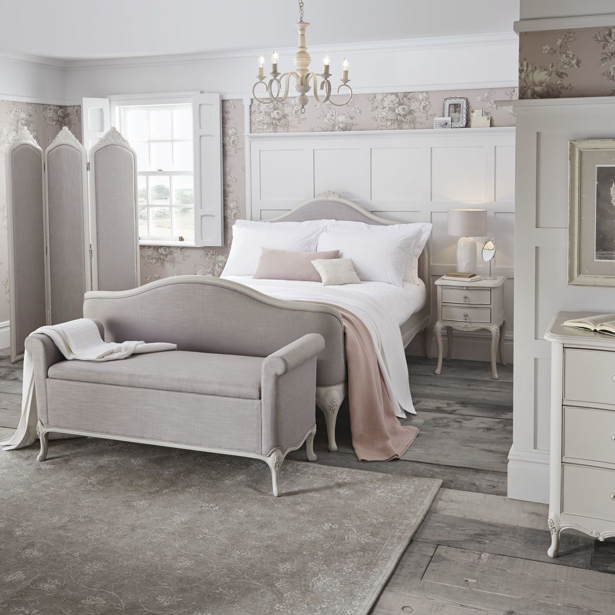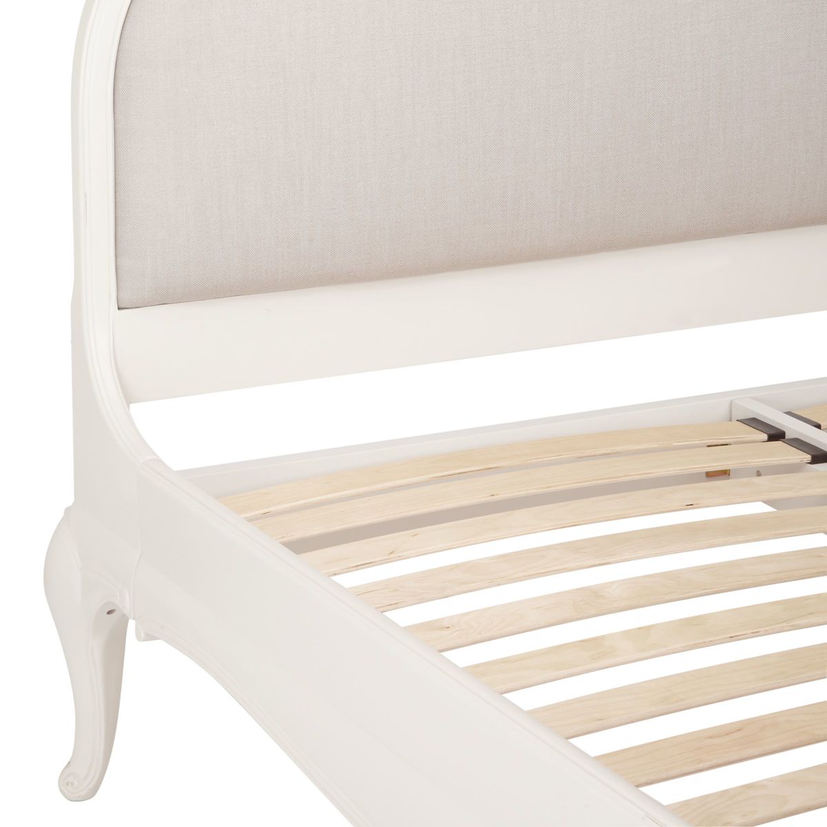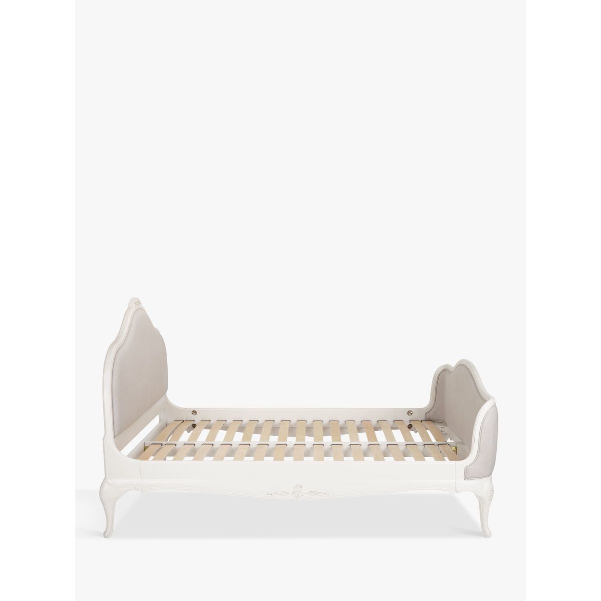 Lend bedroom interiors a sense of subtle sophistication with our Rose furniture range. Featuring stunning craftsmanship with hand carved detailing, a hand painted finish, and hand distressed effects, each piece oozes rustic character. Team up with tactile linen bedding, opulent crystal drop lighting and plenty of treasured trinkets to complete a scene of tranquility that's totally personal to you. This bedstead incorporates a beautifully curved upholstered headboard and footend, with pretty hand carved floral motifs accenting the calming grey colourway. The frame is made from solid birch, birch veneers and MDF for a strong and durable construction. Sprung birch slats offer responsive support when paired with a quality mattress, helping you achieve a quality night's sleep.