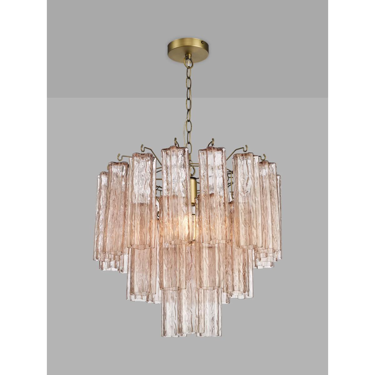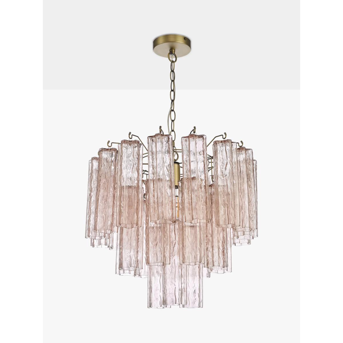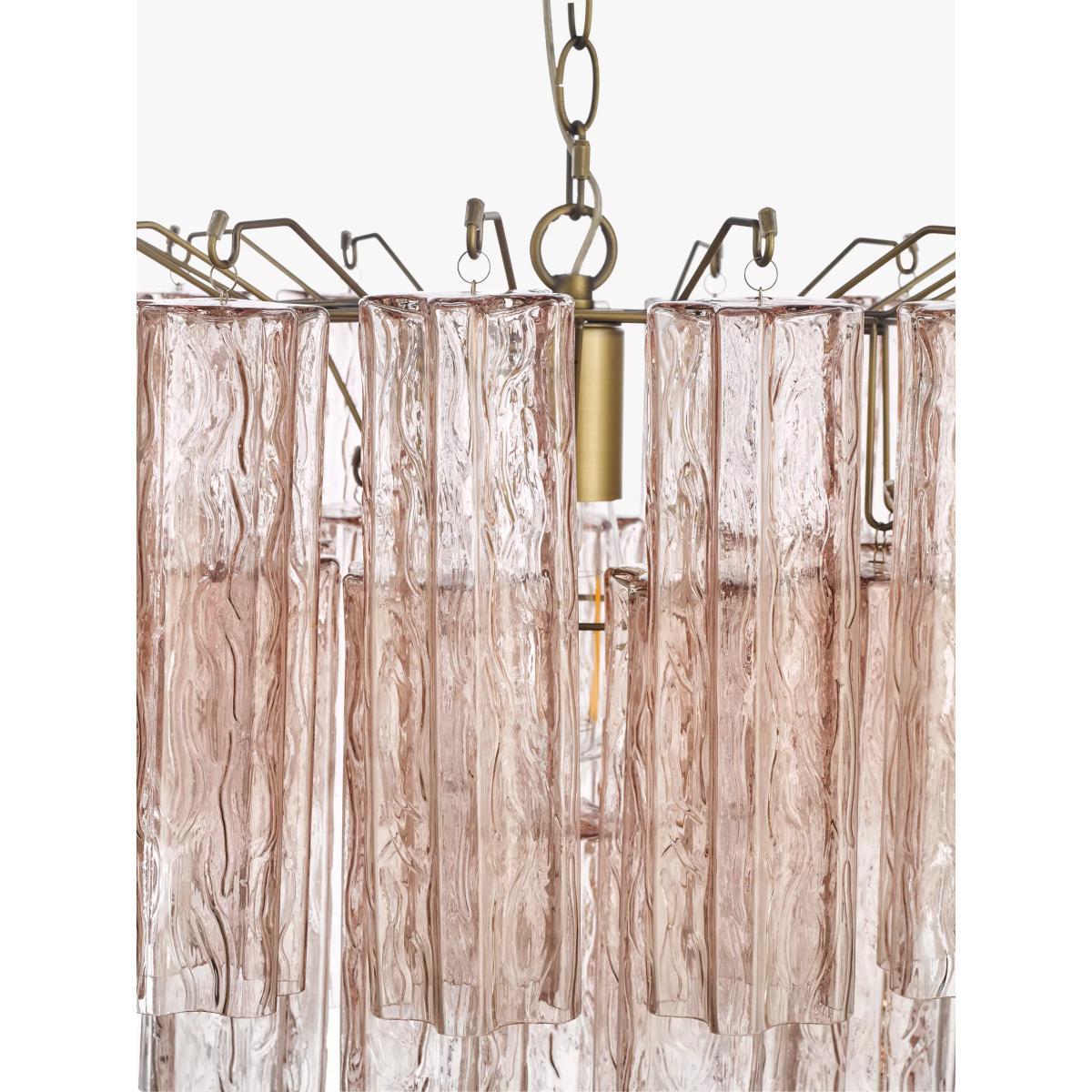 This beautiful ceiling light will steal attention in your home. We've made it from fluted cylinders of blush pink-tinted textured glass which has a subtle ombre effect. The glass droplets cascade in a waterfall effect that's soft and delicate in style. Plus, antique-brass finished metal nods to a vintage look. It's a brilliant way to introduce colour and texture into your space, while drawing your decor together.