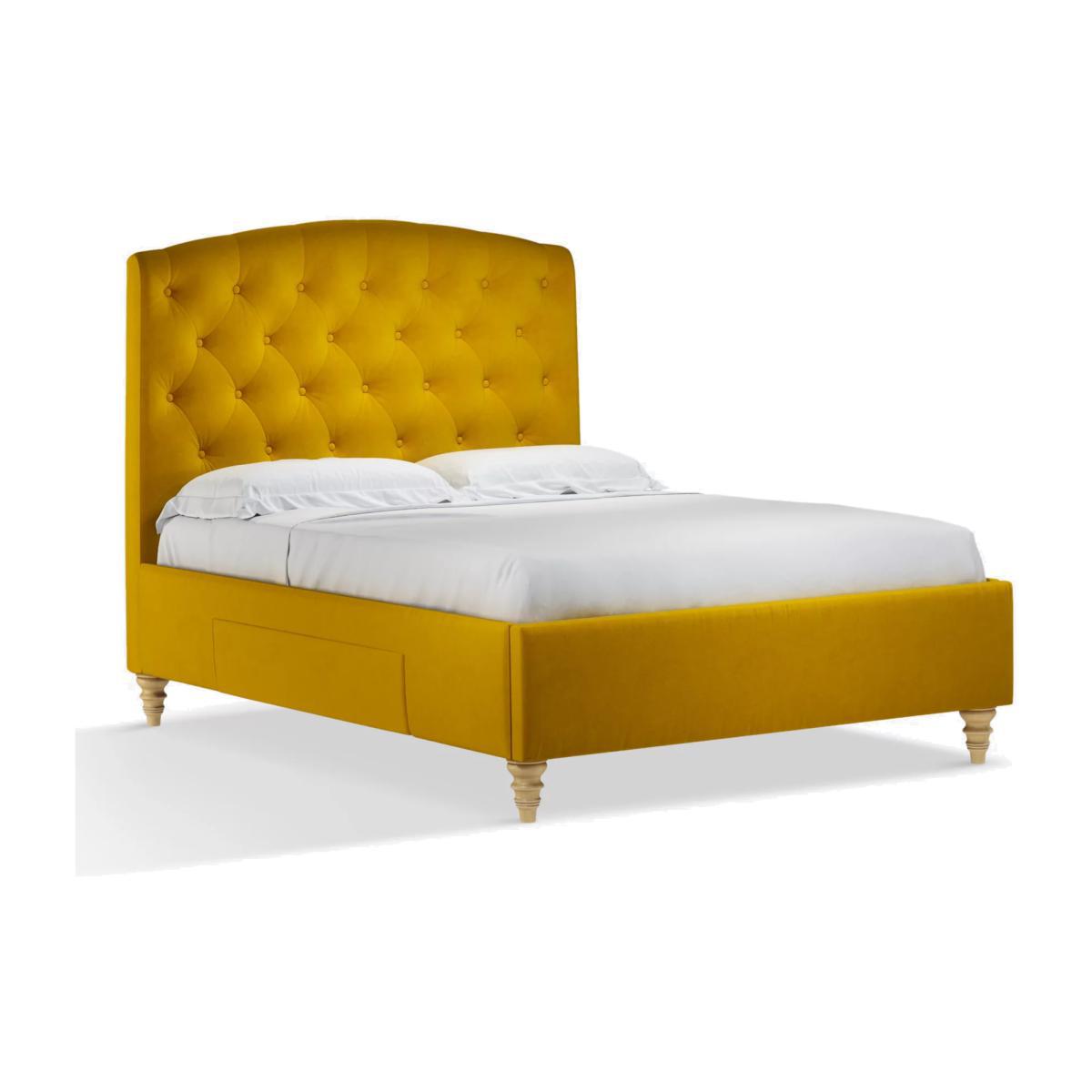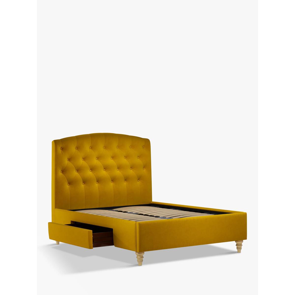 Our Rouen storage bed frame has a classic design that's enhanced with button detailing across the headboard. There's a soft-close drawer on either side of the frame that's brilliant for storing spare linens. Sprung slats provide additional support for you and your mattress. Built with Smart Slats This bed frame is designed with wider slats at the shoulders, lumbar and feet. They provide maximum support for you and your mattress so that you experience perfect spinal alignment while you sleep. The standard slat caps are black so we have added grey slat caps to ensure that you know where to place the wider slats. Choose from one of our fabrics: Our Band A fabric, Topaz is woven to create a linen-effect feel Our Band A fabric, Saga is woven with man-made fibres, making it exceptionally durable and versatile Our Band B fabric, Erin has a velvet-style, chenille feel. It's woven with man-made fibres to create a beautifully soft yarn and can appear two-tone in different lights Our Band B fabric, Opulence is a soft and luxurious velvet-like fabric Our Band B fabric, Mole is a soft and cosy woven wool-blend. Piling and bobbling may occur naturally over time Our Band B fabric, Relaxed Linen is durable, resilient and versatile, woven from man-made and natural fibres Our Band C fabric, Aquaclean Harriet is made from a short, dense pile of velvet that has a soft, brushed finish. An Aquaclean treatment has been applied to this resilient fabric which means you can banish the majority of household stains with water. The treatment covers every fibre with an invisible coating so it doesn't need to be retreated or re-coated. It will naturally develop lines, scuffs and shading over time. Want to see it first? You may want to see and get a feel for the furniture before ordering. Pop into one of our shops to see the full range of colours and fabrics on offer. We'll be able to tell you where the range you'd like to view is on display.