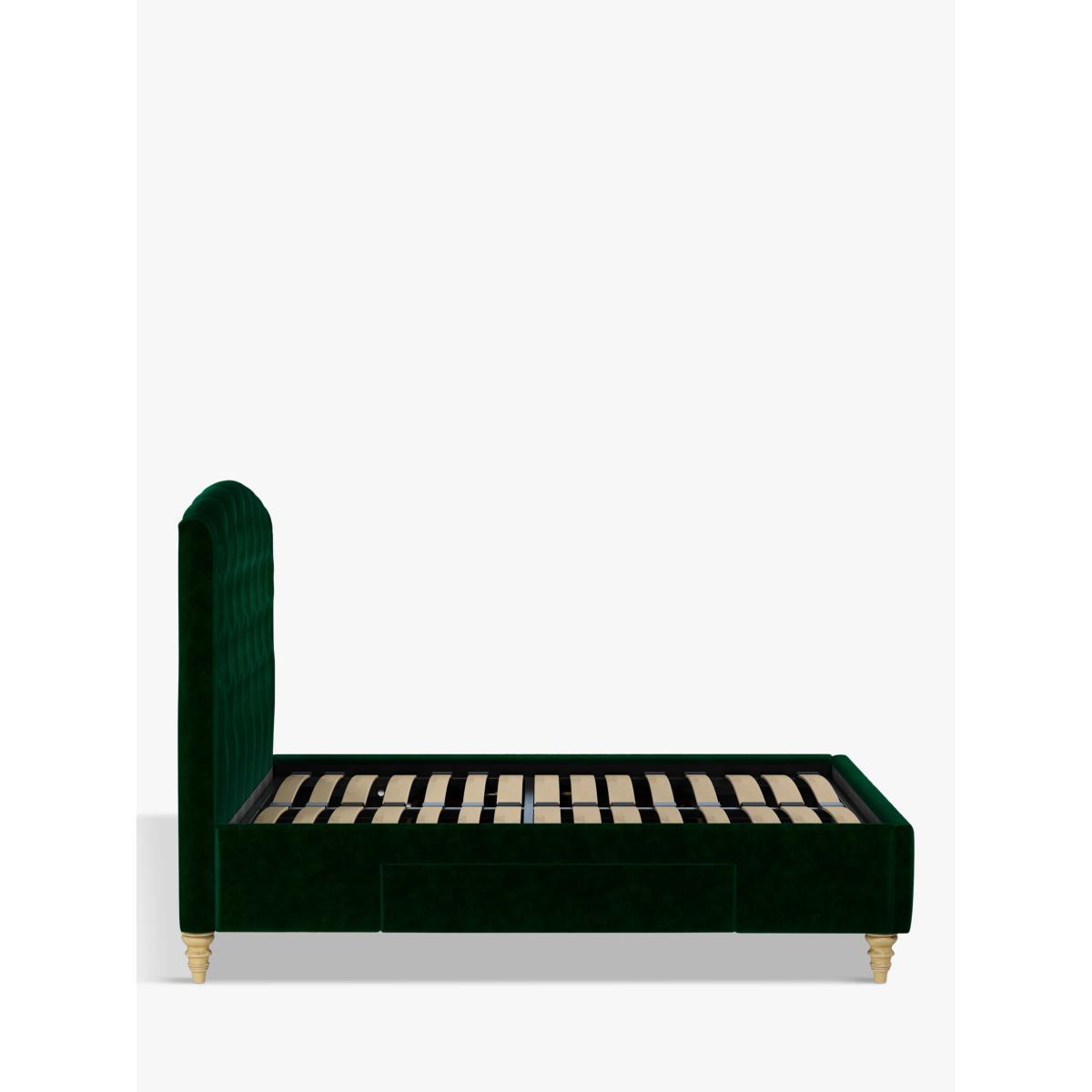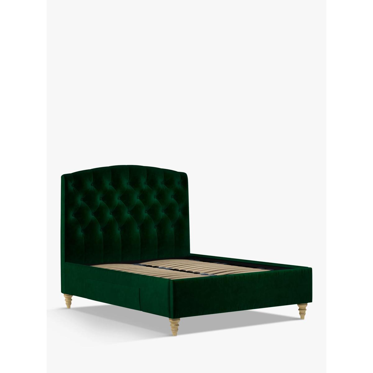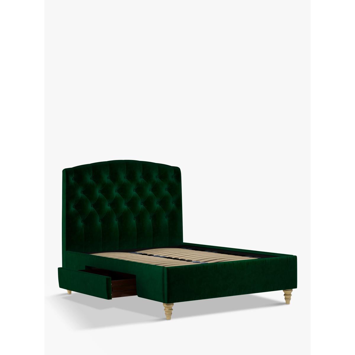 Our Rouen storage bed frame has a classic design that's enhanced with button detailing across the headboard. There's a soft-close drawer on either side of the frame that's brilliant for storing spare linens. Sprung slats provide additional support for you and your mattress. Built with Smart Slats This bed frame is designed with wider slats at the shoulders, lumbar and feet. They provide maximum support for you and your mattress so that you experience perfect spinal alignment while you sleep. The standard slat caps are black so we have added grey slat caps to ensure that you know where to place the wider slats. Choose from one of our fabrics: Our Band A fabric, Topaz is woven to create a linen-effect feel Our Band A fabric, Saga is woven with man-made fibres, making it exceptionally durable and versatile Our Band B fabric, Erin has a velvet-style, chenille feel. It's woven with man-made fibres to create a beautifully soft yarn and can appear two-tone in different lights Our Band B fabric, Opulence is a soft and luxurious velvet-like fabric Our Band B fabric, Mole is a soft and cosy woven wool-blend. Piling and bobbling may occur naturally over time Our Band B fabric, Relaxed Linen is durable, resilient and versatile, woven from man-made and natural fibres Our Band C fabric, Aquaclean Harriet is made from a short, dense pile of velvet that has a soft, brushed finish. An Aquaclean treatment has been applied to this resilient fabric which means you can banish the majority of household stains with water. The treatment covers every fibre with an invisible coating so it doesn't need to be retreated or re-coated. It will naturally develop lines, scuffs and shading over time. Want to see it first? You may want to see and get a feel for the furniture before ordering. Pop into one of our shops to see the full range of colours and fabrics on offer. We'll be able to tell you where the range you'd like to view is on display.