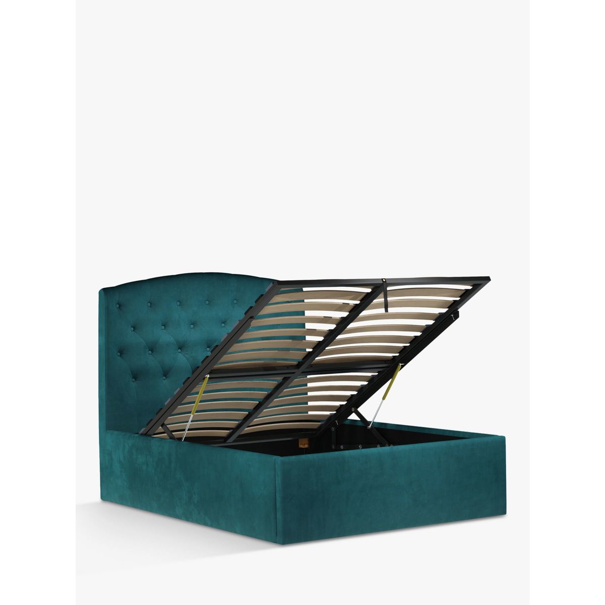 Our Rouen ottoman storage bed frame has a classic design that's enhanced with button detailing across the headboard. A handle and hydraulic arms facilitate an easy manual lift-up, revealing a functional and spacious storage space for spare linens. Sprung slats provide additional support for you and your mattress. Built with Smart Slats This bed frame is designed with wider slats at the shoulders, lumbar and feet. They provide maximum support for you and your mattress so that you experience perfect spinal alignment while you sleep. The standard slat caps are black so we have added grey slat caps to ensure that you know where to place the wider slats. Choose from one of our fabrics: Our Band A fabric, Topaz is woven to create a linen-effect feel Our Band A fabric, Saga is woven with man-made fibres, making it exceptionally durable and versatile Our Band B fabric, Erin has a velvet-style, chenille feel. It's woven with man-made fibres to create a beautifully soft yarn and can appear two-tone in different lights Our Band B fabric, Opulence is a soft and luxurious velvet-like fabric Our Band B fabric, Mole is a soft and cosy woven wool-blend. Piling and bobbling may occur naturally over time Our Band B fabric, Relaxed Linen is durable, resilient and versatile, woven from man-made and natural fibres Our Band C fabric, Aquaclean Harriet is made from a short, dense pile of velvet that has a soft, brushed finish. An Aquaclean treatment has been applied to this resilient fabric which means you can banish the majority of household stains with water. The treatment covers every fibre with an invisible coating so it doesn't need to be retreated or re-coated. It will naturally develop lines, scuffs and shading over time. Want to see it first? You may want to see and get a feel for the furniture before ordering. Pop into one of our shops to see the full range of colours and fabrics on offer. We'll be able to tell you where the range you'd like to view is on display.
