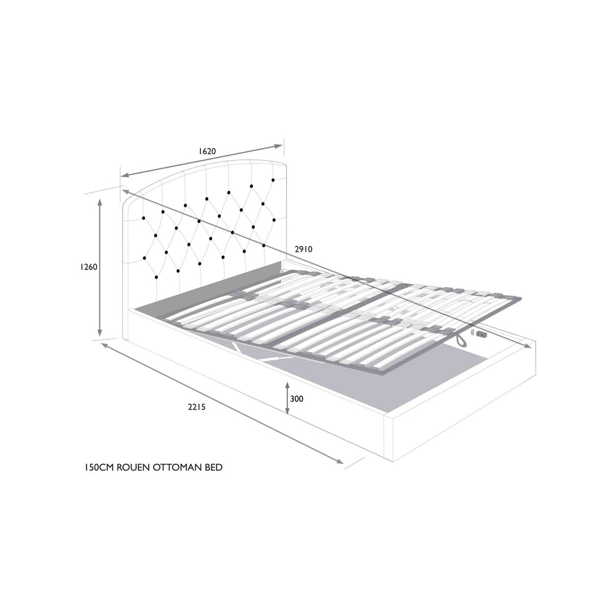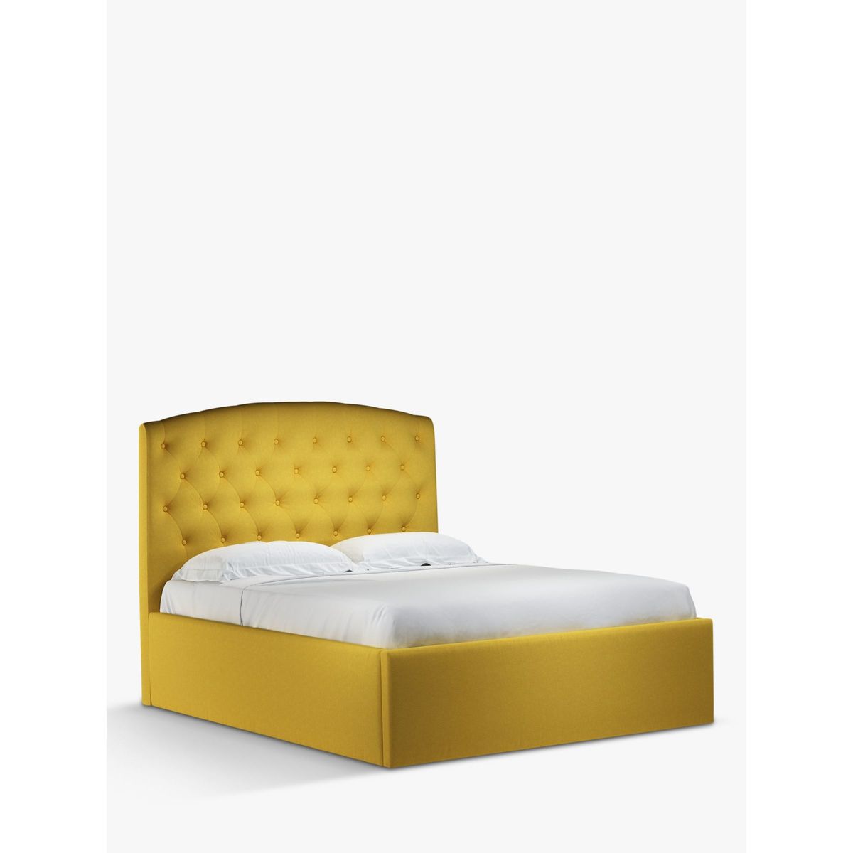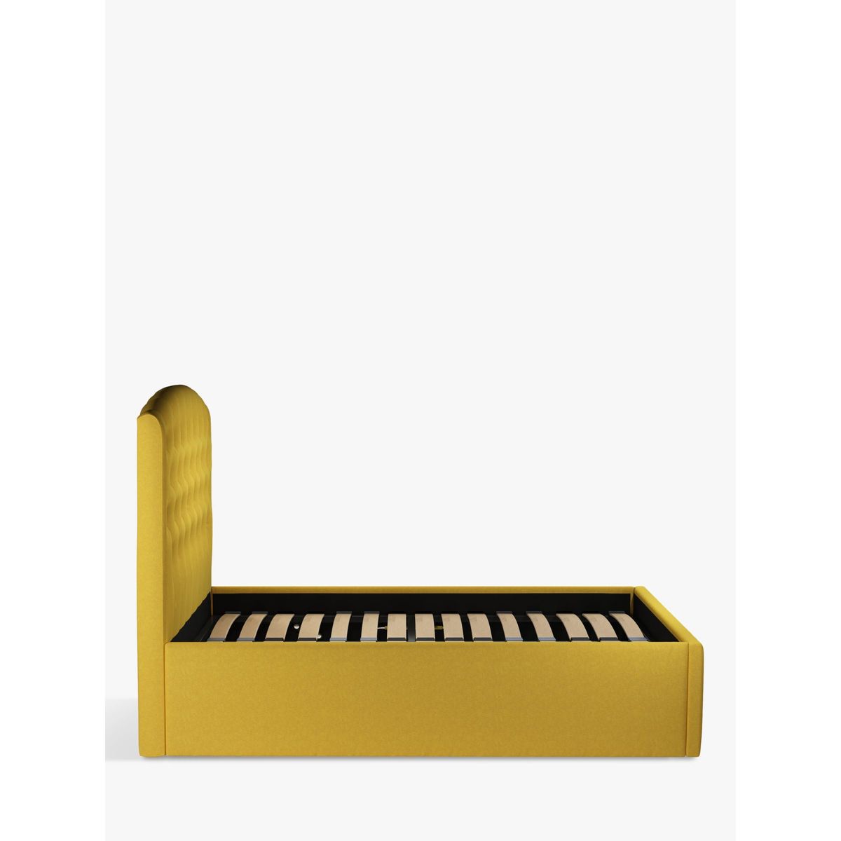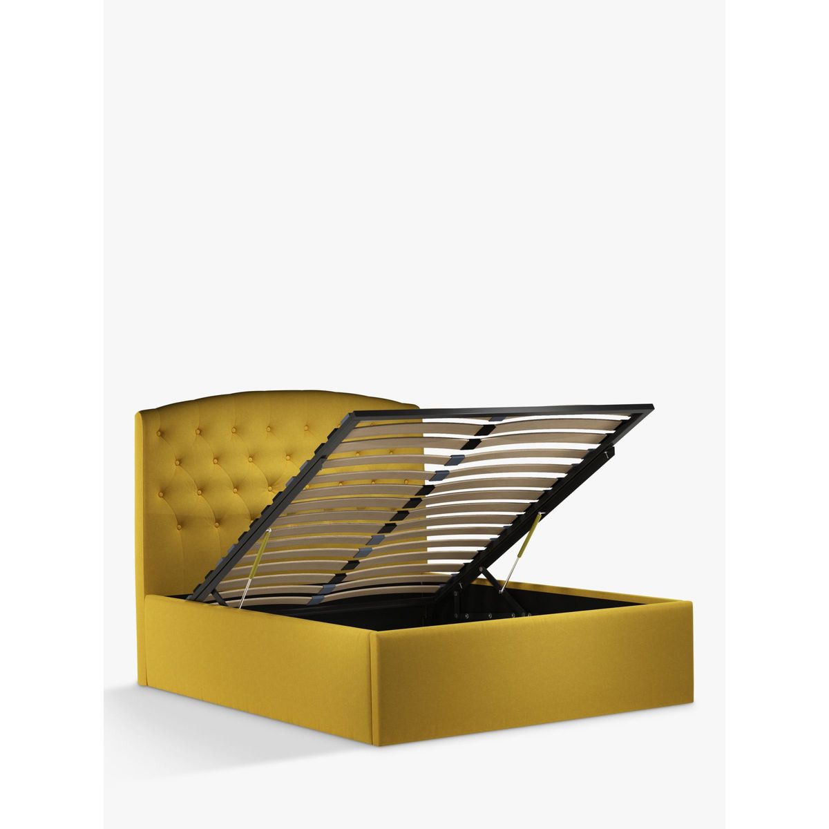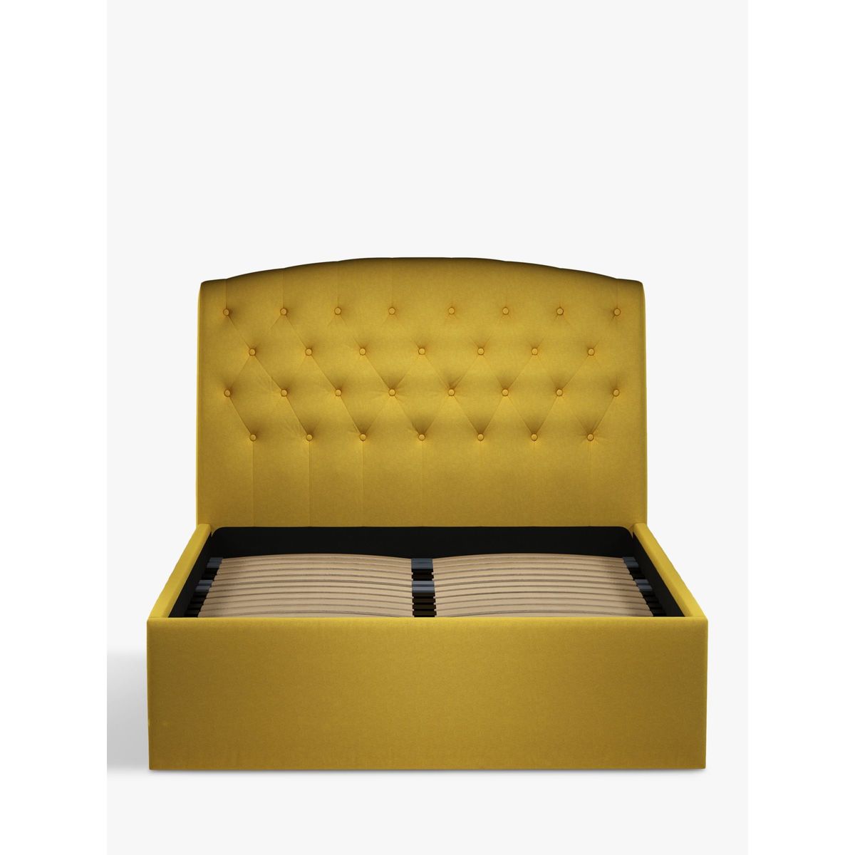 Our Rouen ottoman storage bed frame has a classic design that's enhanced with button detailing across the headboard. A handle and hydraulic arms facilitate an easy manual lift-up, revealing a functional and spacious storage space for spare linens. Sprung slats provide additional support for you and your mattress. Built with Smart Slats This bed frame is designed with wider slats at the shoulders, lumbar and feet. They provide maximum support for you and your mattress so that you experience perfect spinal alignment while you sleep. The standard slat caps are black so we have added grey slat caps to ensure that you know where to place the wider slats. Choose from one of our fabrics: Our Band A fabric, Topaz is woven to create a linen-effect feel Our Band A fabric, Saga is woven with man-made fibres, making it exceptionally durable and versatile Our Band B fabric, Erin has a velvet-style, chenille feel. It's woven with man-made fibres to create a beautifully soft yarn and can appear two-tone in different lights Our Band B fabric, Opulence is a soft and luxurious velvet-like fabric Our Band B fabric, Mole is a soft and cosy woven wool-blend. Piling and bobbling may occur naturally over time Our Band B fabric, Relaxed Linen is durable, resilient and versatile, woven from man-made and natural fibres Our Band C fabric, Aquaclean Harriet is made from a short, dense pile of velvet that has a soft, brushed finish. An Aquaclean treatment has been applied to this resilient fabric which means you can banish the majority of household stains with water. The treatment covers every fibre with an invisible coating so it doesn't need to be retreated or re-coated. It will naturally develop lines, scuffs and shading over time. Want to see it first? You may want to see and get a feel for the furniture before ordering. Pop into one of our shops to see the full range of colours and fabrics on offer. We'll be able to tell you where the range you'd like to view is on display.