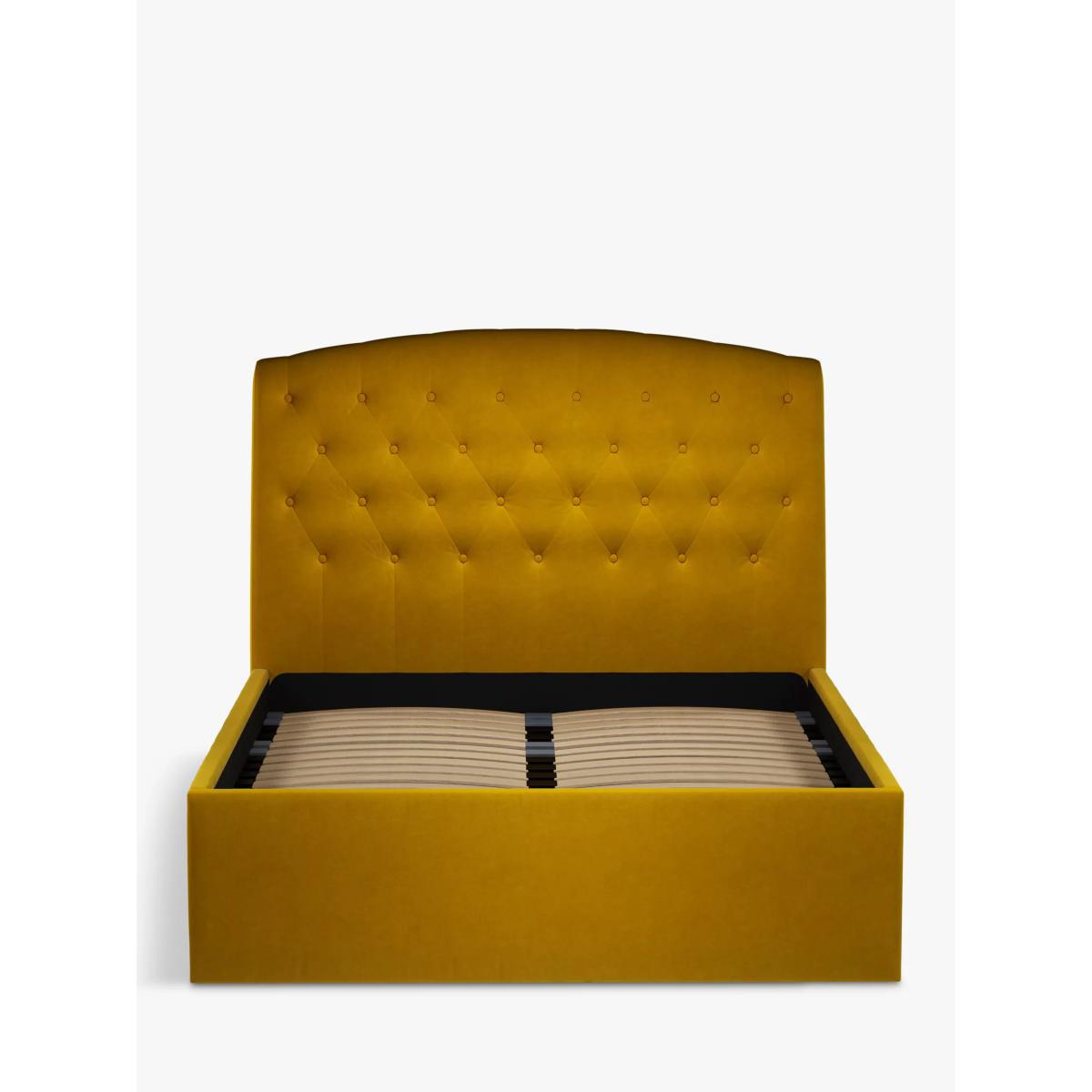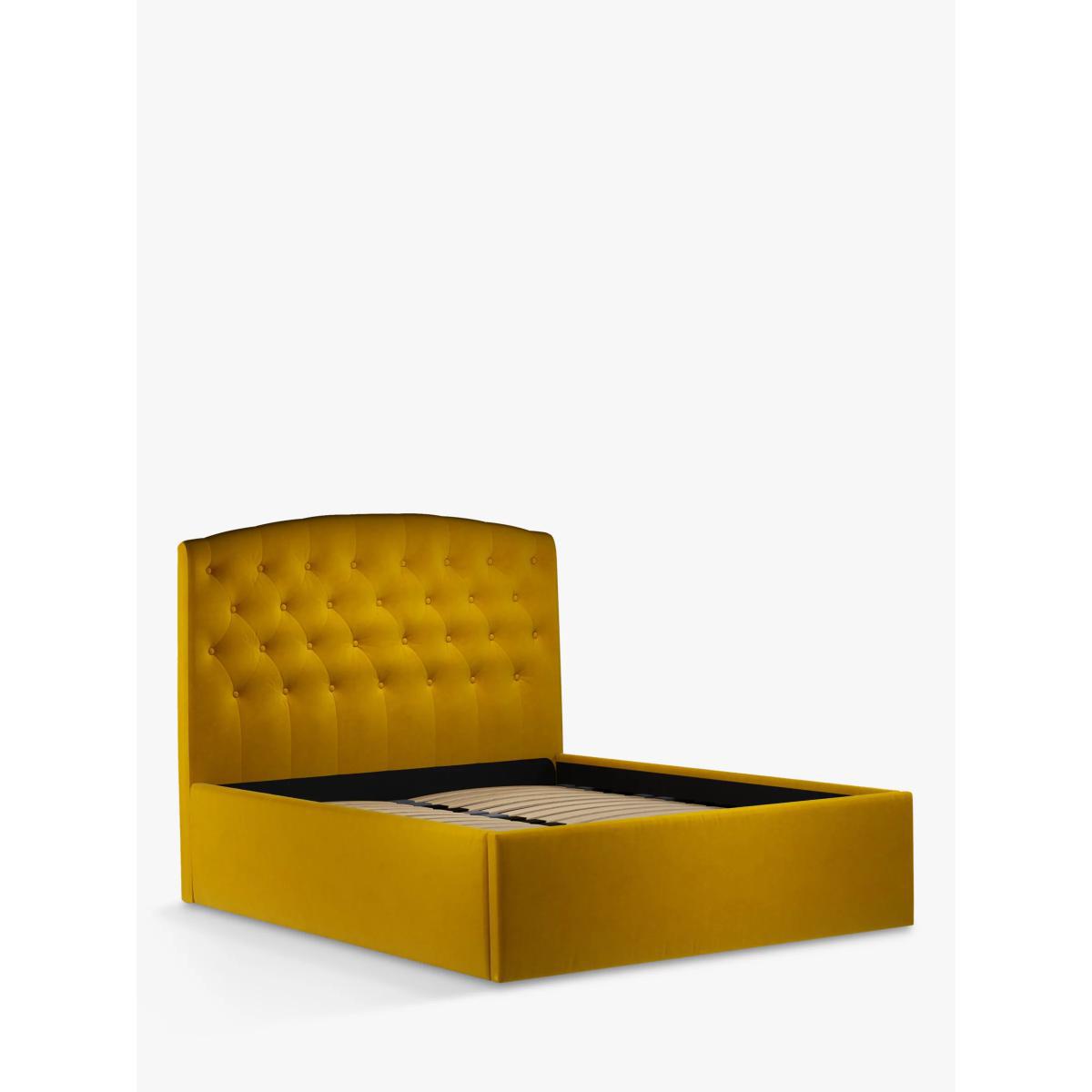 Our Rouen ottoman storage bed frame has a classic design that's enhanced with button detailing across the headboard. A handle and hydraulic arms facilitate an easy manual lift-up, revealing a functional and spacious storage space for spare linens. Sprung slats provide additional support for you and your mattress. Built with Smart Slats This bed frame is designed with wider slats at the shoulders, lumbar and feet. They provide maximum support for you and your mattress so that you experience perfect spinal alignment while you sleep. The standard slat caps are black so we have added grey slat caps to ensure that you know where to place the wider slats. Choose from one of our fabrics: Our Band A fabric, Topaz is woven to create a linen-effect feel Our Band A fabric, Saga is woven with man-made fibres, making it exceptionally durable and versatile Our Band B fabric, Erin has a velvet-style, chenille feel. It's woven with man-made fibres to create a beautifully soft yarn and can appear two-tone in different lights Our Band B fabric, Opulence is a soft and luxurious velvet-like fabric Our Band B fabric, Mole is a soft and cosy woven wool-blend. Piling and bobbling may occur naturally over time Our Band B fabric, Relaxed Linen is durable, resilient and versatile, woven from man-made and natural fibres Our Band C fabric, Aquaclean Harriet is made from a short, dense pile of velvet that has a soft, brushed finish. An Aquaclean treatment has been applied to this resilient fabric which means you can banish the majority of household stains with water. The treatment covers every fibre with an invisible coating so it doesn't need to be retreated or re-coated. It will naturally develop lines, scuffs and shading over time. Want to see it first? You may want to see and get a feel for the furniture before ordering. Pop into one of our shops to see the full range of colours and fabrics on offer. We'll be able to tell you where the range you'd like to view is on display.