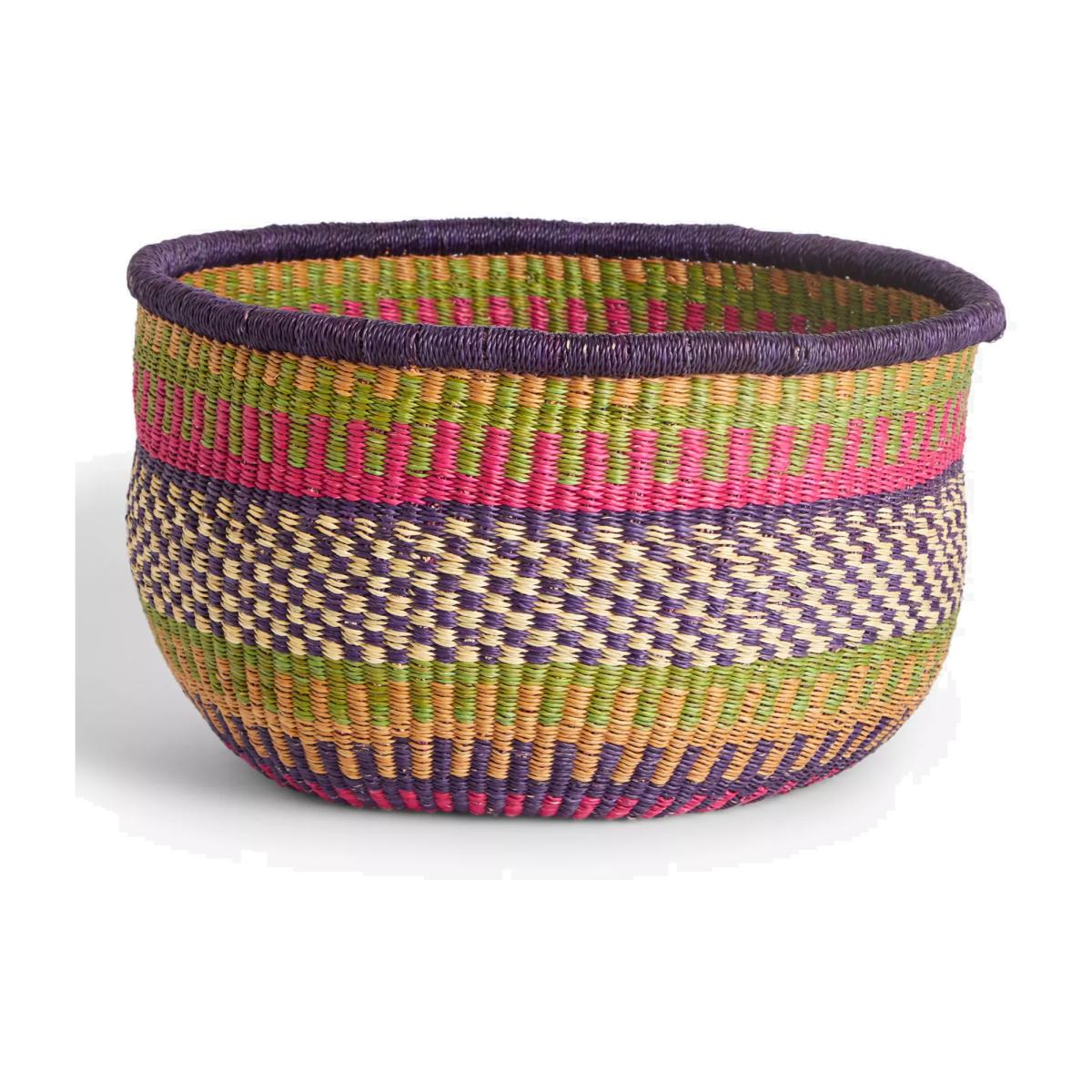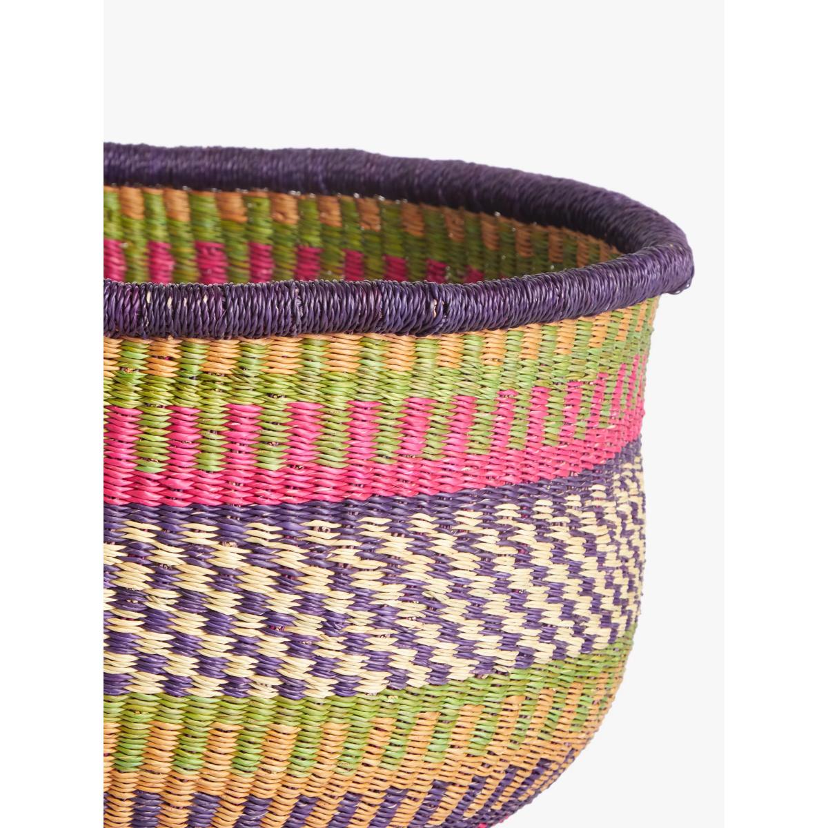 This roomy, round basket is woven from colourfully dyed elephant grass and goat leather. In the event that this basket loses its original shape owing to packing or other reasons, please follow the actions below to reshape it: Spray or sprinkle the affected parts of the basket with ordinary water Push out with your fist the sprayed areas, from inside the basket, to the original shape Leave the reshaped basket to dry