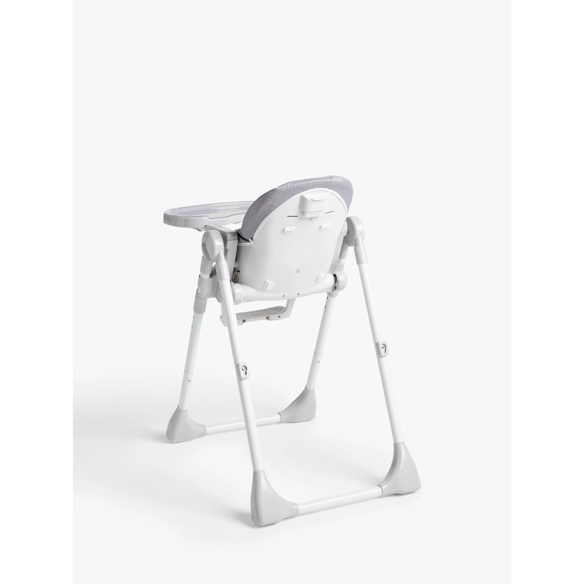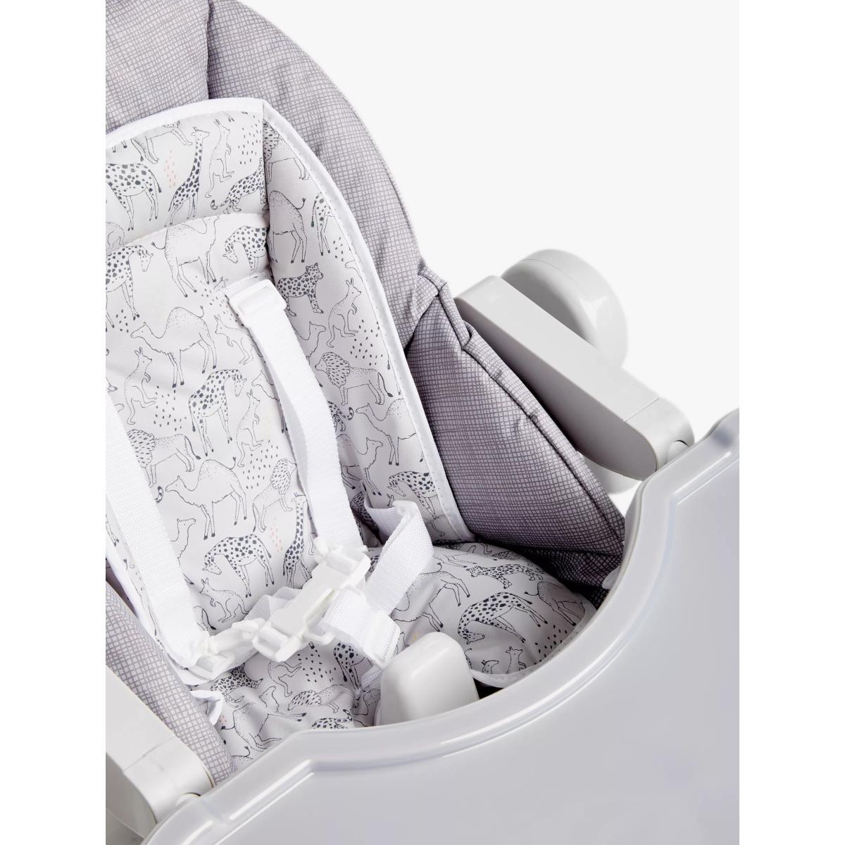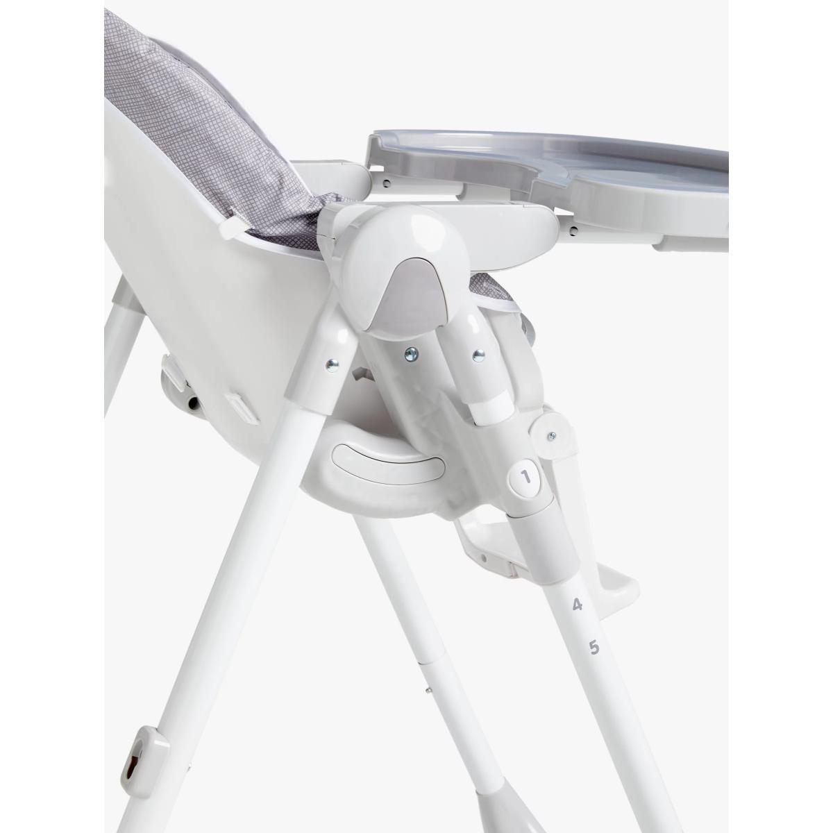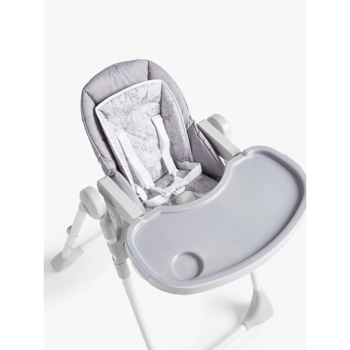 Our affordable highchair takes on more premium designs without the price tag. The solid metal structure and the optimised angle of the legs ensure stability for your child, for those convivial family meals. The chair has safety straps, making it easy to fasten and unfasten, while the lightly padded fabric provides more comfort. The chair has an easy-to-clean tray and a footrest with a colourful plastic support. The multi-functional design can be used as a dining chair or a recliner and as such, it's suitably versatile. When used as a recliner, the maximum weight is currently 9kg.
