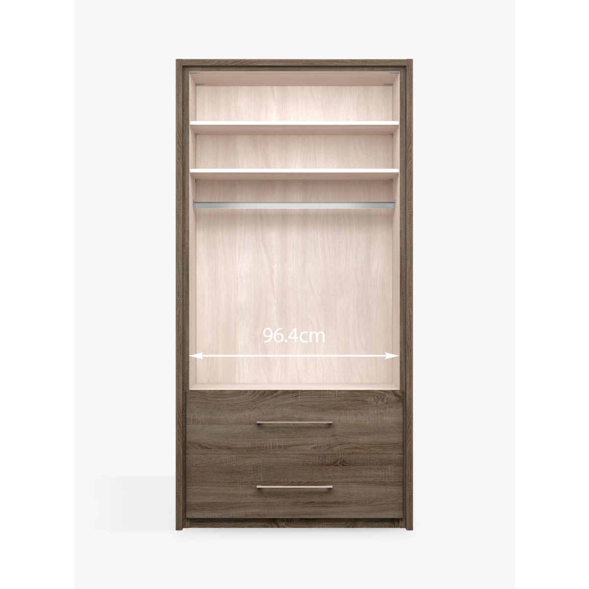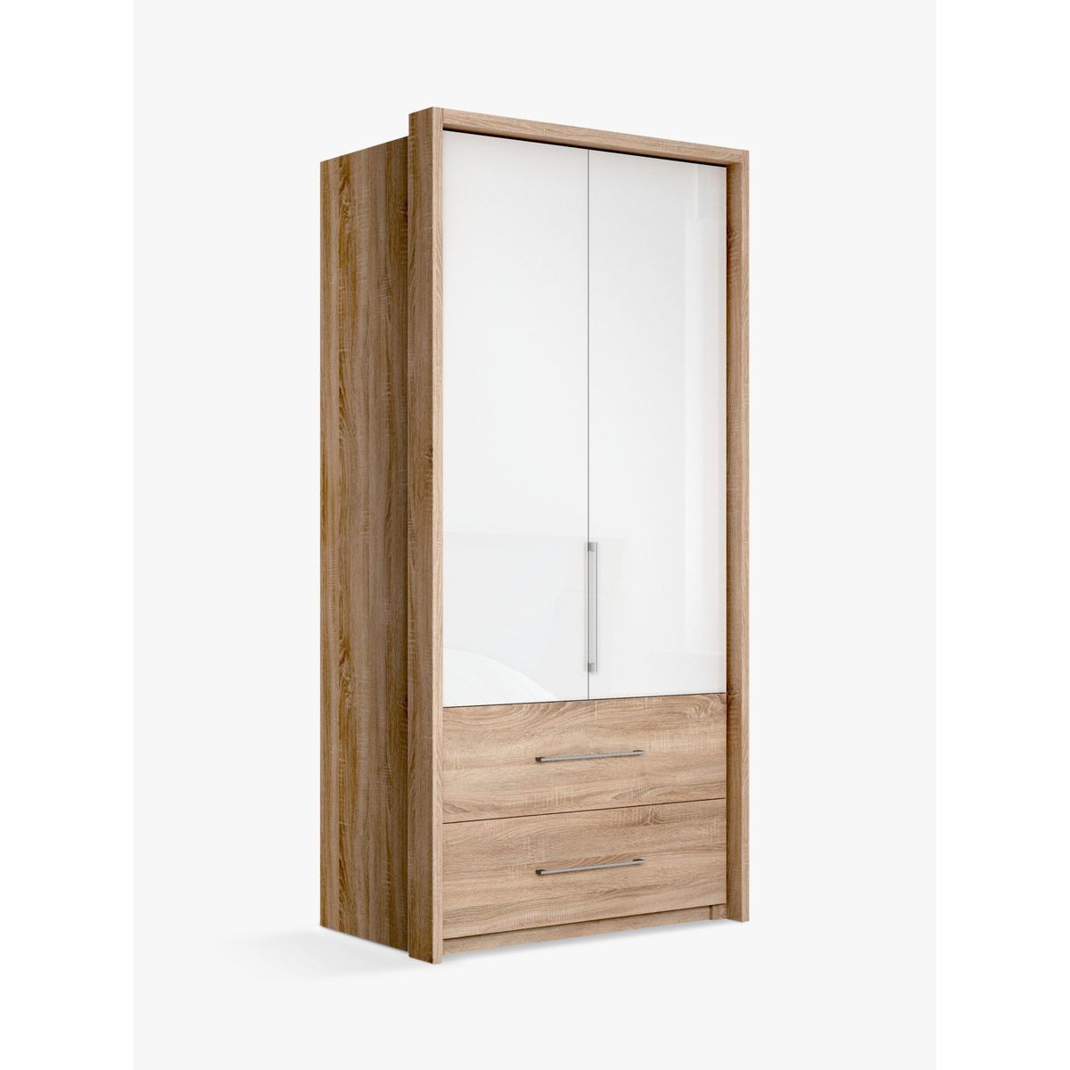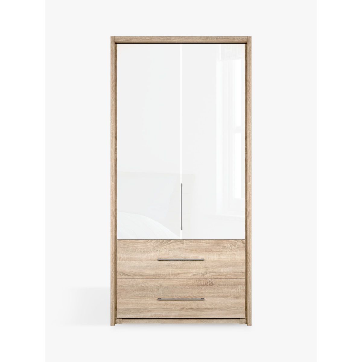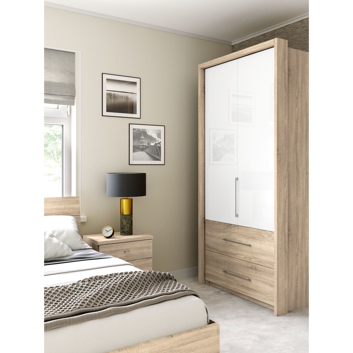 The sleek styling of this Satis wardrobe would look the part in any contemporary bedroom. This wardrobe is a stylish contrast of rustic wood effect and glass doors, helping to bring warmth and tactility to the design. Light Rustic Oak and Dark Rustic Oak wood frame finishes are paired with coloured glass for extra attractive detailing. All wardrobes have a light maple interior and come with 2 shelves and a hanging rail that are fully adjustable to your preference. Soft close hinged doors are fitted as standard. For extra storage, two pull-out drawers beneath the doors offer additional space for clothes, accessories and other belongings.