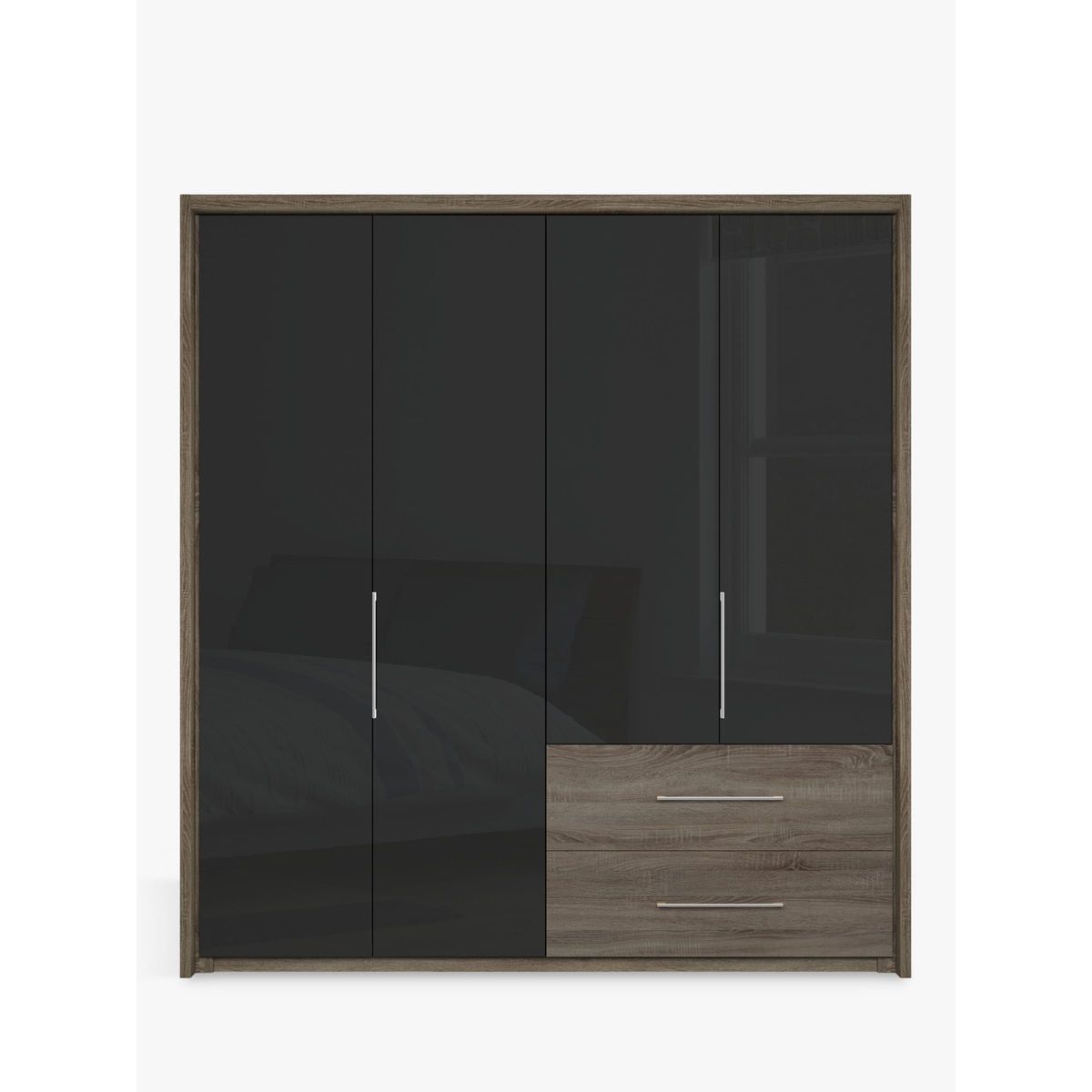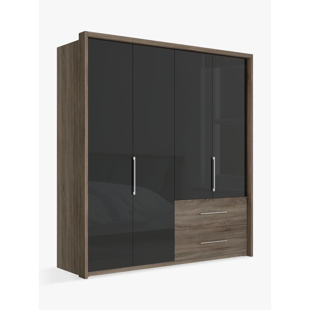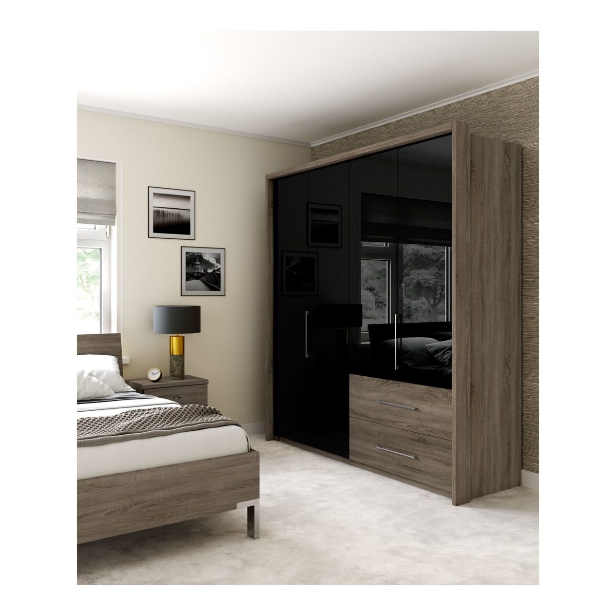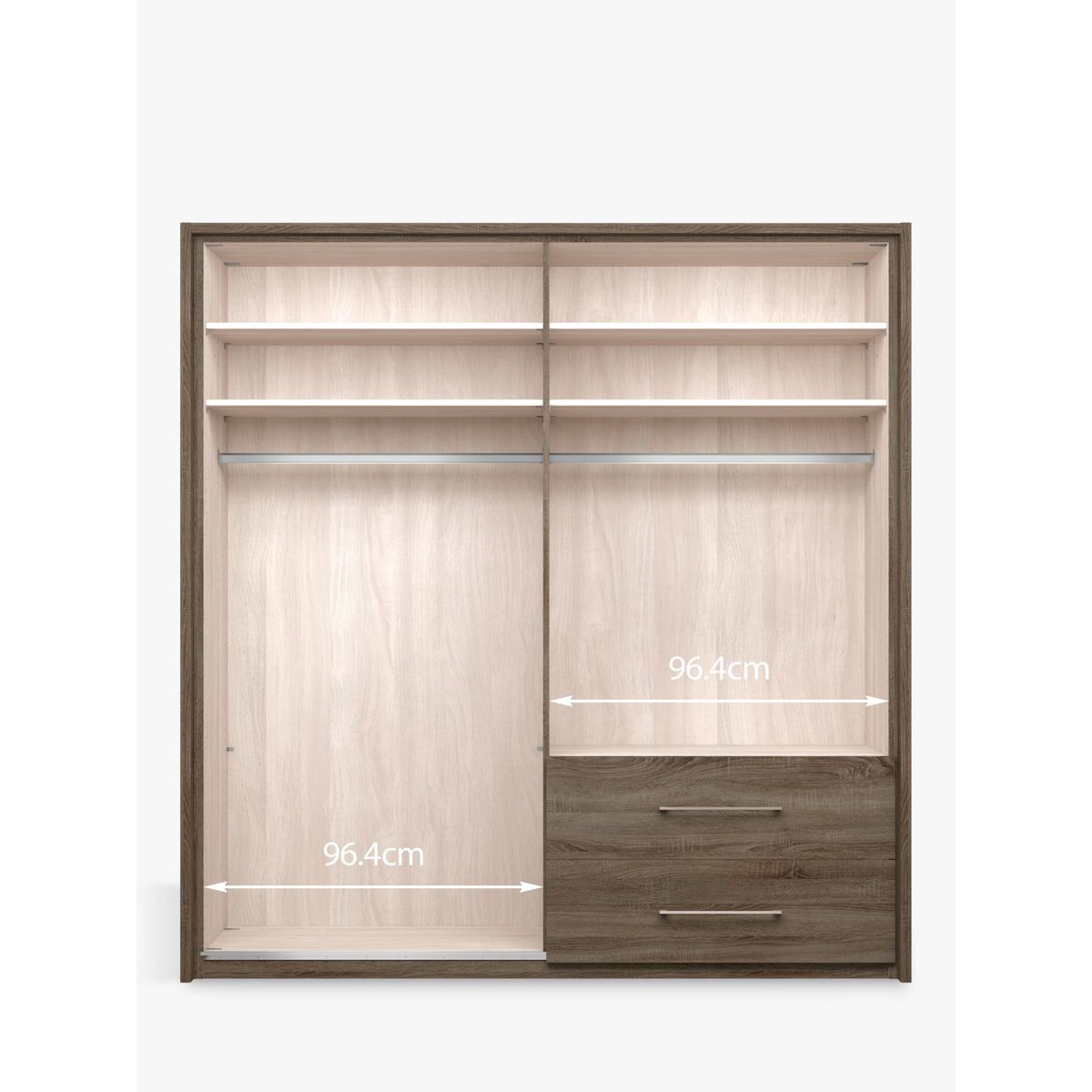 The sleek styling of this Satis wardrobe would look the part in any contemporary bedroom. This wardrobe is a stylish contrast of rustic wood effect and glass doors, helping to bring warmth and tactility to the design. Light Rustic Oak and Dark Rustic Oak wood frame finishes are paired with coloured glass for extra attractive detailing. All wardrobes have a light maple interior and each compartment comes with 2 shelves and a hanging rail, all fully adjustable to your preference. Soft close hinged doors are fitted as standard. For extra storage, two pull-out drawers beneath the doors offer additional space for clothes, accessories and other belongings.