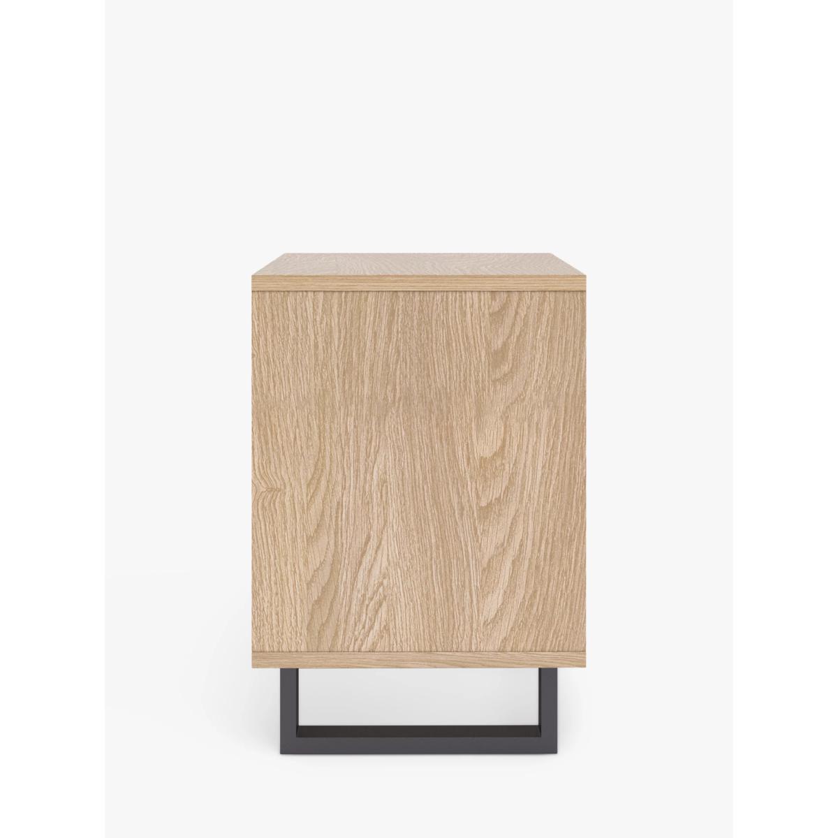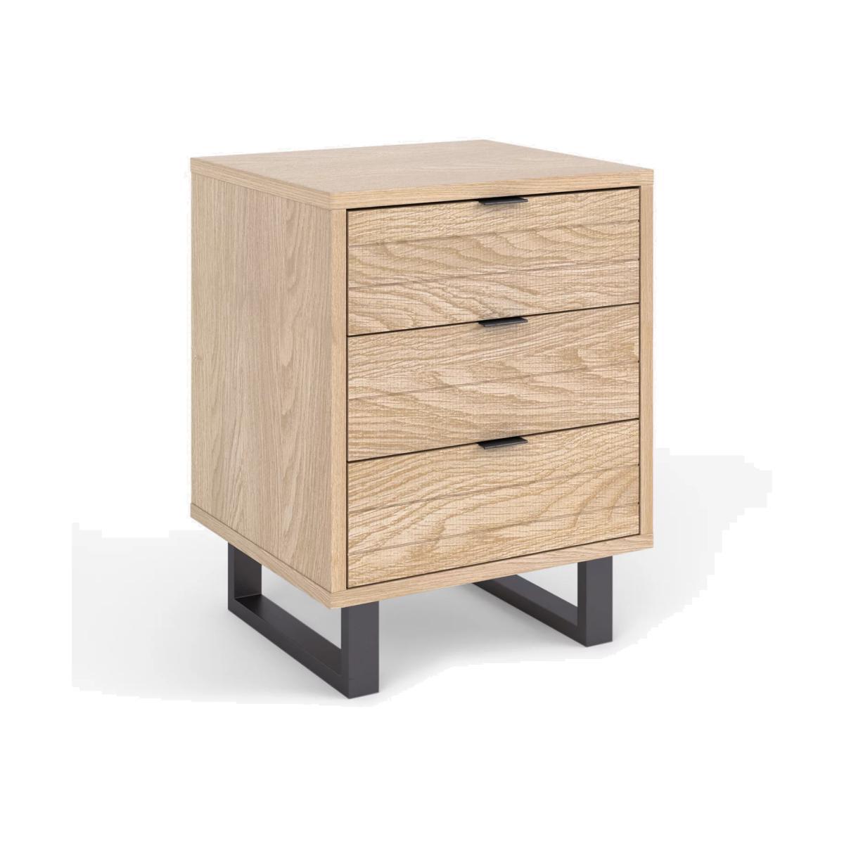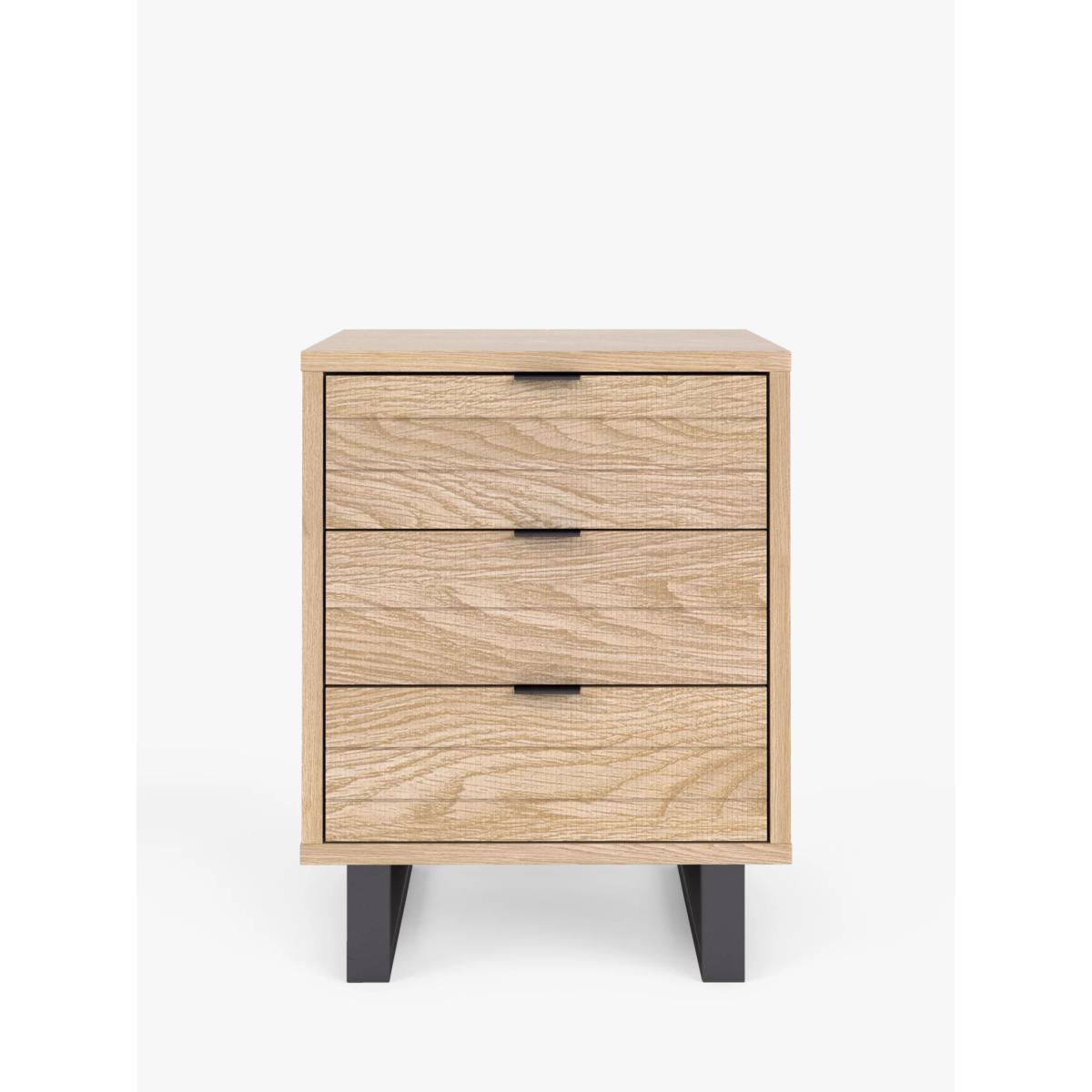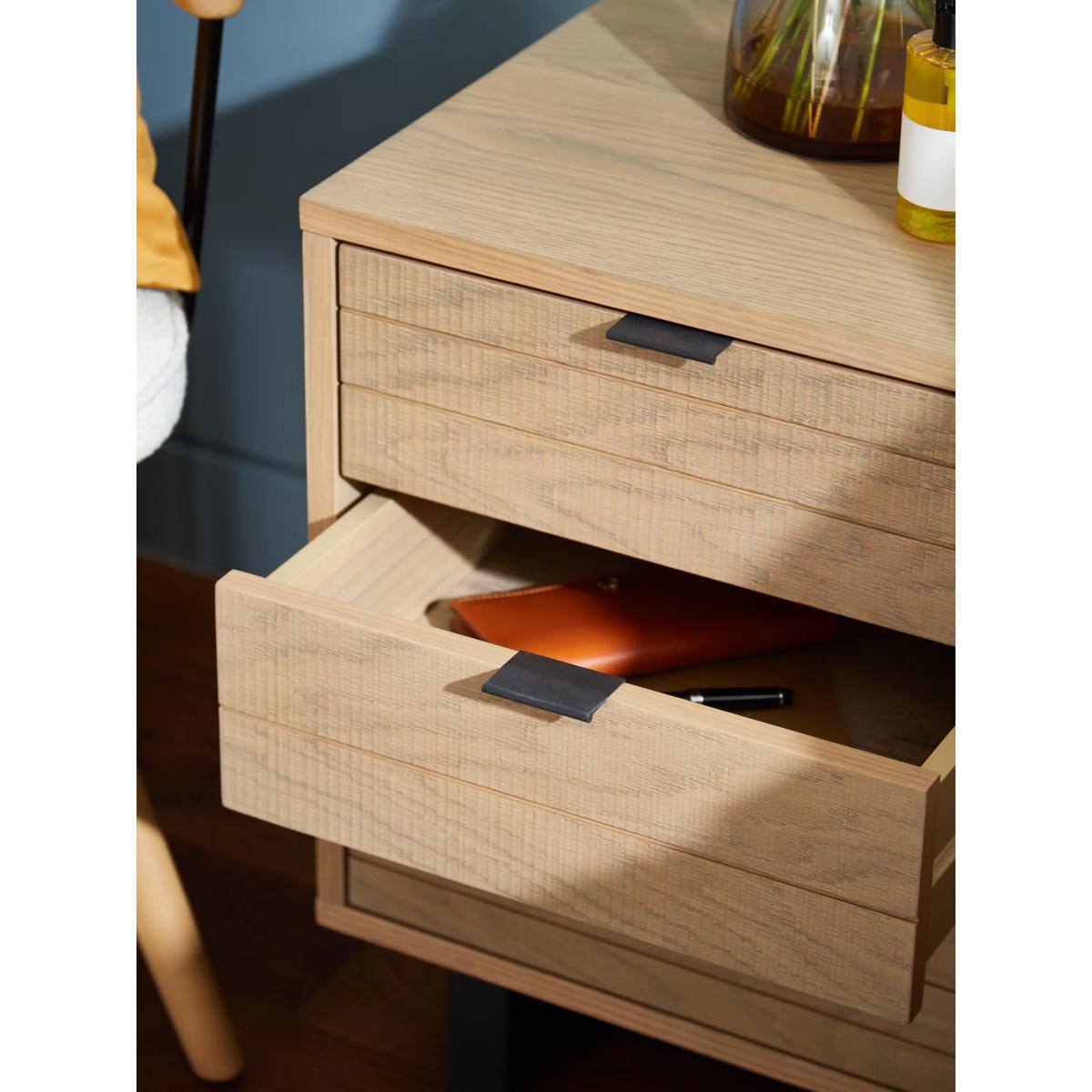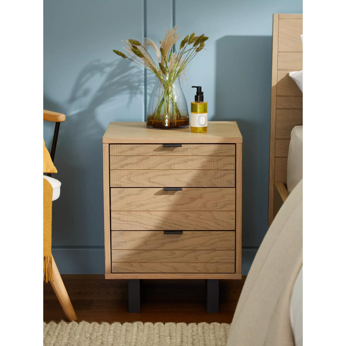 We hear you: storage is essential next to your bedside. That's why we've made this robust bedside table with three spacious drawers. It's built from a trusty combination of solid oak and MDF and its design celebrates the best of Scandi and industrial styles, with a fusion seen through its clean-lined, minimalist profile and contrasting welded metal legs. We've also given the front of the drawers a band sawn finish which adds depth and texture. Style it with a cool table lamp and that book you can't put down, then it will really look the part in your bedroom. Want to see it first? You may want to see and get a feel for the furniture in one of our shops before ordering. We'll be able to tell you where the range you'd like to view is on display.