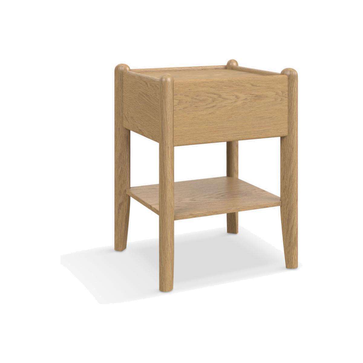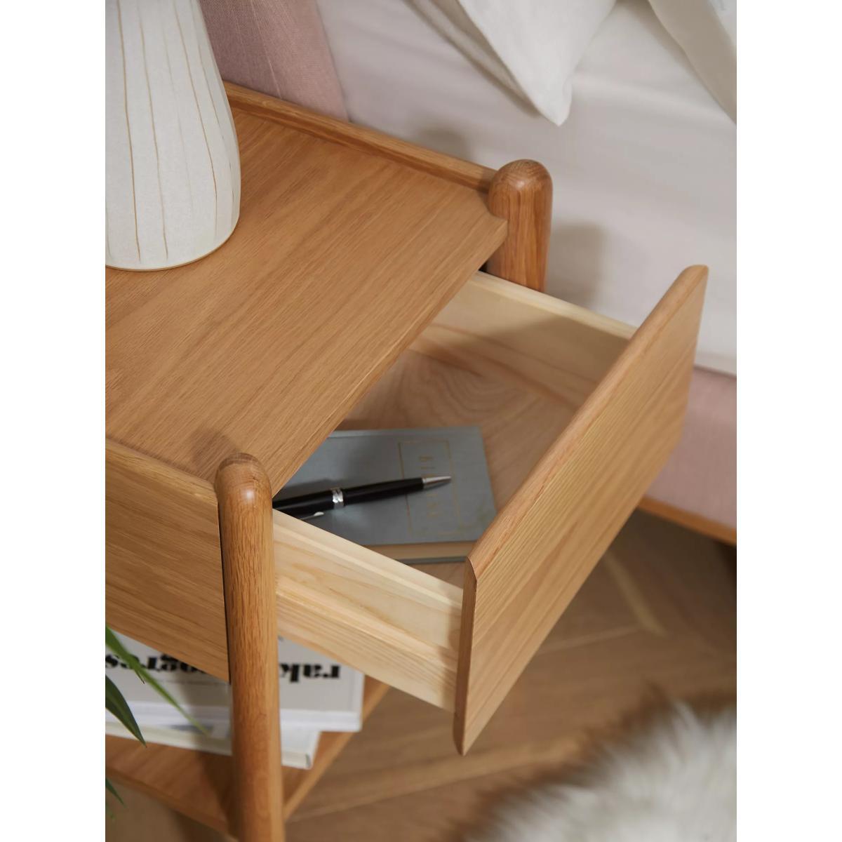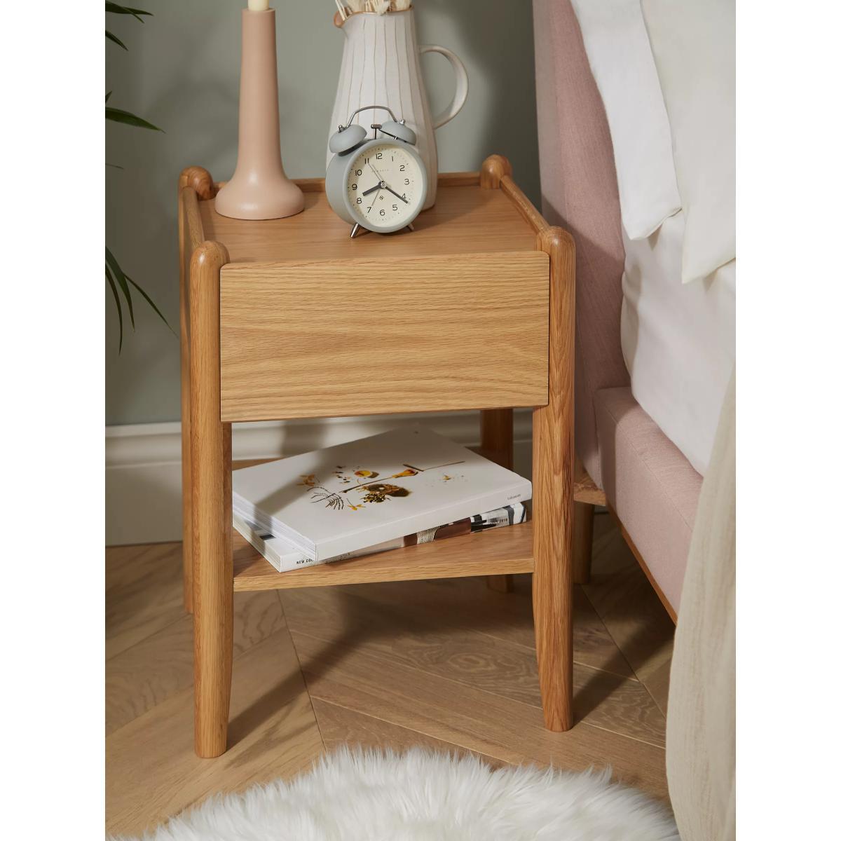 Our Scandi range of bedroom furniture is a celebration of natural and minimalist design, built from solid oak and oak veneers. This bedside table is brilliant if space is limited. With a single storage drawer and lower shelf, it's just the right size for your bedside essentials. Its rounded posts, tapered legs and sleek, handle-less drawer all honour Scandi design principles, so it's perfect for keeping your bedroom a calm, uncluttered and simple space. Want to see it first? You may want to see and get a feel for the furniture in one of our shops before ordering. We'll be able to tell you where the range you'd like to view is on display.