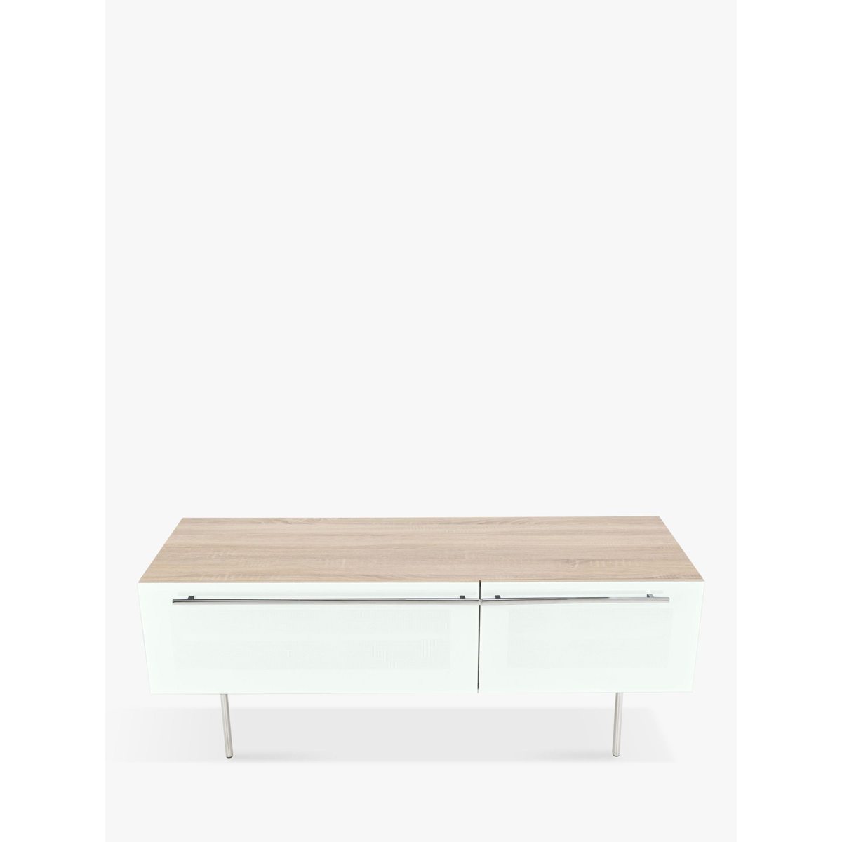 This elegant TV stand is part of John Lewis & Partners' Scandi collection. Exuding the Scandinavian design tenets of clean shapes, simple looks, functionality and value, the Scandi II TV Stand is a slick addition to any room and a practical base for all your home entertainment equipment. The exterior features a high-quality oak effect and polished stainless steel handles and legs. Two sets of doors are included for your choice, in stylish steel and oyster effect, with appealing dampened drop-down operation. A further choice of door colour options are available (sold separately). You can even get multiple doors then mix and match the colours to your taste, giving you further creative license over your living room. Holding TVs of up to 60" and having storage space for multiple AV units, the Scandi II features four internal compartments, convertible to two large storage areas by removing the shelves. Intelligent engineering elements like the remote/infrared friendly glass doors and cable management holes will help you achieve the minimal Scandi look. Supporting a maximum TV weight of 50kg it's a supremely stylish way to display your TV, as well as housing all your entertainment tech, media such as DVDs and Blu-rays, and accessories. Any maximum TV size quoted is a recommendation only and the exact dimensions of the TV's pedestal/feet should be checked to ensure it fits prior to purchase.