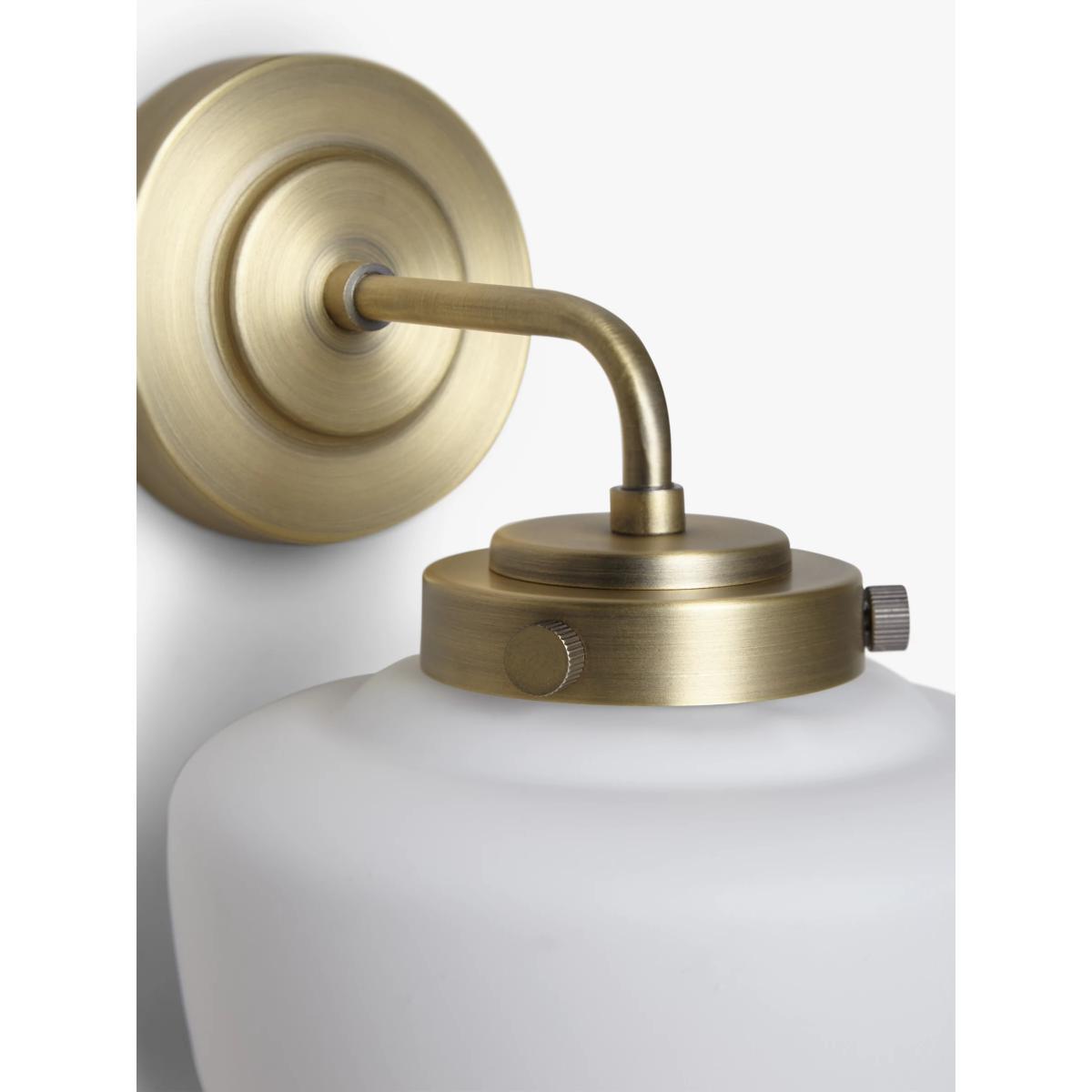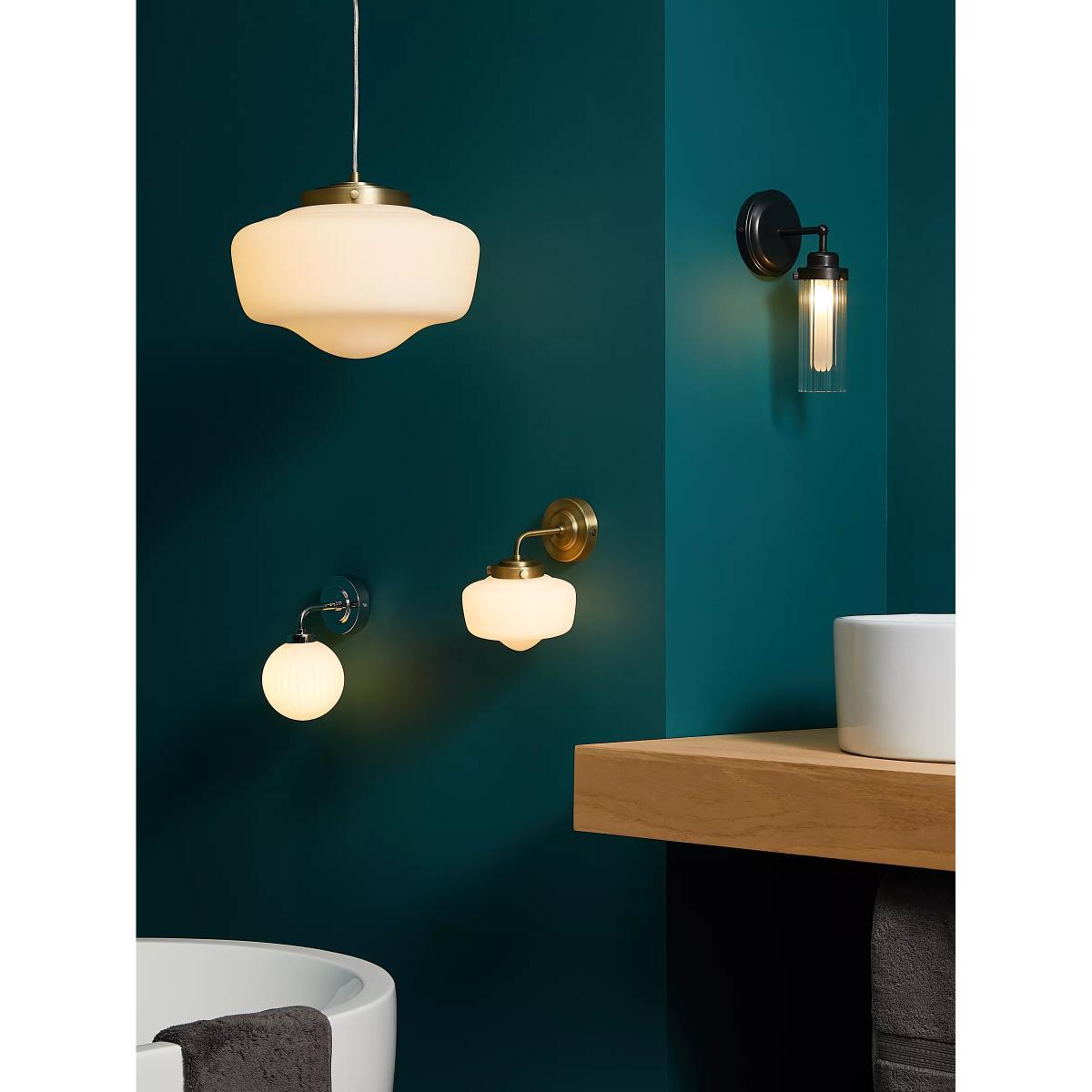 The design for this single-arm wall light fuses an industrial style with a hint of subtle of Art Deco. We've made it with an opal glass shade and an antique-finished wall plate. It's also IP44 rated and suitable for installation in bathrooms. Enjoy a warm glow of light when it's switched on.