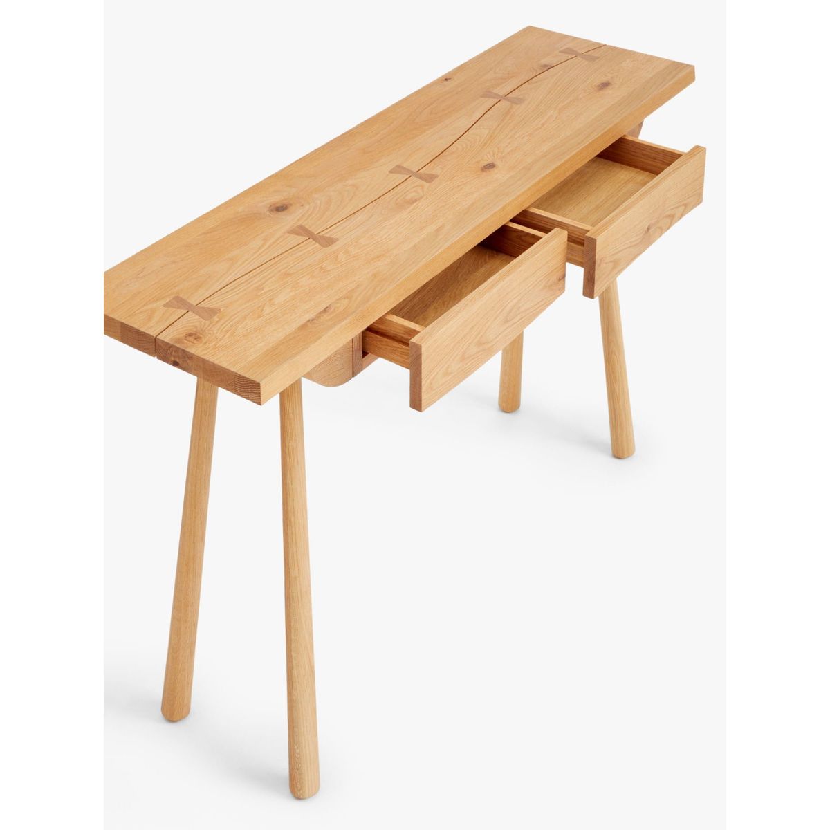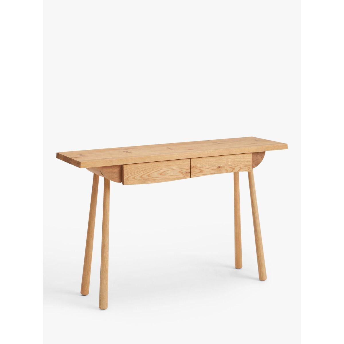 With clean lines and soft curves, our Seam console table is a considered storage option for your modern home. Made from hard-wearing solid oak, its design fuses minimalist Scandi appeal with a Japanese-inspired edge, showcased through the relaxed style of the tapered legs. The surface top is made from two planks of solid oak, joined together with robust dovetail joints to create a serpentine seam in the centre. Thanks to its natural construction, no two tables will be exactly the same as the grains and distinctive qualities of the oak gives each piece a unique feel. Two drawers provide a practical storage space. Want to see it first?. You may want to see and get a feel for the furniture in one of our shops before ordering. If you do plan on doing this we recommend giving us a call on 03452 661805 as not all our ranges are on display in our shops. We'll be able to tell you where the range you'd like to view is on display.