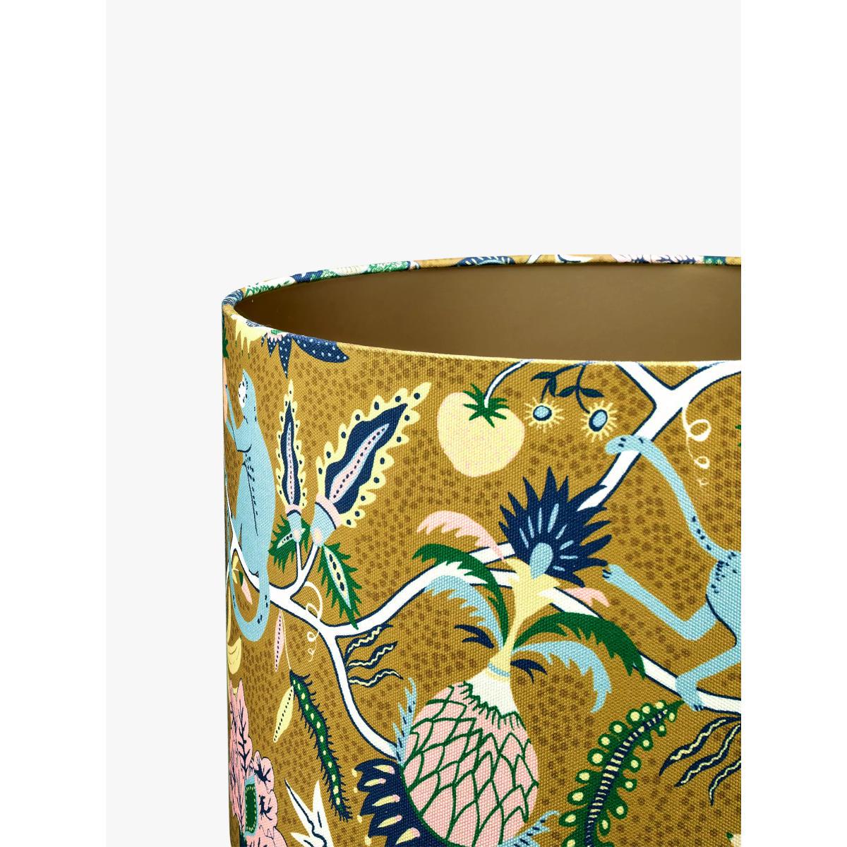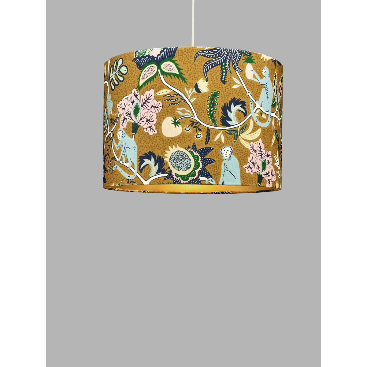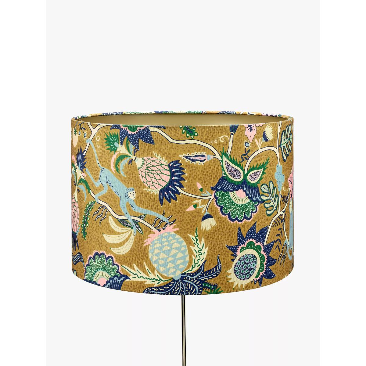 We've designed our Seoni lampshade to give your room a real focal point. Its design features vibrant colours and a playful monkey print woven into the fabric, and it has a paper-card lining in a contrasting colour to enhance a warm glow of light. Thanks to a reversible gimble, you can team it with a lamp base or ceiling light fitting. Good to know Our straight-sided, or drum lampshades are well-paired with modern lamp bases, while tapered lampshades work well with classic style bases. You can shop our range of lamp bases